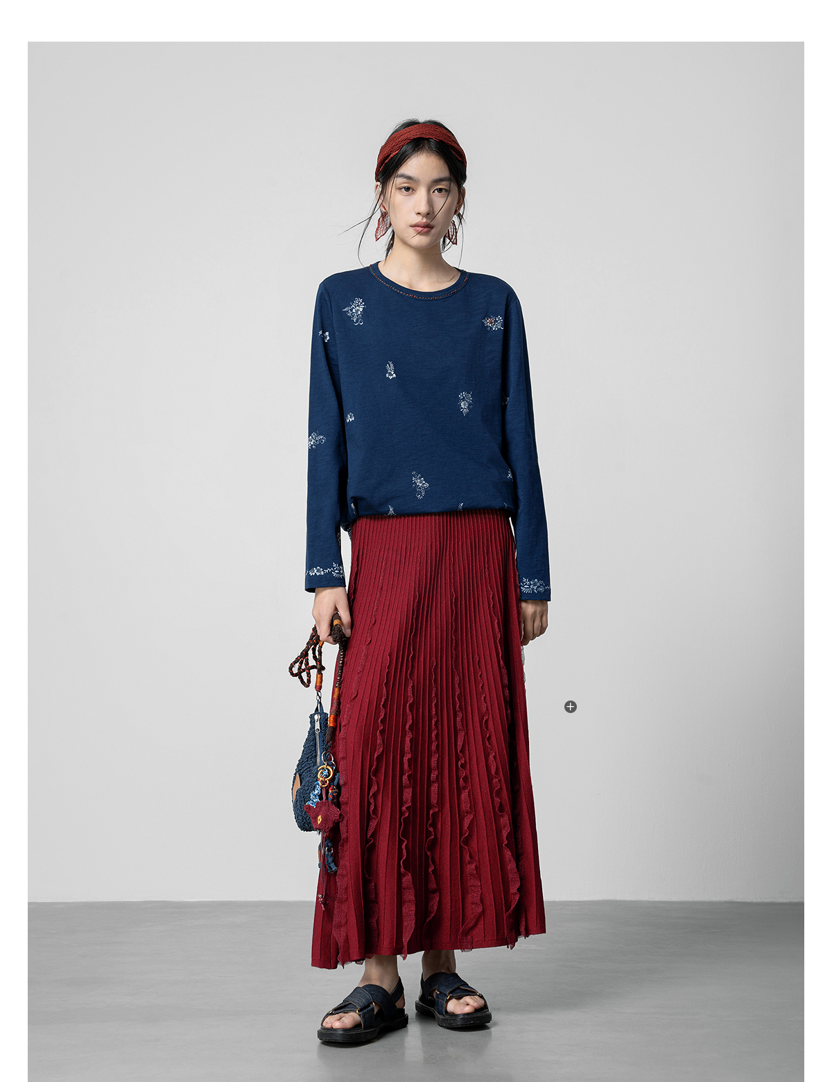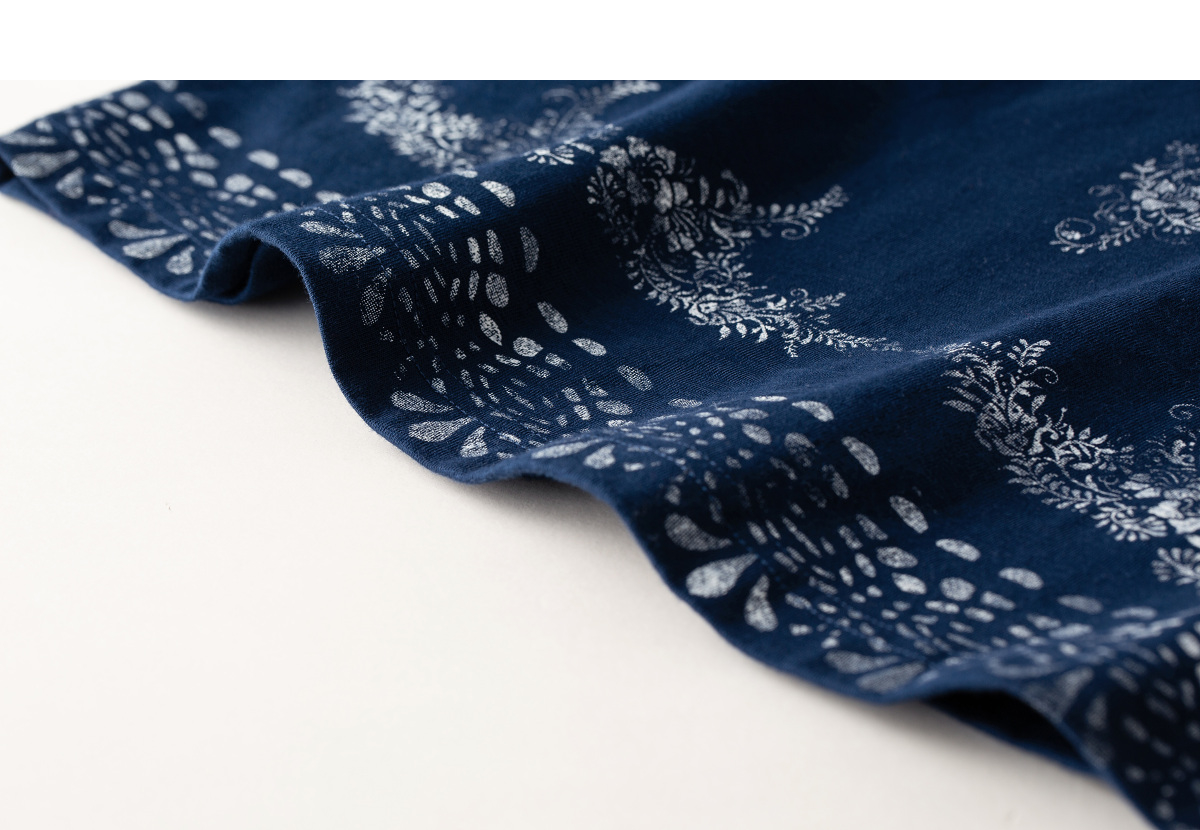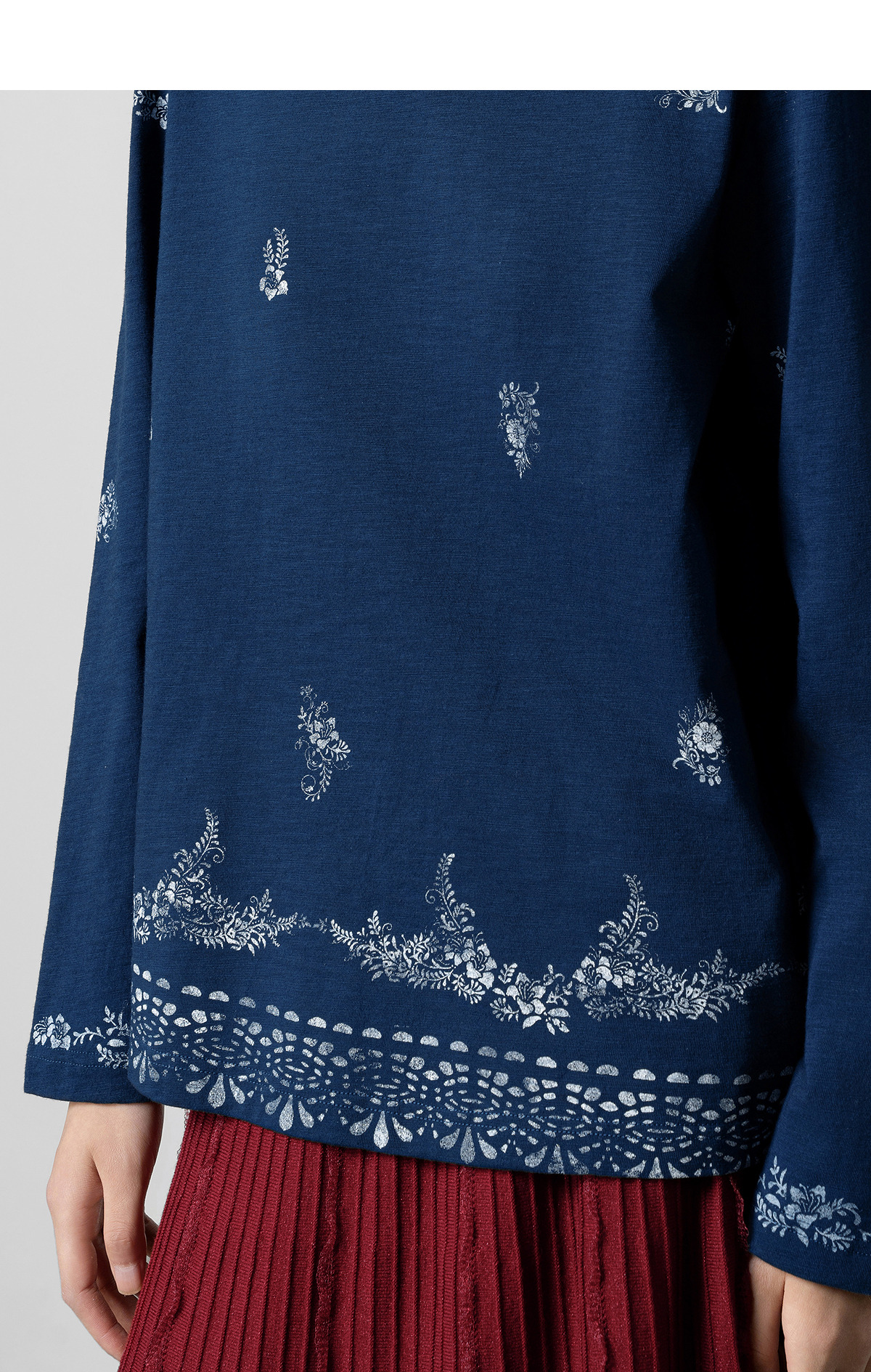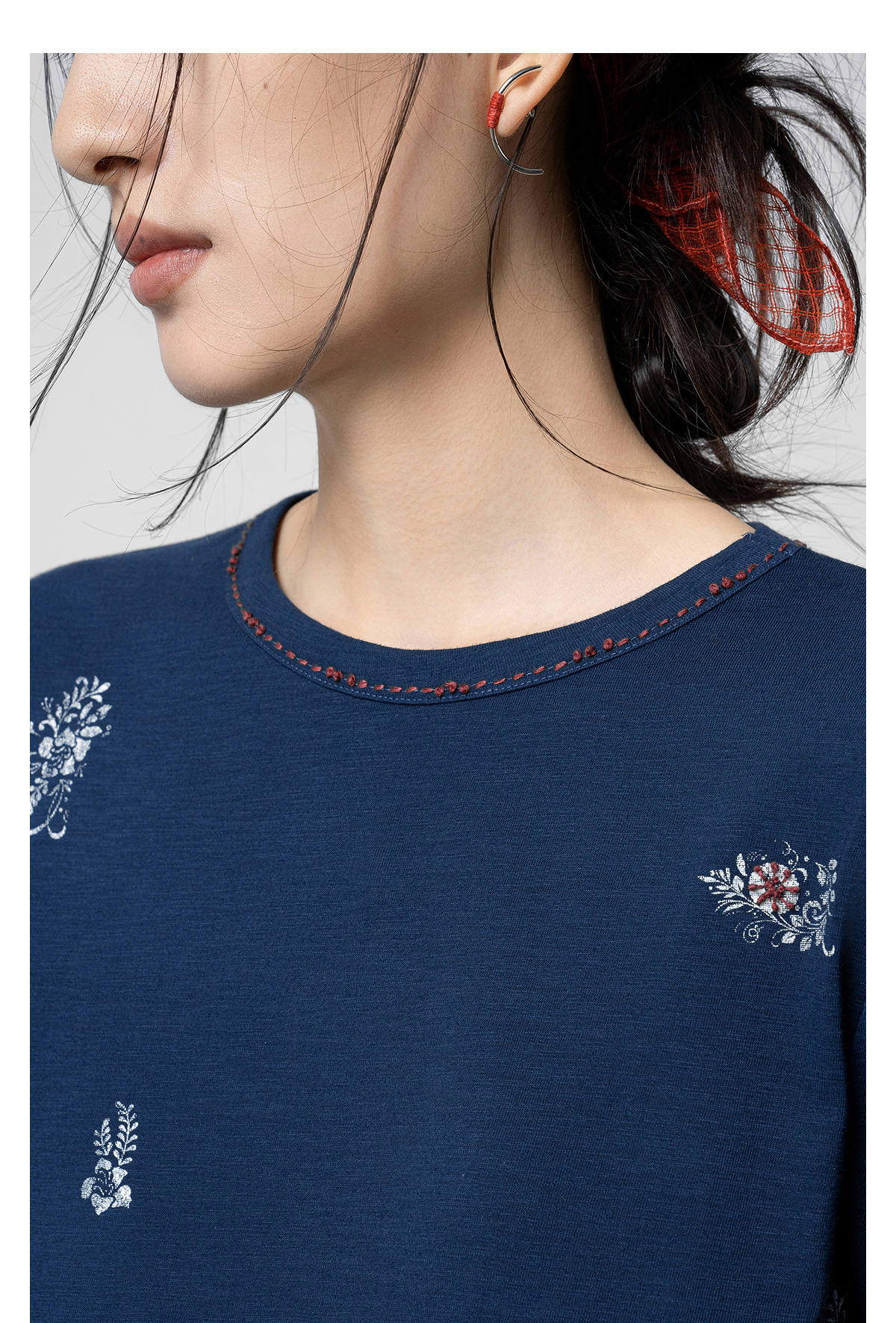 【林栖设计小店】手工打籽|纯棉藏青色优雅印花2026春新款复古长袖T恤1961159