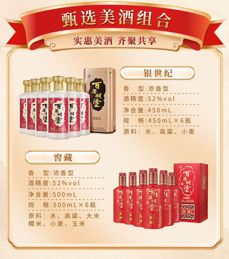 【高度组合装】百年糊涂浓香型白酒52度银世纪450ML*6瓶+52度窖藏500ML*6瓶高品质粮食酒