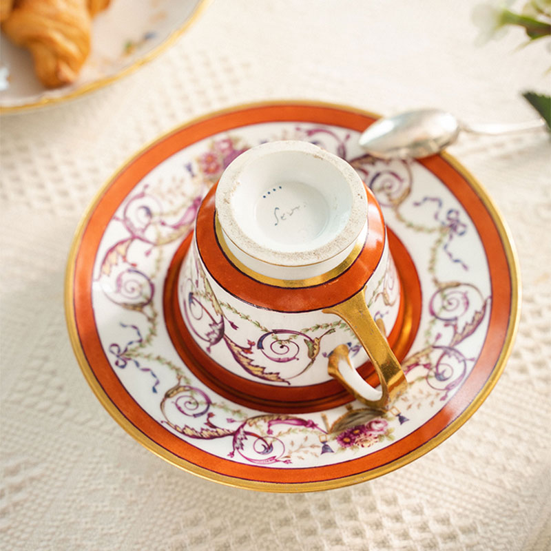 【已售】独角鹿西洋古董 19世纪法国御窑塞弗尔出品东方风格花纹手绘描金装饰花卉主题咖啡杯碟一套