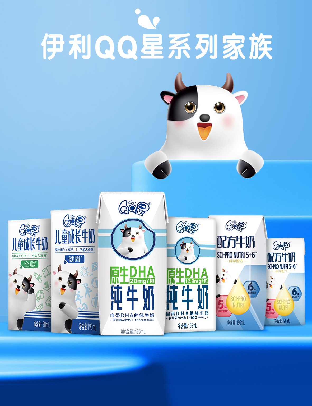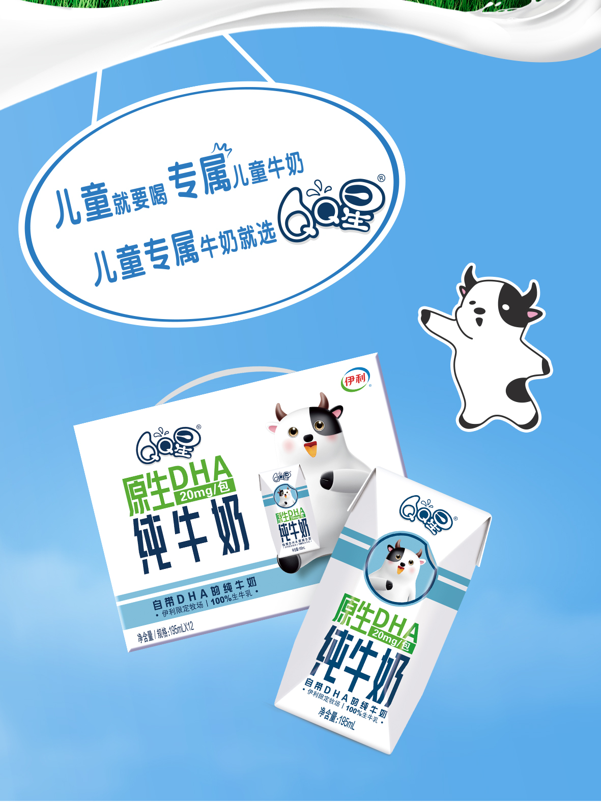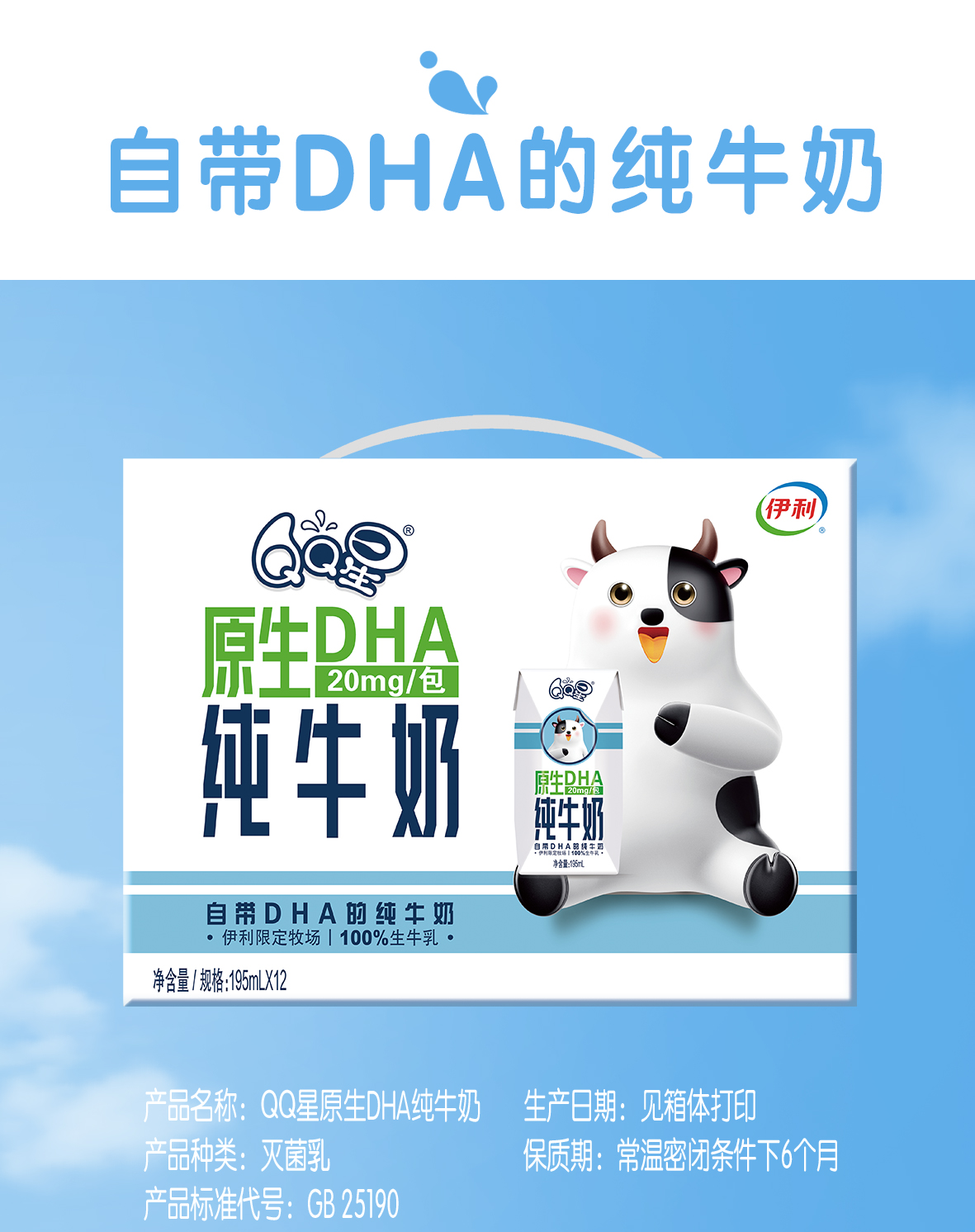 伊利QQ星原生DHA纯牛奶195ml*12盒