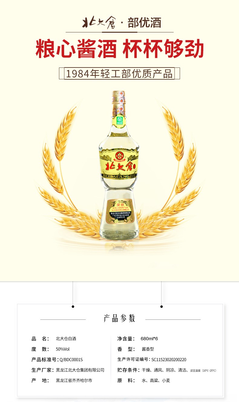 北大仓 大大部优 50度 酱香型白酒 纯粮酿造 680ml*6瓶 整箱装
