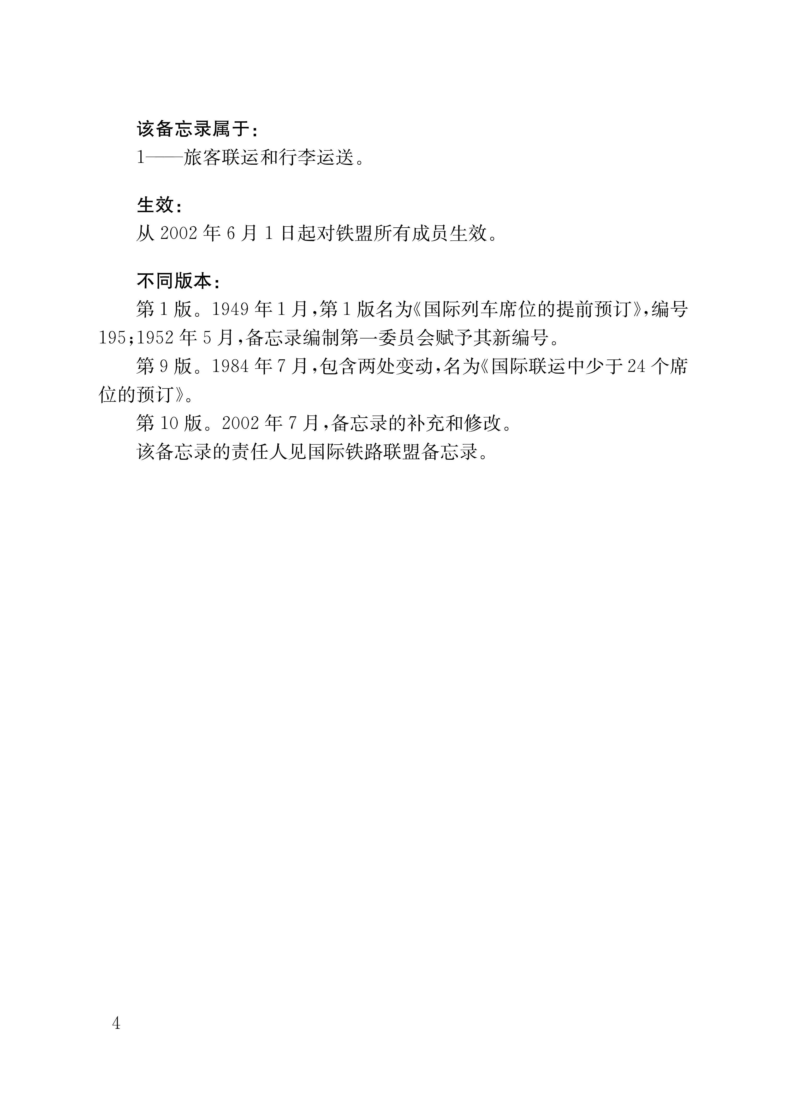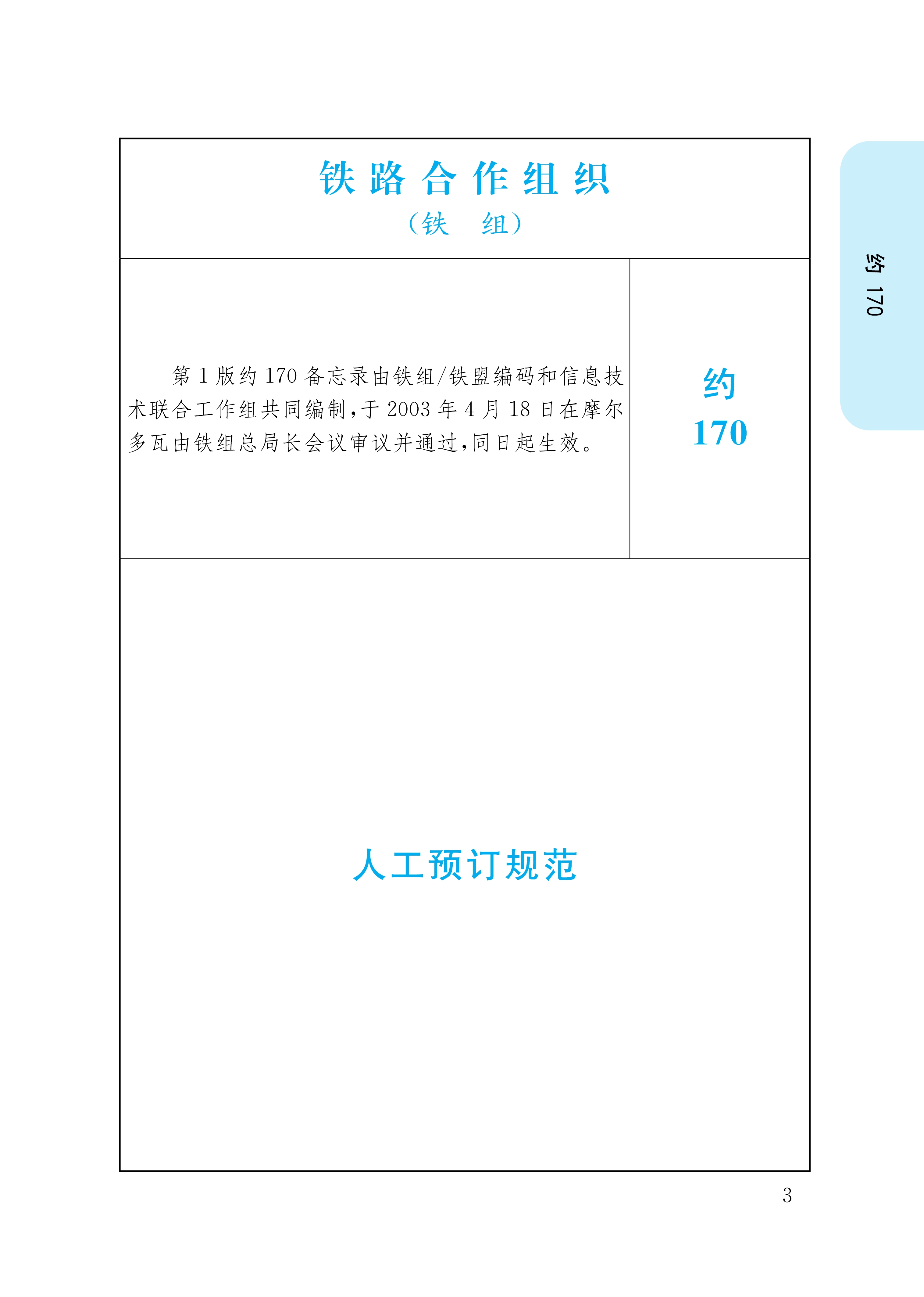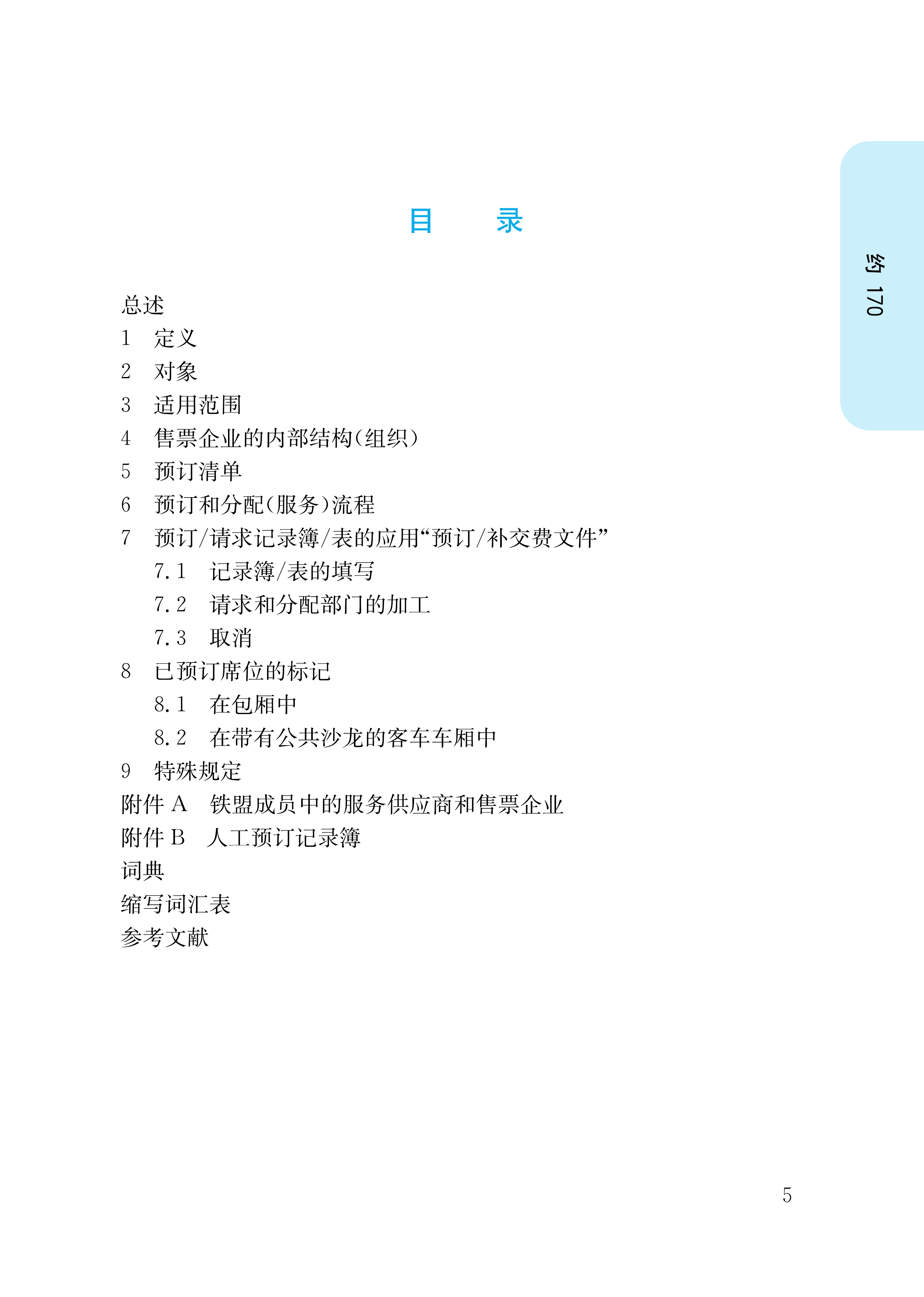 本次出版的《铁路合作组织国际旅客联运备忘录汇编》系列丛书涵盖了上述25个备忘录,并根据各备忘录内容将其划分为服务、售票、信息和客车四部分,可作为国际联运研究领域的参考资料,也可供从业人员在工作时开拓思路使用。本书为第二部分:售票,包括6个备忘录,其中建议性备忘录1个,即建914,由铁组第五专门委员会预订临时工作组制定;约束性备忘录4份,其中约170、约171、约172由铁组铁盟编码和信息技术联合工作组制定,约361由铁盟制定;第120号由铁盟制定,未注明其为约束性还是建议性。建914号备忘录旨在规范铁组成员路电子订票和售票的秩序,铁盟第120号备忘录定义了监察机构的业务及其检查范围,约170号备忘录制定了人工预订规范,约171号备忘录明确了编制预订清单的规定,约172对利用Еxpress和ППУЗ自动管理系统办理的电子乘车票据的复合表单进行了规定,约361明确了客运、信息技术、内部审计、财务及其他相关部门实施国际旅客联运时的收益保障措施。