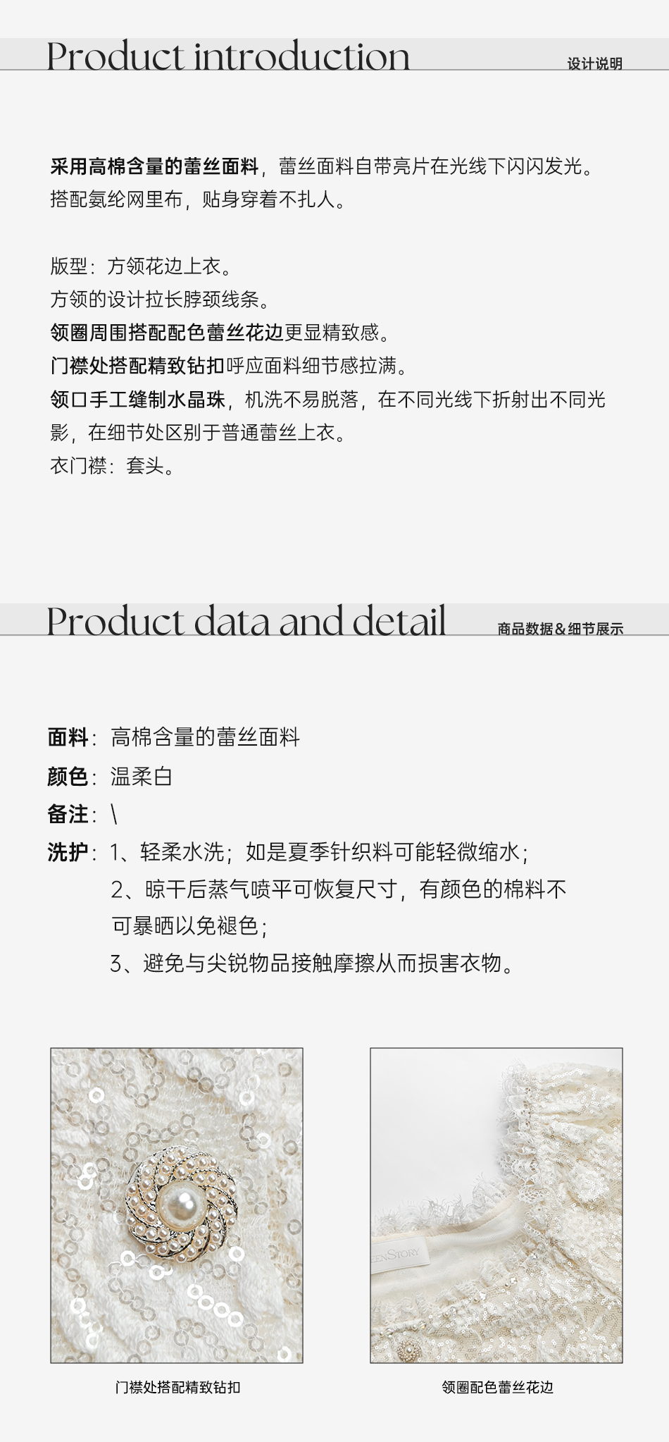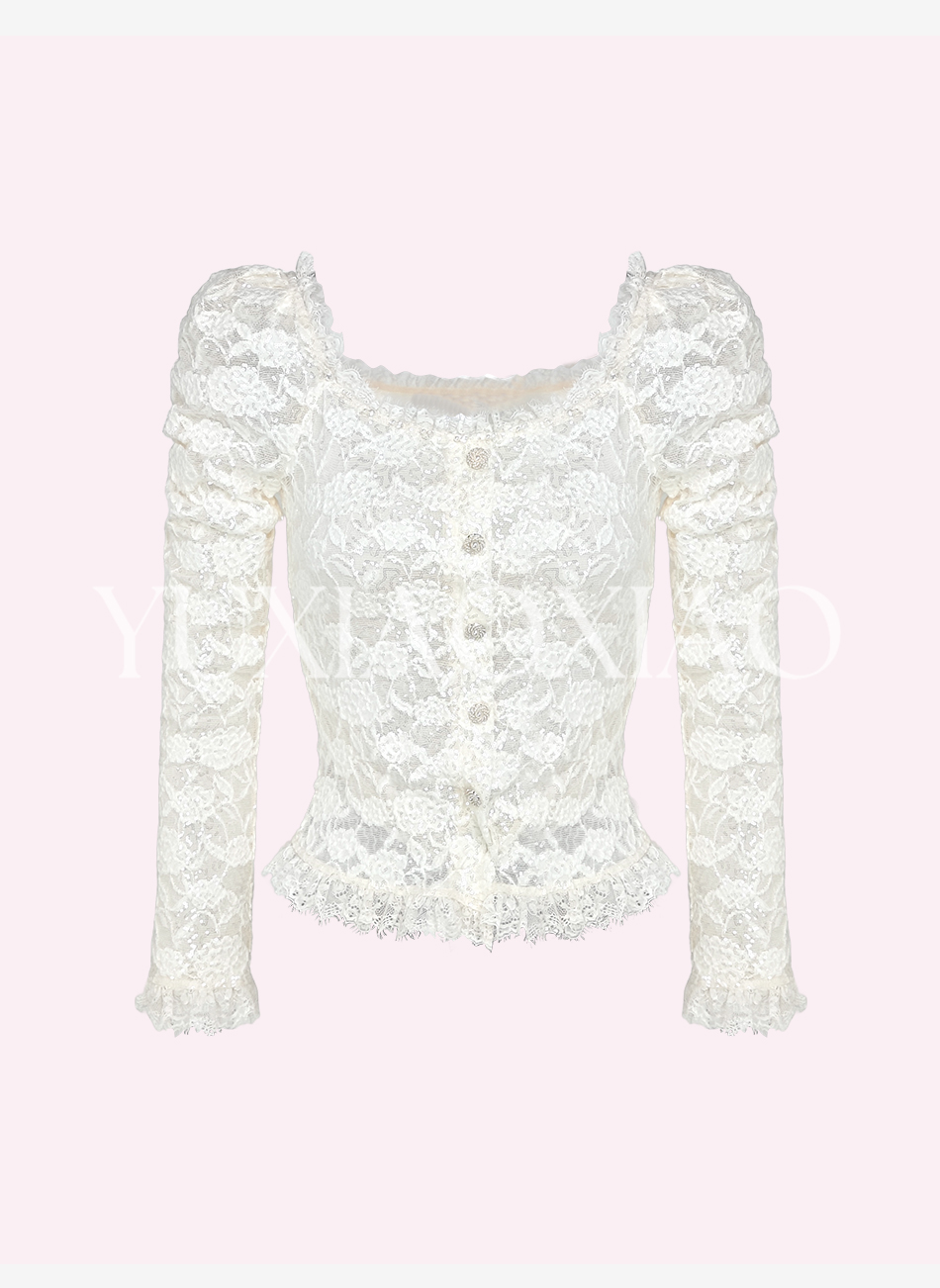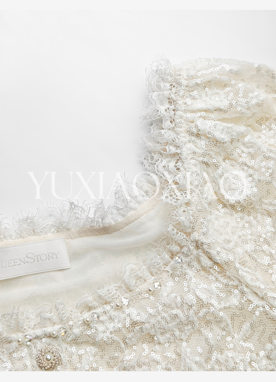 余潇潇【温柔白玉兰】时髦设计棉感亮片蕾丝手缝水晶珠方领花边上衣