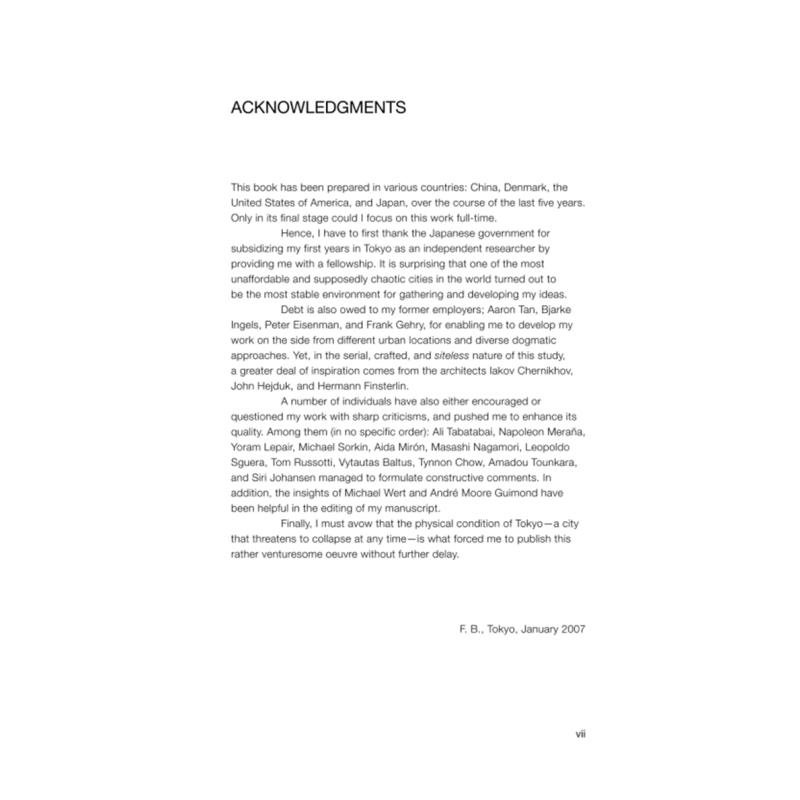 有些人可能称其为 21 世纪的第一份宣言,因为它提出了一种思考建筑的新方式。其他人可能认为它是最后一篇建筑论文,因为它为那些原本会丢失的想法提供了一个话语容器。无论它属于哪种类型,《无定所》 都是一种似乎横空出世的新型建筑书籍。它的作者是一位在东京执业的年轻法国建筑师,他承认他“这样做并不是出于对建筑的崇敬,而是出于对这门学科的深深厌倦,这是一种强迫性反应。”他问道,如果建筑师将他们的思想从场地、程序和预算的限制中解放出来,会发生什么?结果是这本书充满了形式,并且像麻省理工学院出版社出版的任何建筑书籍一样没有文字。