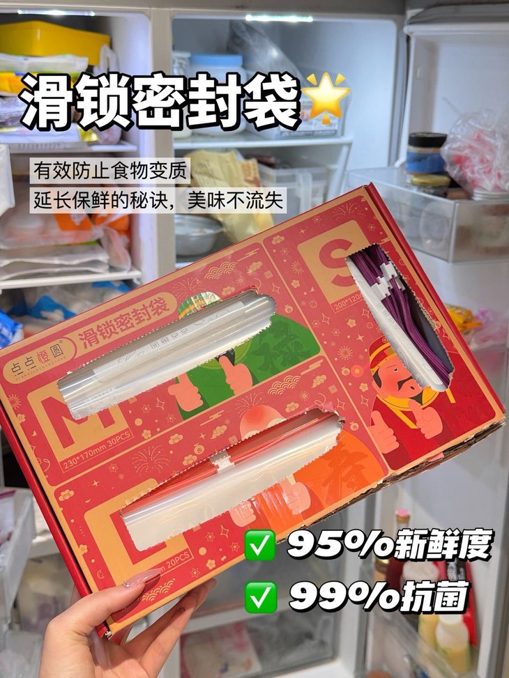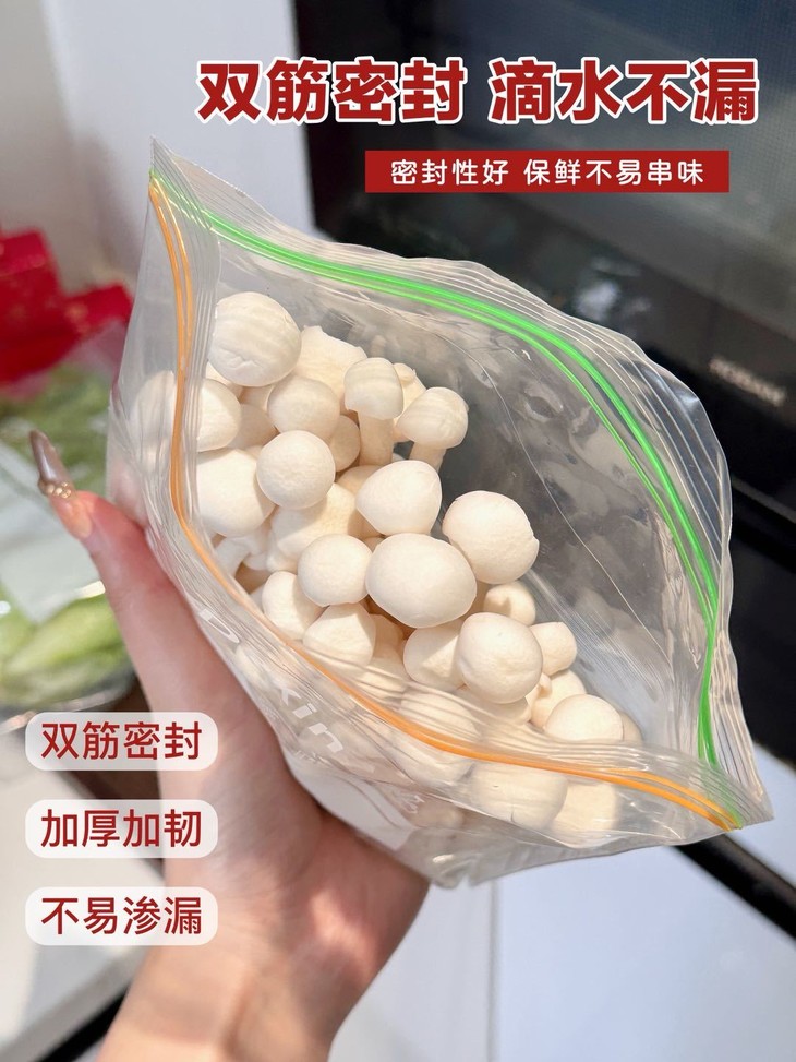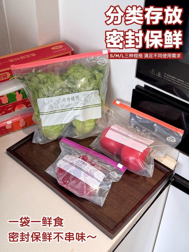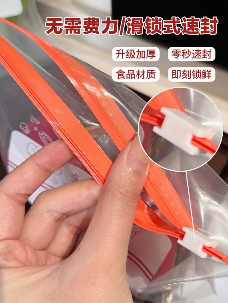 一滑即密封,锁住新鲜99%💫 🥬你是否还在为这些问题烦恼?•传统保鲜袋封不紧,食物串味受潮•反复开启取物,保鲜效果大打折扣•收纳杂乱食材 冰箱空间越用越乱🔒创新滑锁设计惊艳登场! 食品级PE材质+精密滑轨工艺像拉链般顺滑开合,密封性能提升300%