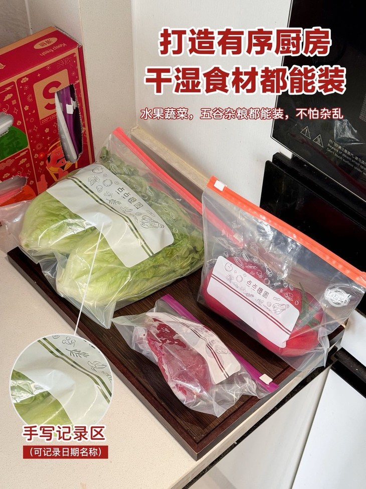 ✔食品级PE材质保鲜袋 冷藏冷冻干湿两用! ✔双链条密封口设计 厚实抗撕扯做手机防水袋也很不错 ✔可标注食材日期反复使用环保又安心