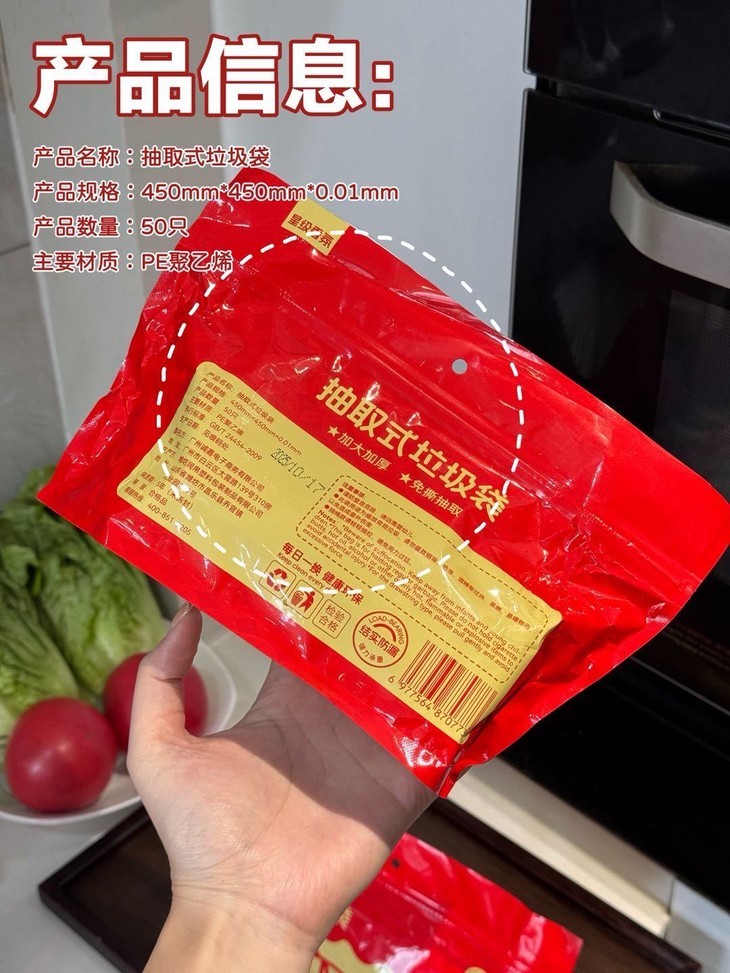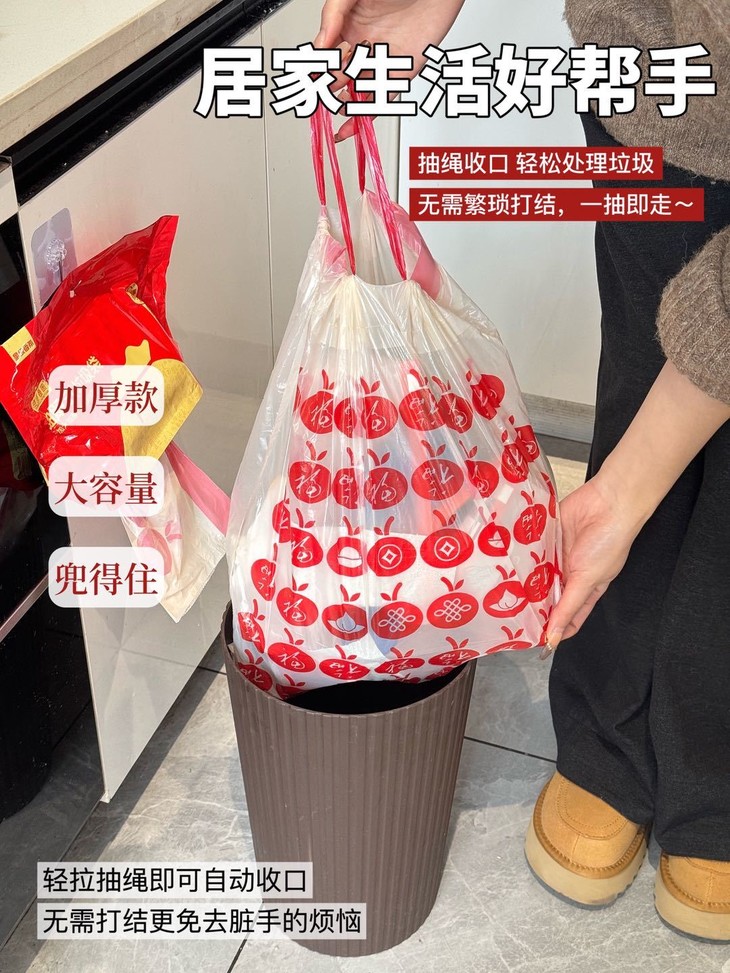 免撕抽取式,包装也非常好看! 加大加厚的质量,限定红色印花 颜值和实用性并存的好用神器!!!👍🏻 真的超级好用的环保材质 随便怎么扯怎么倒腾都不会破,给足你安全感!!🔥 🥰加宽的抽绳设计不容易勒手也不会脏手!!! 这么好用的产品真的是只要不断货我就要一直复购!!!😍