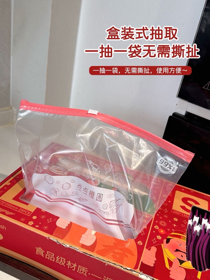 抽取式设计,拿取超方便!人性化设计,满足日常所需 上班、居家、健身房、户外旅游,甚至是食物打包! 有了这样方面的保鲜袋,即撕,即拎,即走! 随时随地享受食物新鲜滋味!