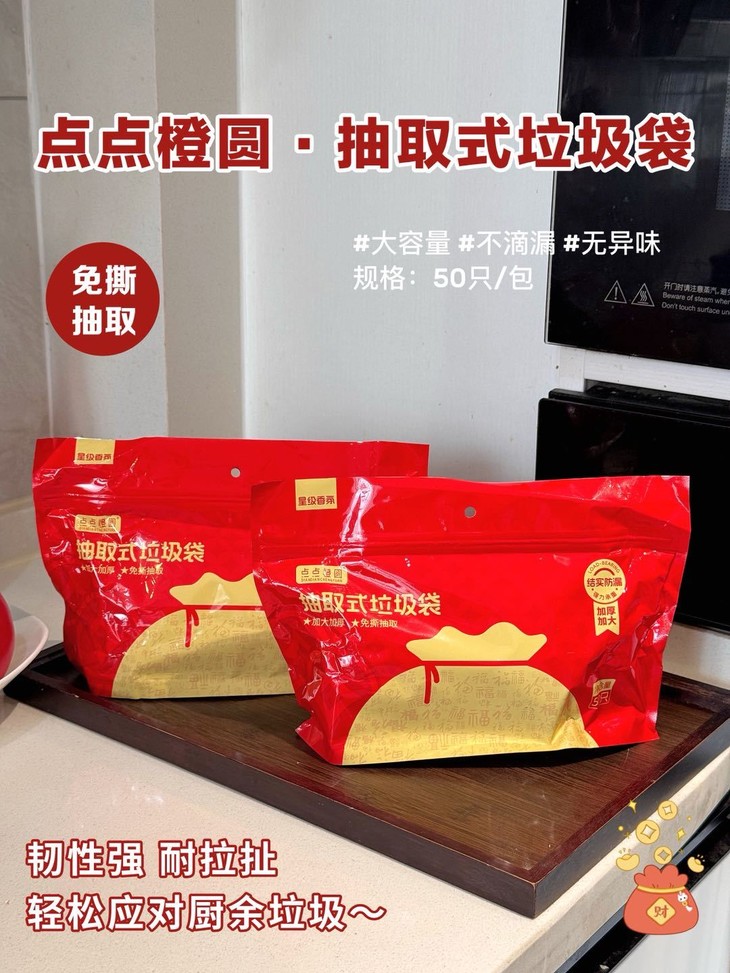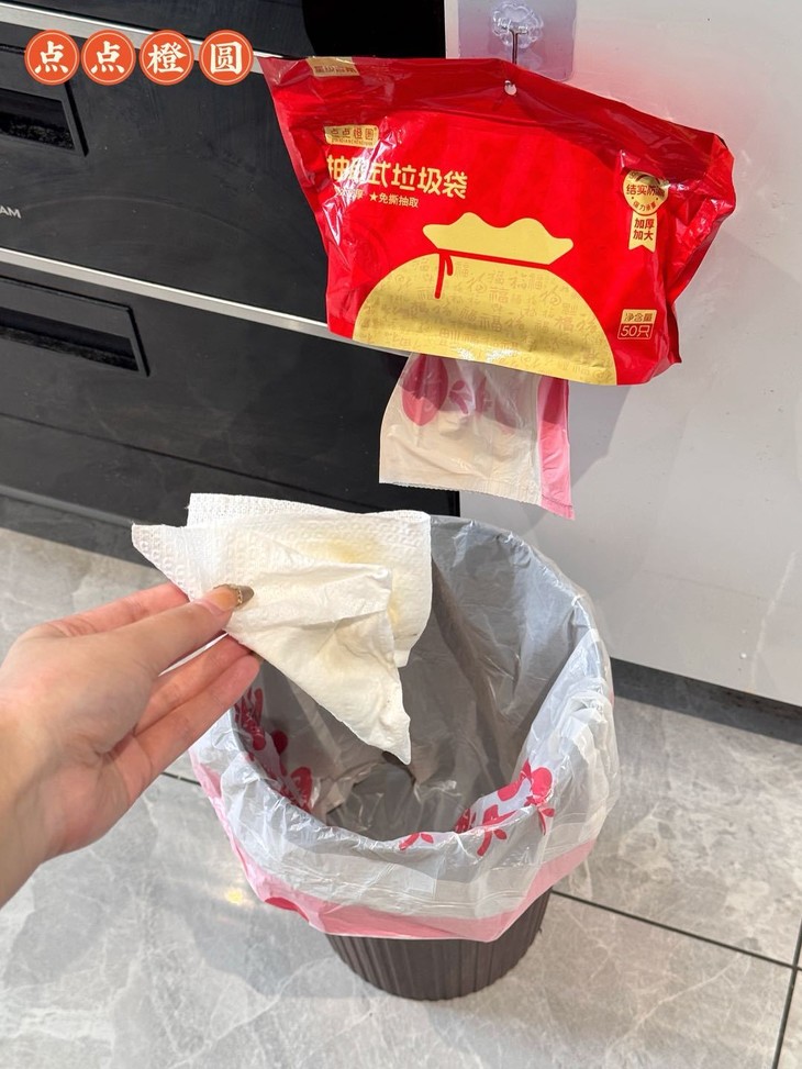点点橙圆·抽取式垃圾袋 加厚加大巨能装,垃圾袋界的扛把子 ✅便捷免撕设计,再也不会撕一个破2个啦 ✅挂壁式抽取包装,一抽一用跟抽纸般丝滑 ✅抽绳式提拉,一拎一提轻轻松松带出门 ✅加厚加大!厨房汤水不滴不漏