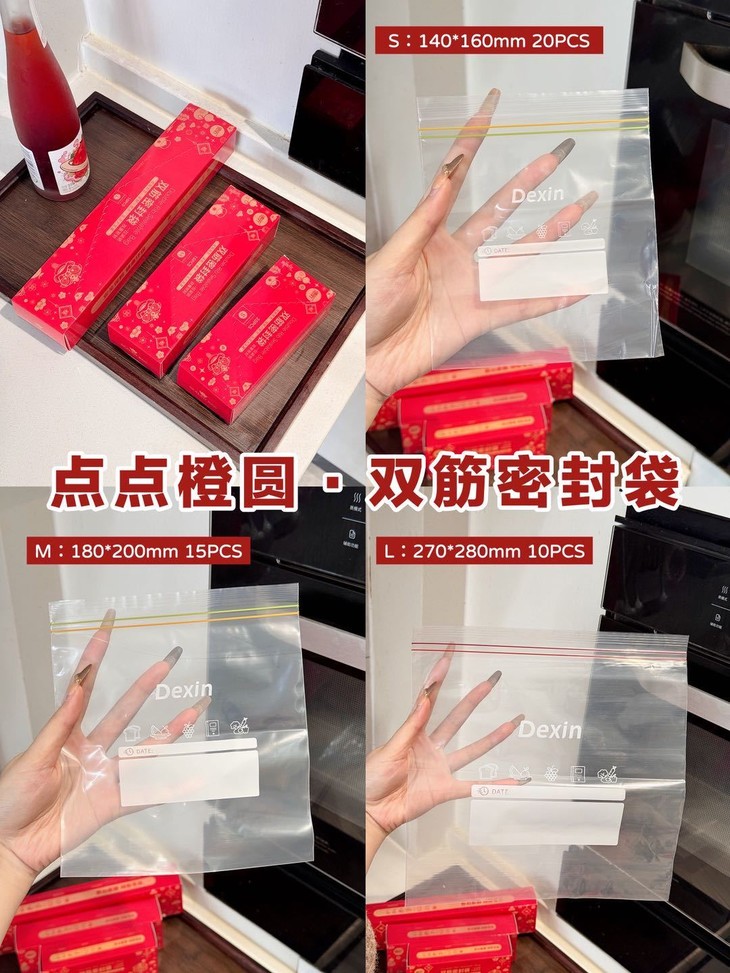 点点橙圆双筋密封袋这波细节太戳了! S/M/L三个尺寸 袋身都带日期标贴,装食材、囤杂物时随手记上超方便~ 双筋密封一拉就紧 透明袋身找东西也一目了然,厨房收纳党直接锁死!