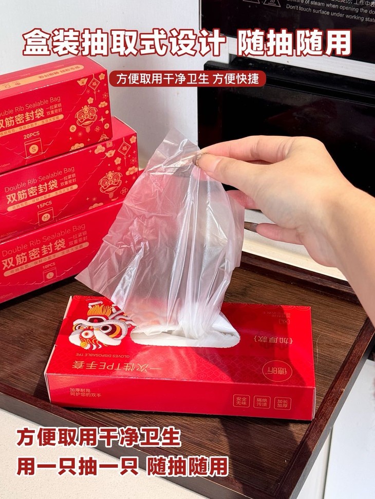 🔥家居好物合集来啦~🎉这波红色喜庆系列真的绝绝子✨ 涵盖了厨房常用的保鲜、收纳、清洁工具,而且包装是喜庆的国潮风格~ • 食品保鲜罩(200只):套碗盘方便,不用洗保鲜盒,可当浴帽/鞋套。 • 滑锁密封袋(L/M/S三码):一滑即锁,底部加宽,双面16丝整体加厚,抗菌保鲜防串味,可重复使用 • 抽取式垃圾袋:免手撕,抽绳式提拉,加厚加大耐拉扯,厨房汤水不滴漏 • 双筋密封袋:分类保鲜防串味,双面8丝 • 空气炸锅纸盘:烤东西不粘锅,减少厨具繁琐清洗 • 一次性TPE手套:吃东西、拌菜、处理食材都能用 整体是厨房一站式备齐的类型,适合日常囤货~