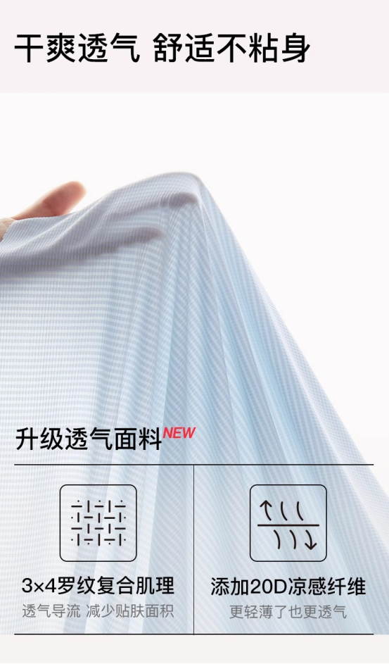 ✅面料采用20D超细凉感纤维结合莱卡弹力纤维织造, 呈现3x4罗纹复合条纹肌理, 富有时尚外穿感的同时有效散热导热, 舒爽不粘身,清凉不闷汗