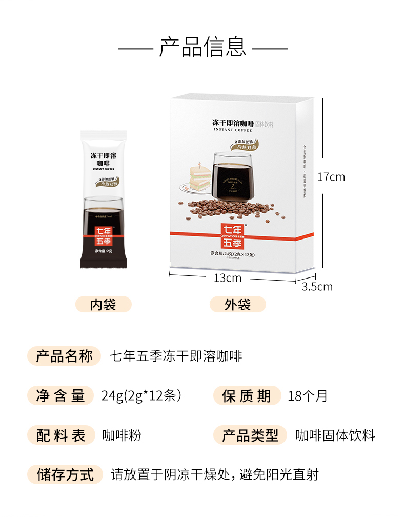七年五季黑咖啡速溶低脂无添加蔗糖冻干即溶浓缩咖啡粉12条