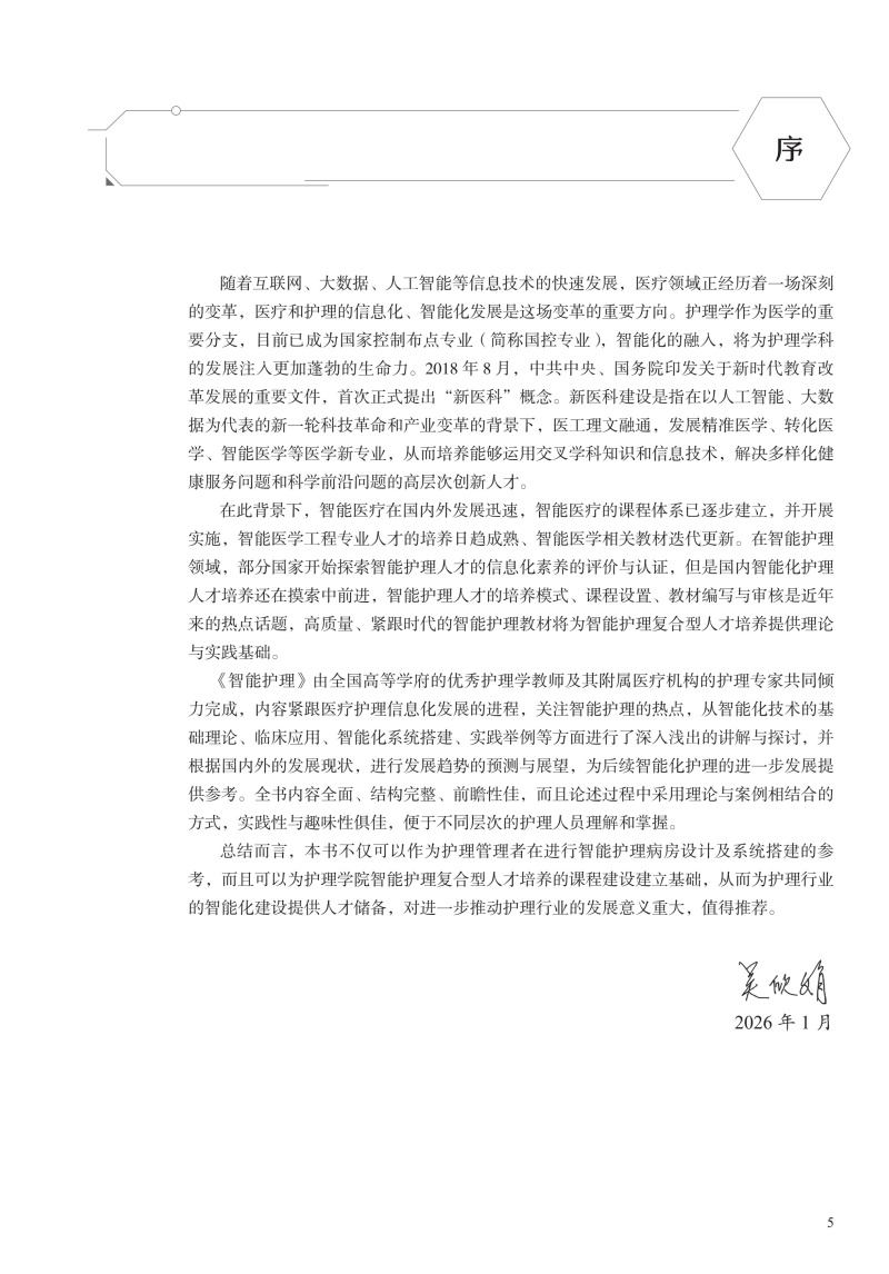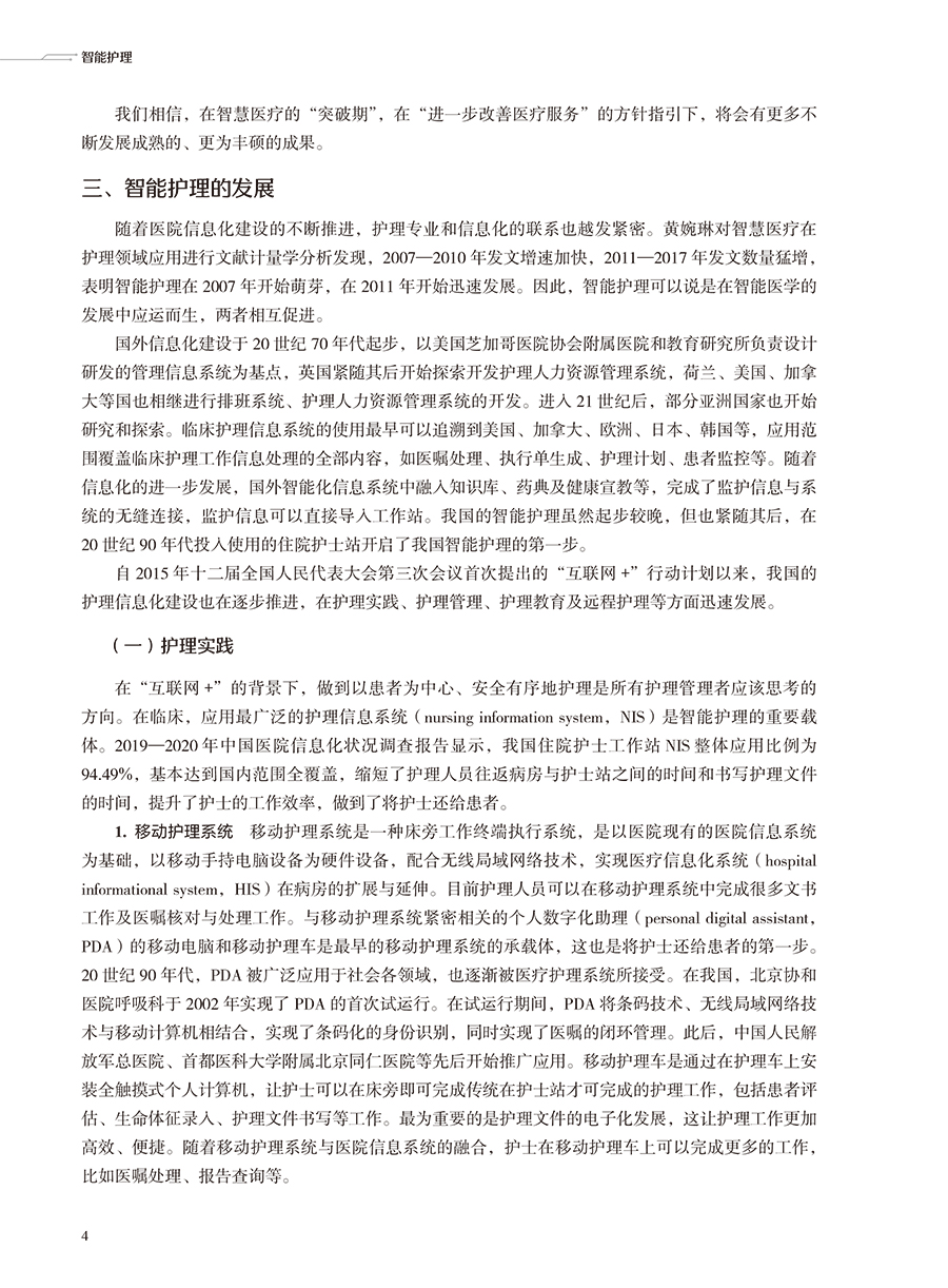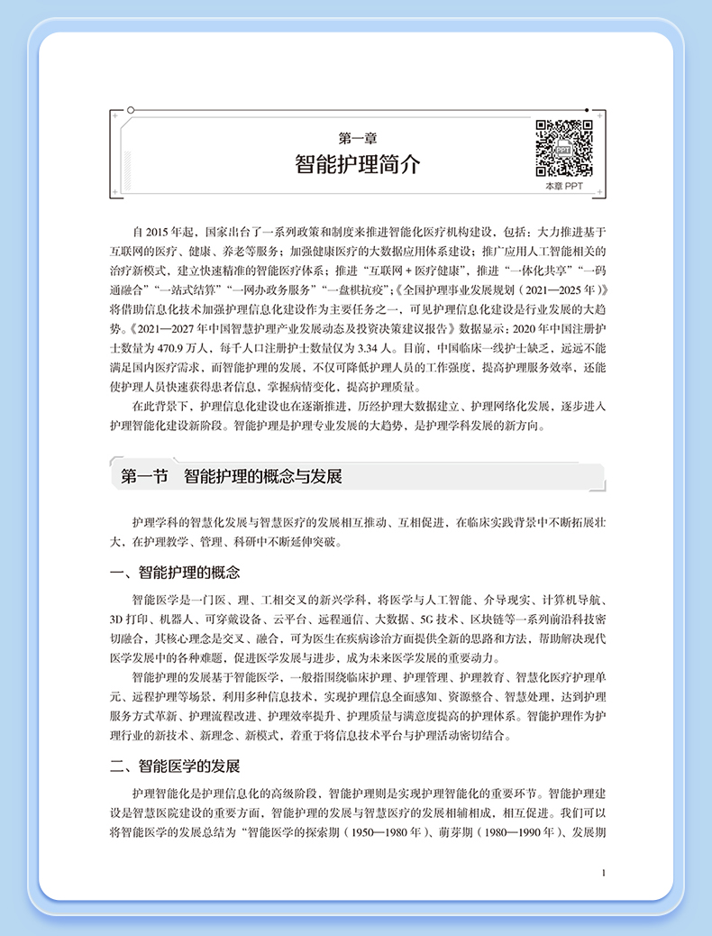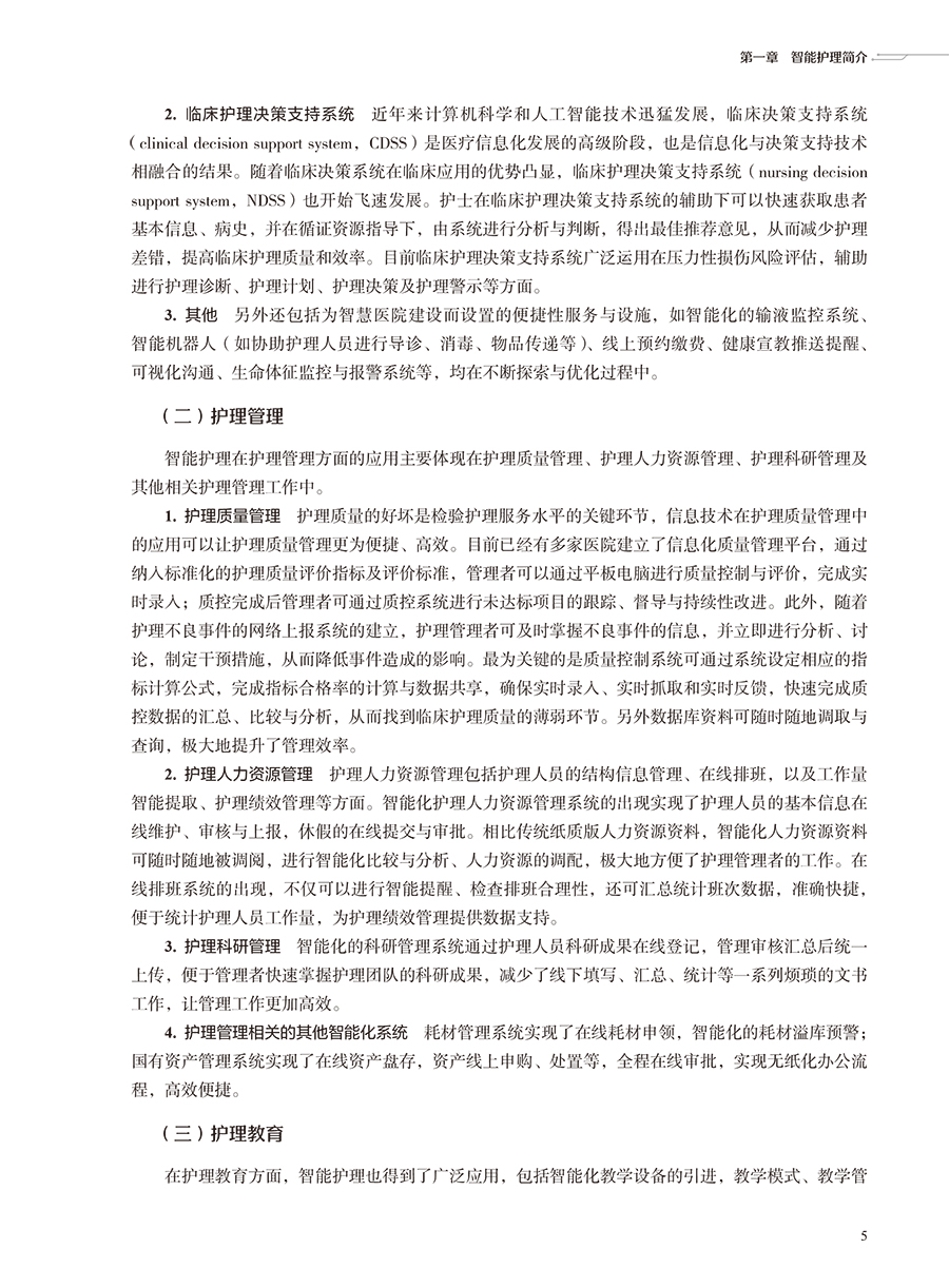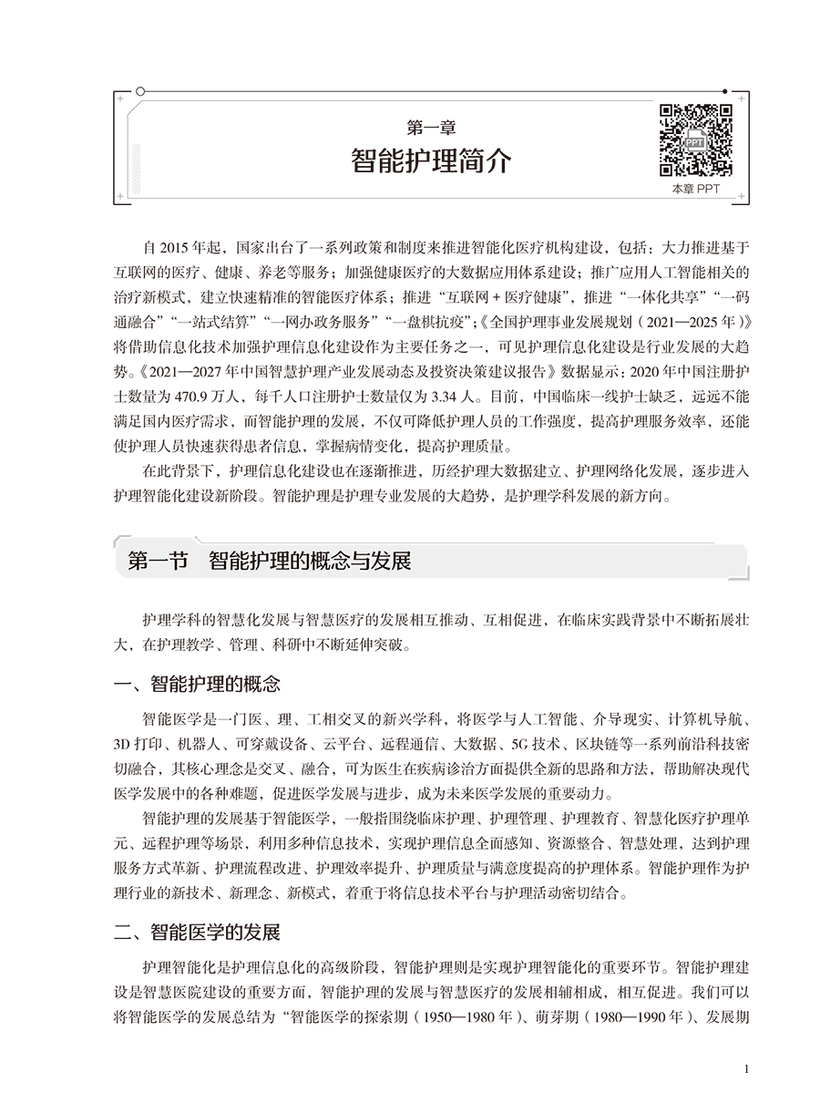 本书在结构上包括智能护理学概论,智能护理技术智能护理应用现状、趋势及举例,智能护理的应用,智能化建设,智能化的系统及设备5部分。首先从智能护理学的概念、发展现状开篇,概述智能护理在国内外的起源及现状、展望;同时通过介绍智能护理中常见的信息化技术,让读者对目前临床常见的信息化技术有充分的了解;然后重点叙述智能护理在临床护理、远程护理、社区护理及老年护理方面的应用现状及举例,让读者了解智能护理在护理领域的重要作用;再次,通过介绍智能化门急诊及手术室等相关部门的发展现状、建设过程及应用举例,让读者了解智能化护理的构建过程;最后结合护理相关信息系统举例以及智能化的设备介绍,分析目前智能化护理系统与设备的优势与劣势,以促进智能化建设的进一步提升。