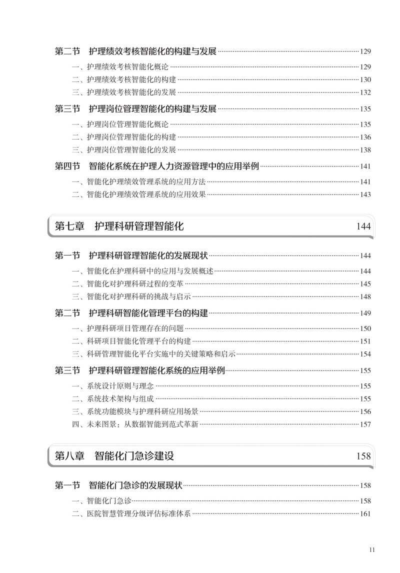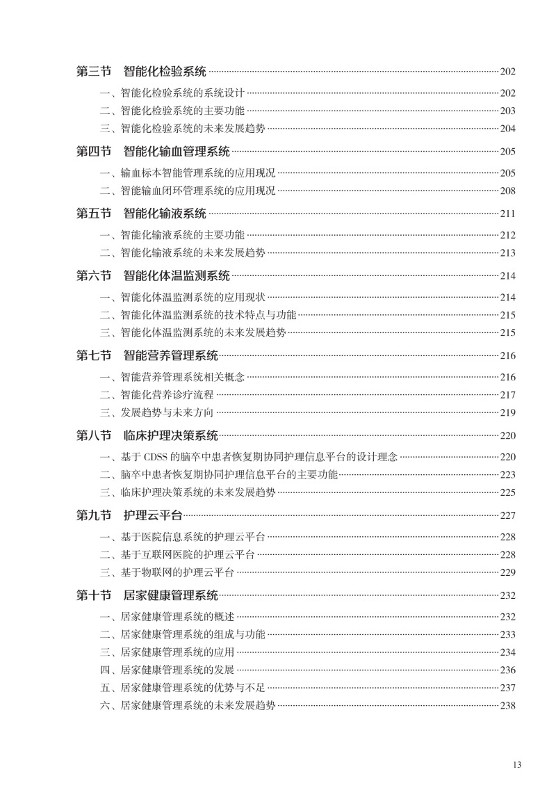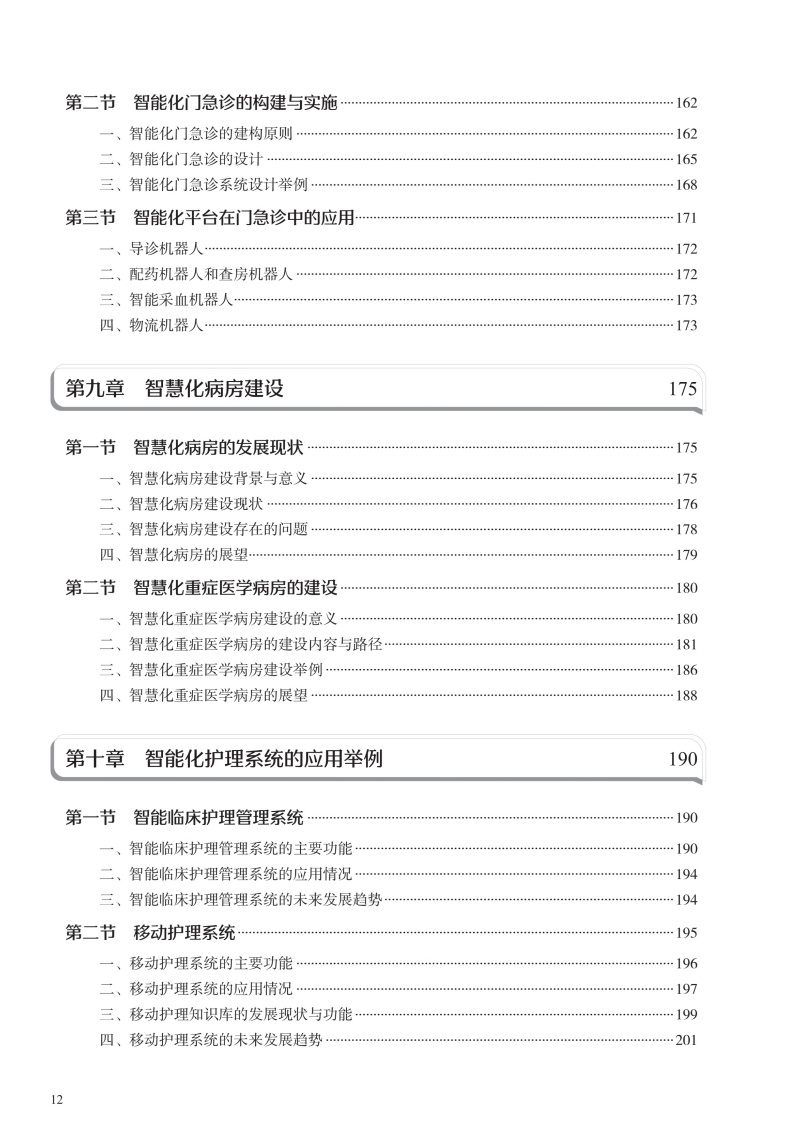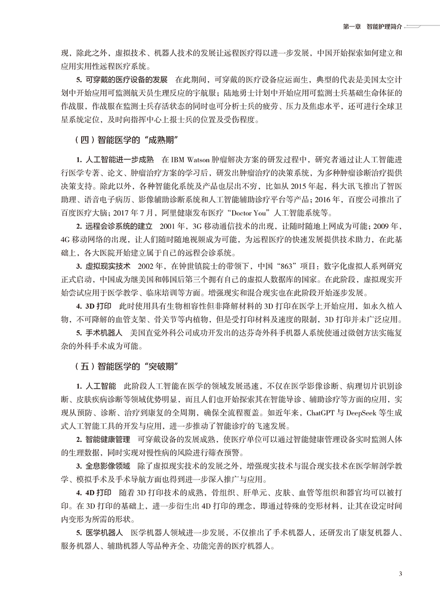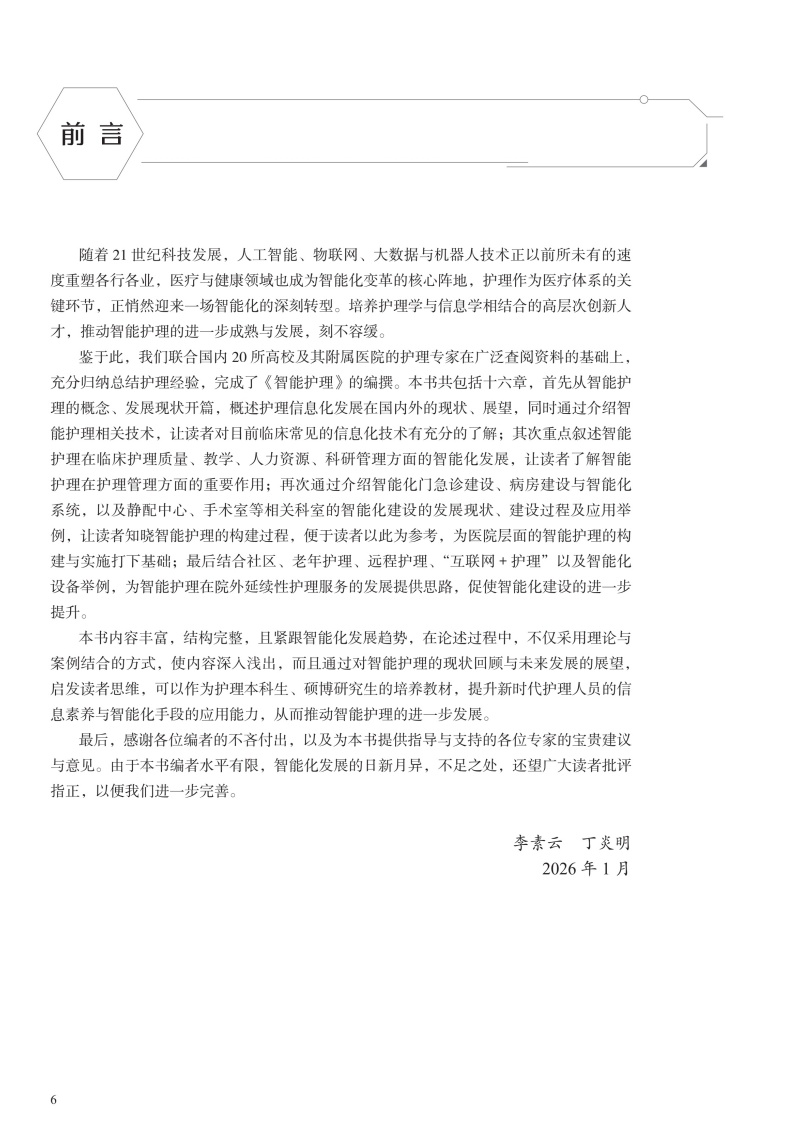 本书在结构上包括智能护理学概论,智能护理技术智能护理应用现状、趋势及举例,智能护理的应用,智能化建设,智能化的系统及设备5部分。首先从智能护理学的概念、发展现状开篇,概述智能护理在国内外的起源及现状、展望;同时通过介绍智能护理中常见的信息化技术,让读者对目前临床常见的信息化技术有充分的了解;然后重点叙述智能护理在临床护理、远程护理、社区护理及老年护理方面的应用现状及举例,让读者了解智能护理在护理领域的重要作用;再次,通过介绍智能化门急诊及手术室等相关部门的发展现状、建设过程及应用举例,让读者了解智能化护理的构建过程;最后结合护理相关信息系统举例以及智能化的设备介绍,分析目前智能化护理系统与设备的优势与劣势,以促进智能化建设的进一步提升。