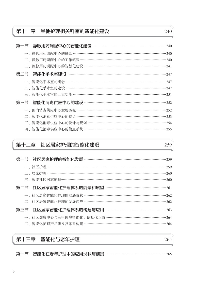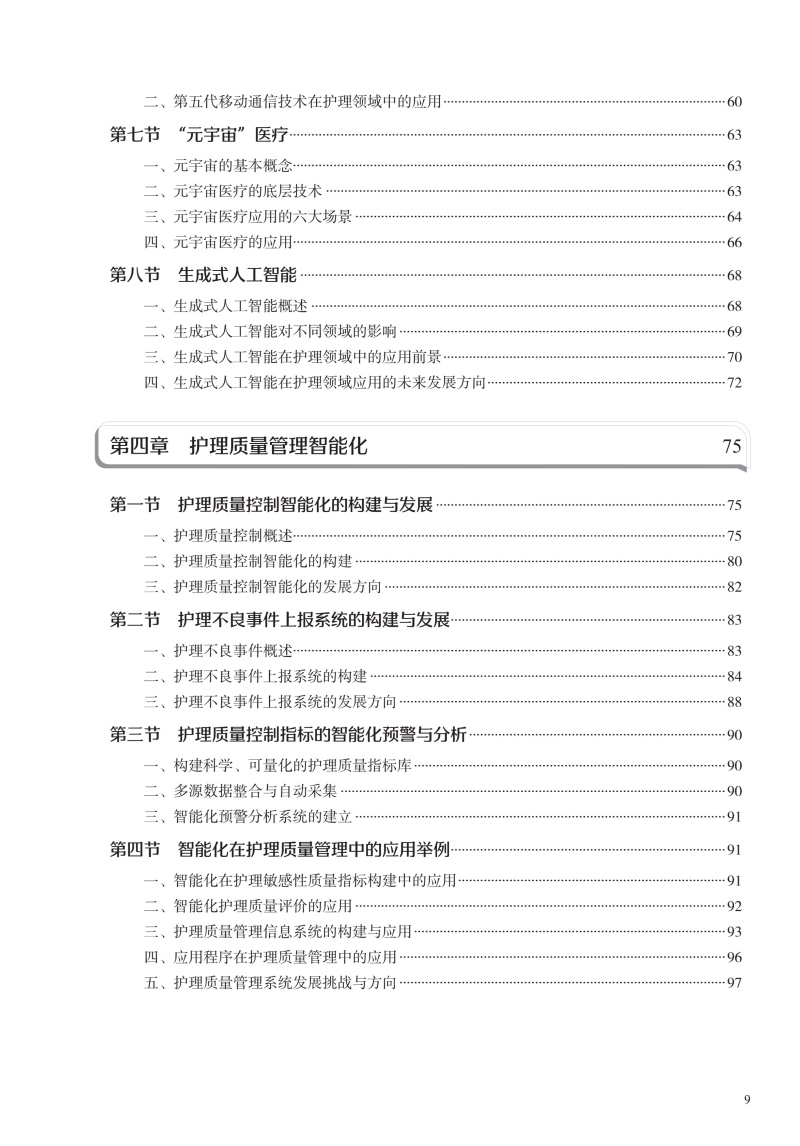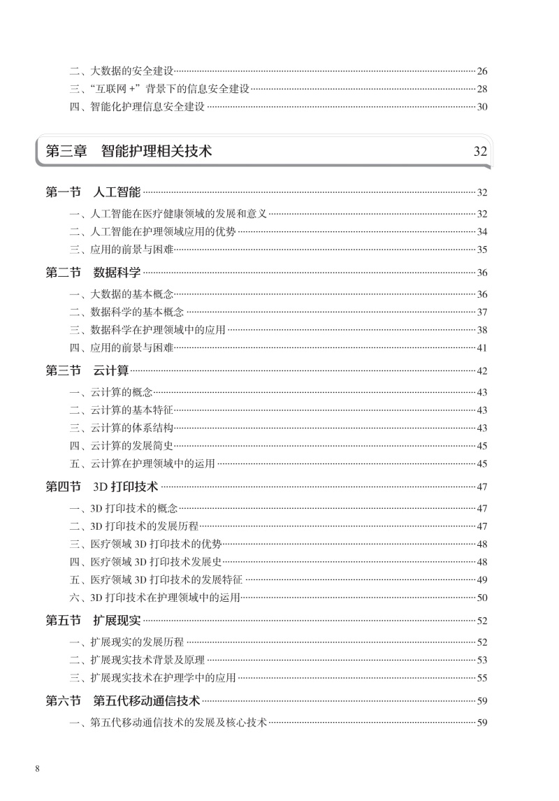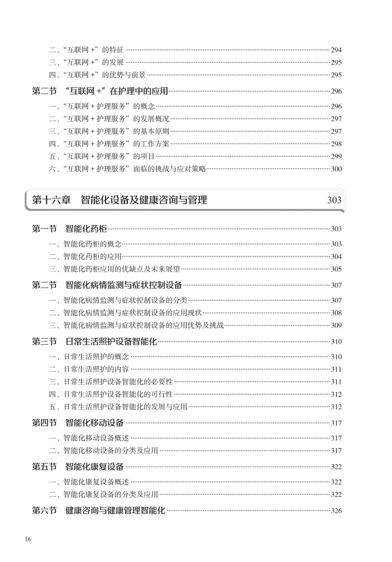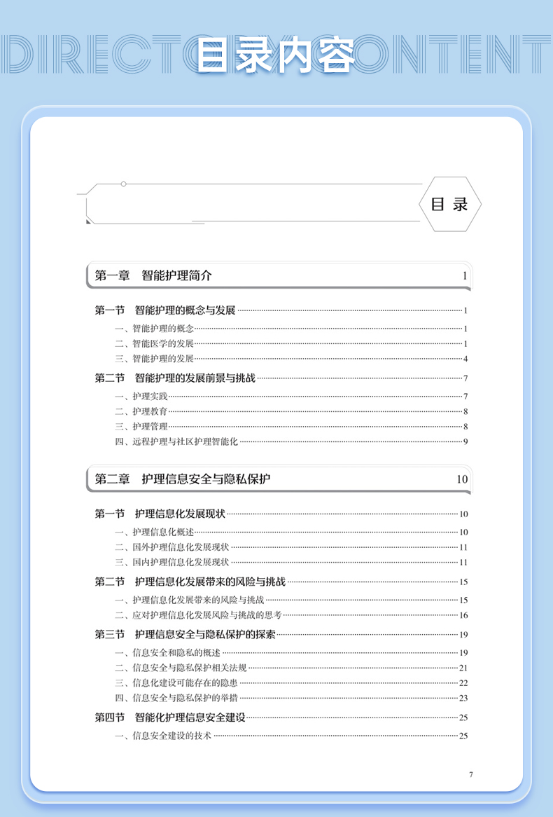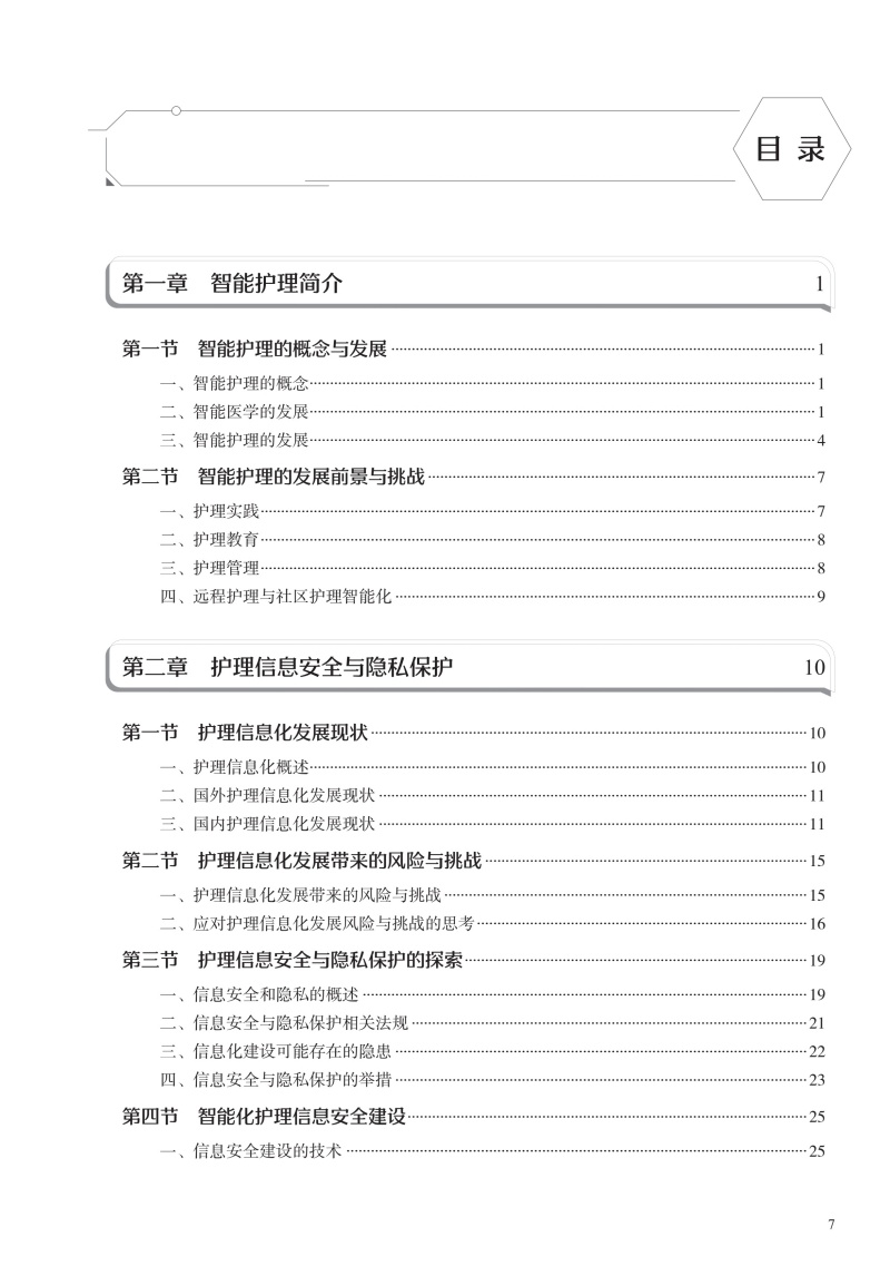 本书在结构上包括智能护理学概论,智能护理技术智能护理应用现状、趋势及举例,智能护理的应用,智能化建设,智能化的系统及设备5部分。首先从智能护理学的概念、发展现状开篇,概述智能护理在国内外的起源及现状、展望;同时通过介绍智能护理中常见的信息化技术,让读者对目前临床常见的信息化技术有充分的了解;然后重点叙述智能护理在临床护理、远程护理、社区护理及老年护理方面的应用现状及举例,让读者了解智能护理在护理领域的重要作用;再次,通过介绍智能化门急诊及手术室等相关部门的发展现状、建设过程及应用举例,让读者了解智能化护理的构建过程;最后结合护理相关信息系统举例以及智能化的设备介绍,分析目前智能化护理系统与设备的优势与劣势,以促进智能化建设的进一步提升。