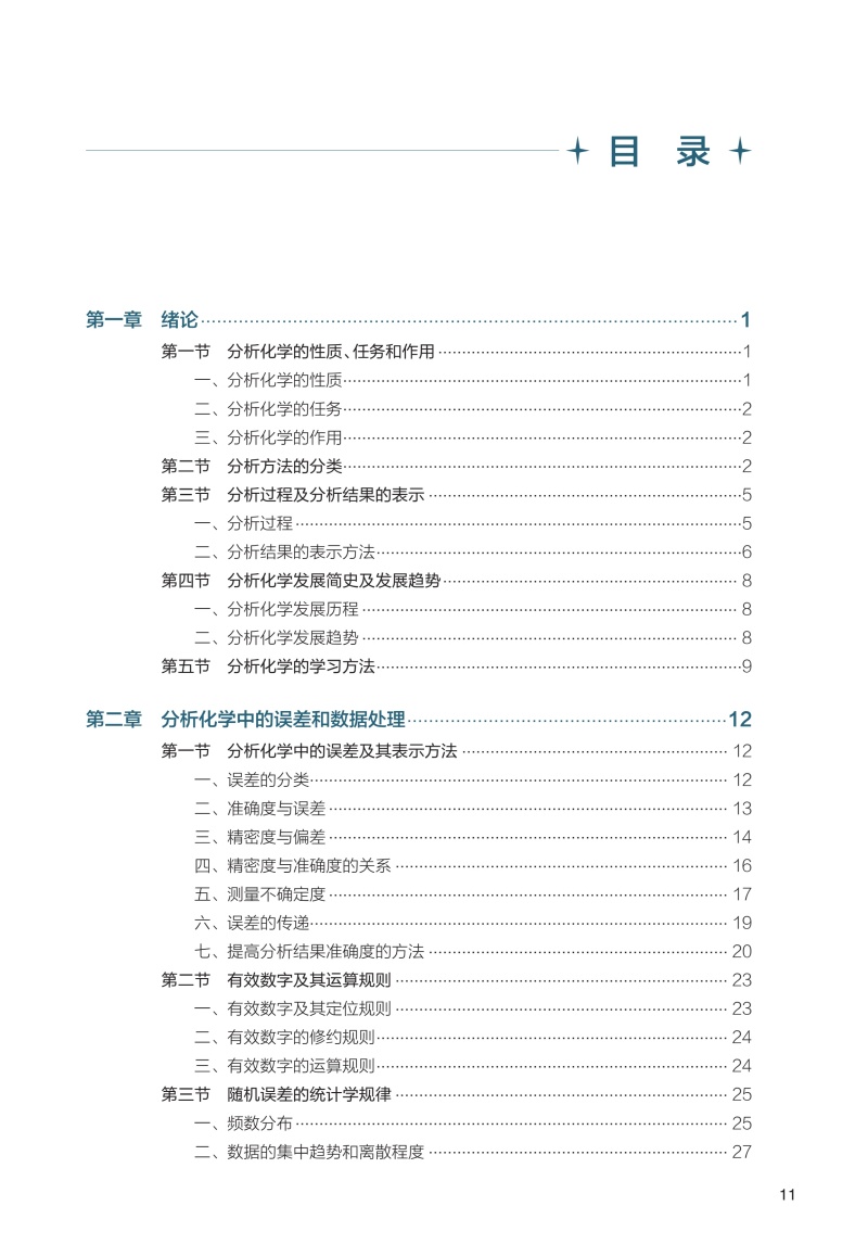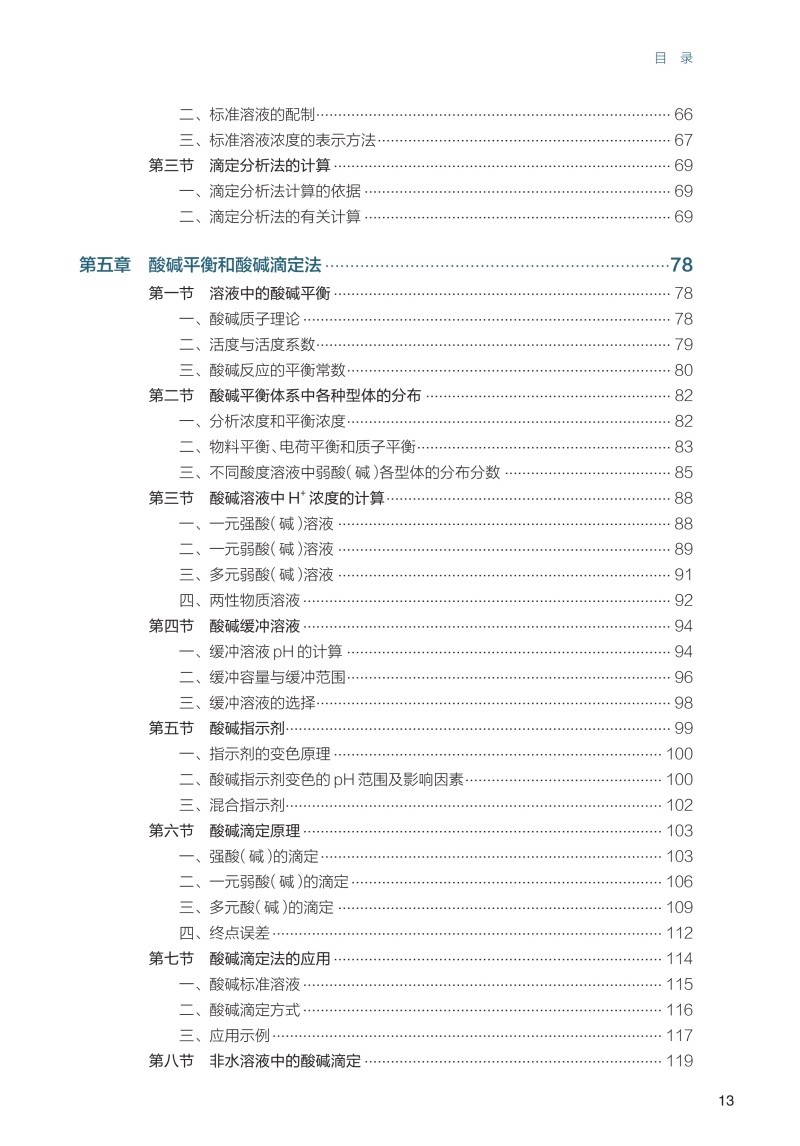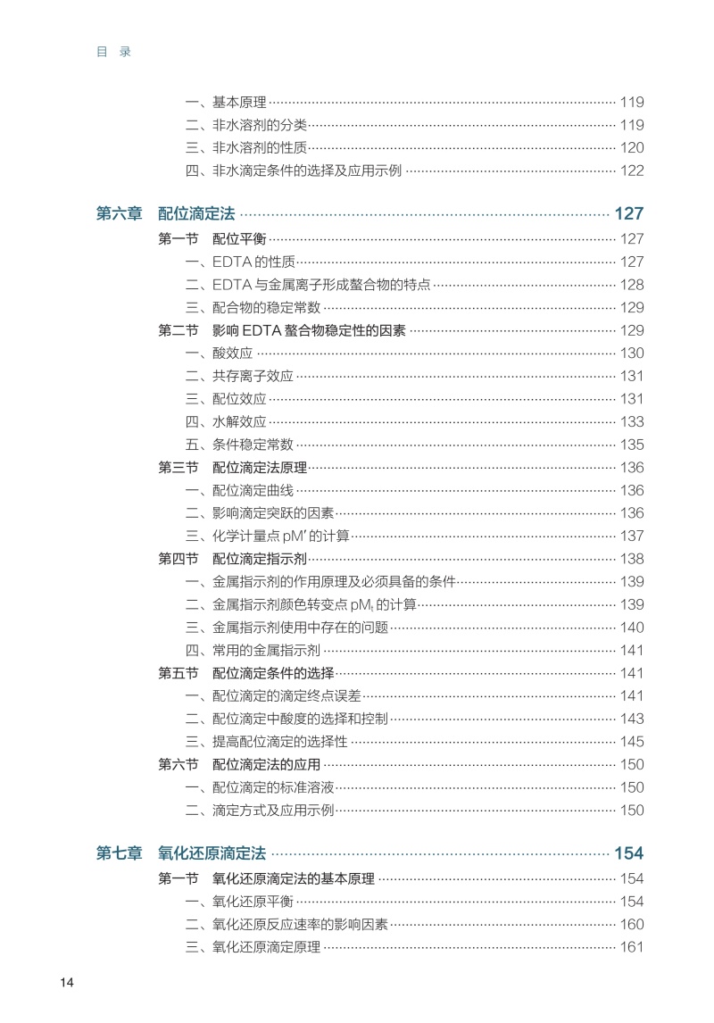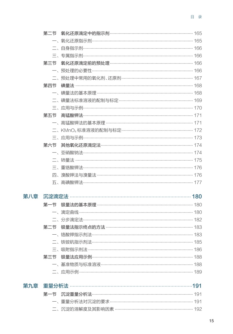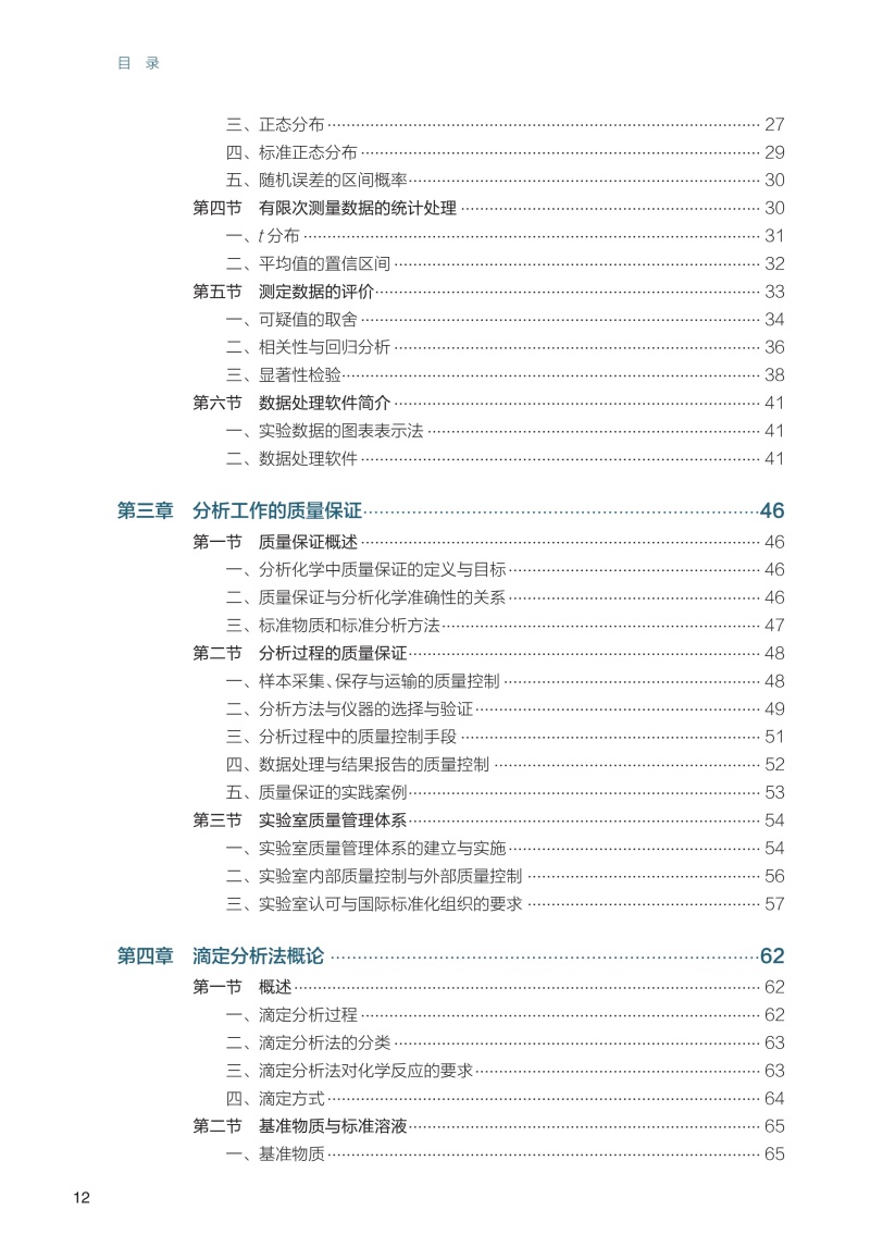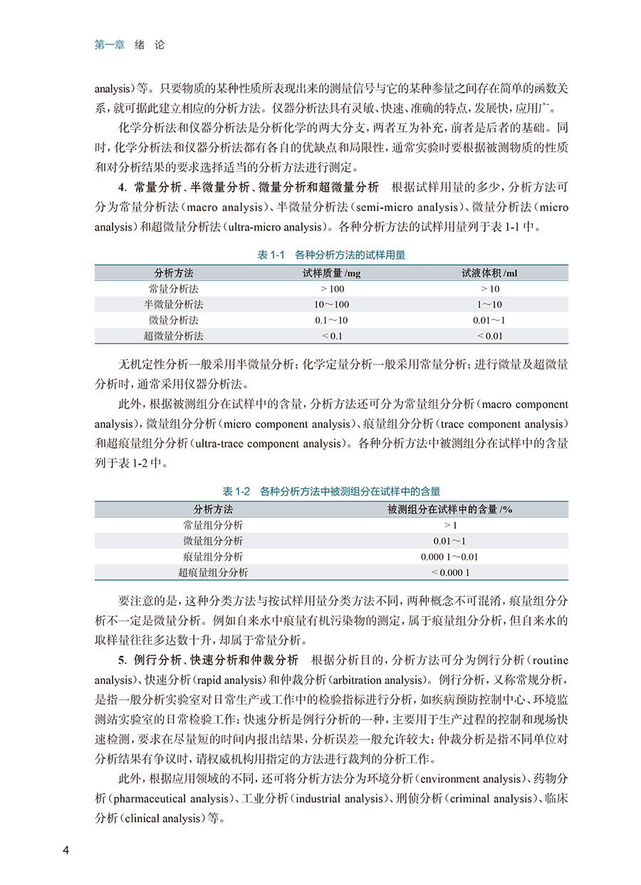 第一章 绪论/ 1 第一节 分析化学的性质、任务和作用/1 一、 分析化学的性质/1 二、 分析化学的任务/2 三、 分析化学的作用/2 第二节 分析方法的分类/2 第三节 分析过程及分析结果的表示/5 一、 分析过程/5 二、 分析结果的表示方法/6 第四节 分析化学发展简史及发展趋势/ 8 一、 分析化学发展历程/ 8 二、 分析化学发展趋势/ 8 第五节 分析化学的学习方法/9 第二章 分析化学中的误差和数据处理/12 第一节 分析化学中的误差及其表示方法/ 12 一、 误差的分类/ 12 二、 准确度与误差/ 13 三、 精密度与偏差/ 14 四、 精密度与准确度的关系/ 16 五、 测量不确定度/ 17 六、 误差的传递/ 19 七、 提高分析结果准确度的方法/ 20 第二节 有效数字及其运算规则/ 23 一、 有效数字及其定位规则/ 23 二、 有效数字的修约规则/ 24 三、 有效数字的运算规则/ 24 第三节 随机误差的统计学规律/ 25 一、 频数分布/ 25 二、 数据的集中趋势和离散程度/ 27 三、 正态分布/ 27 四、 标准正态分布/ 29 五、 随机误差的区间概率/ 30 第四节 有限次测量数据的统计处理/ 30 一、 t 分布/ 31 二、 平均值的置信区间/ 32 第五节 测定数据的评价/ 33 一、 可疑值的取舍/ 34 二、 相关性与回归分析/ 36 三、 显著性检验/ 38 第六节 数据处理软件简介/ 41 一、 实验数据的图表表示法/ 41 二、 数据处理软件/ 41 第三章 分析工作的质量保证/46 第一节 质量保证概述/ 46 一、 分析化学中质量保证的定义与目标/ 46 二、 质量保证与分析化学准确性的关系/ 46 三、 标准物质和标准分析方法/ 47 第二节 分析过程的质量保证/ 48 一、 样本采集、保存与运输的质量控制/ 48 二、 分析方法与仪器的选择与验证/ 49 三、 分析过程中的质量控制手段/ 51 四、 数据处理与结果报告的质量控制/ 52 五、 质量保证的实践案例/ 53 第三节 实验室质量管理体系/ 54 一、 实验室质量管理体系的建立与实施/ 54 二、 实验室内部质量控制与外部质量控制/ 56 三、 实验室认可与国际标准化组织的要求/ 57 第四章 滴定分析法概论/62 第一节 概述/ 62 一、 滴定分析过程/ 62 二、 滴定分析法的分类/ 63 三、 滴定分析法对化学反应的要求/ 63 四、 滴定方式/ 64 第二节 基准物质与标准溶液/ 65 一、 基准物质/ 65 二、 标准溶液的配制/ 66 三、 标准溶液浓度的表示方法/ 67 第三节 滴定分析法的计算/ 69 一、 滴定分析法计算的依据/ 69 二、 滴定分析法的有关计算/ 69 第五章 酸碱平衡和酸碱滴定法/78 第一节 溶液中的酸碱平衡/ 78 一、 酸碱质子理论/ 78 二、 活度与活度系数/ 79 三、 酸碱反应的平衡常数/ 80 第二节 酸碱平衡体系中各种型体的分布/ 82 一、 分析浓度和平衡浓度/ 82 二、 物料平衡、电荷平衡和质子平衡/ 83 三、 不同酸度溶液中弱酸(碱)各型体的分布分数/ 85 第三节 酸碱溶液中H+ 浓度的计算/ 88 一、 一元强酸(碱)溶液/ 88 二、 一元弱酸(碱)溶液/ 89 三、 多元弱酸(碱)溶液/ 91 四、 两性物质溶液/ 92 第四节 酸碱缓冲溶液/ 94 一、 缓冲溶液pH 的计算/ 94 二、 缓冲容量与缓冲范围/ 96 三、 缓冲溶液的选择/ 98 第五节 酸碱指示剂/ 99 一、 指示剂的变色原理/ 100 二、 酸碱指示剂变色的pH 范围及影响因素/ 100 三、 混合指示剂/ 102 第六节 酸碱滴定原理/ 103 一、 强酸(碱)的滴定/ 103 二、 一元弱酸(碱)的滴定/ 106 三、 多元酸(碱)的滴定/ 109 四、 终点误差/ 112 第七节 酸碱滴定法的应用/ 114 一、 酸碱标准溶液/ 115 二、 酸碱滴定方式/ 116 三、 应用示例/ 117 第八节 非水溶液中的酸碱滴定/ 119 一、 基本原理/ 119 二、 非水溶剂的分类/ 119 三、 非水溶剂的性质/ 120 四、 非水滴定条件的选择及应用示例/ 122 第六章 配位滴定法/ 127 第一节 配位平衡/ 127 一、 EDTA 的性质/ 127 二、 EDTA 与金属离子形成螯合物的特点/ 128 三、 配合物的稳定常数/ 129 第二节 影响EDTA 螯合物稳定性的因素/ 129 一、 酸效应/ 130 二、 共存离子效应/ 131 三、 配位效应/ 131 四、 水解效应/ 133 五、 条件稳定常数/ 135 第三节 配位滴定法原理/ 136 一、 配位滴定曲线/ 136 二、 影响滴定突跃的因素/ 136 三、 化学计量点pM′ 的计算/ 137 第四节 配位滴定指示剂/ 138 一、 金属指示剂的作用原理及必须具备的条件/ 139 二、 金属指示剂颜色转变点pMt 的计算/ 139 三、 金属指示剂使用中存在的问题/ 140 四、 常用的金属指示剂/ 141 第五节 配位滴定条件的选择/ 141 一、 配位滴定的滴定终点误差/ 141 二、 配位滴定中酸度的选择和控制/ 143 三、 提高配位滴定的选择性/ 145 第六节 配位滴定法的应用/ 150 一、 配位滴定的标准溶液/ 150 二、 滴定方式及应用示例/ 150 第七章 氧化还原滴定法/ 154 第一节 氧化还原滴定法的基本原理/ 154 一、 氧化还原平衡/ 154 二、 氧化还原反应速率的影响因素/ 160 三、 氧化还原滴定原理/ 161 第二节 氧化还原滴定中的指示剂/ 165 一、 氧化还原指示剂/ 165 二、 自身指示剂/ 166 三、 专属指示剂/ 166 第三节 氧化还原滴定前的预处理/ 166 一、 预处理的必要性/ 166 二、 预处理中常用的氧化剂、还原剂/ 167 第四节 碘量法/ 168 一、 碘量法的基本原理/ 168 二、 碘量法标准溶液的配制与标定/ 169 三、 应用与示例/ 170 第五节 高锰酸钾法/ 171 一、 高锰酸钾法的基本原理/ 171 二、 KMnO4 标准溶液的配制与标定/ 172 三、 应用与示例/ 173 第六节 其他氧化还原滴定