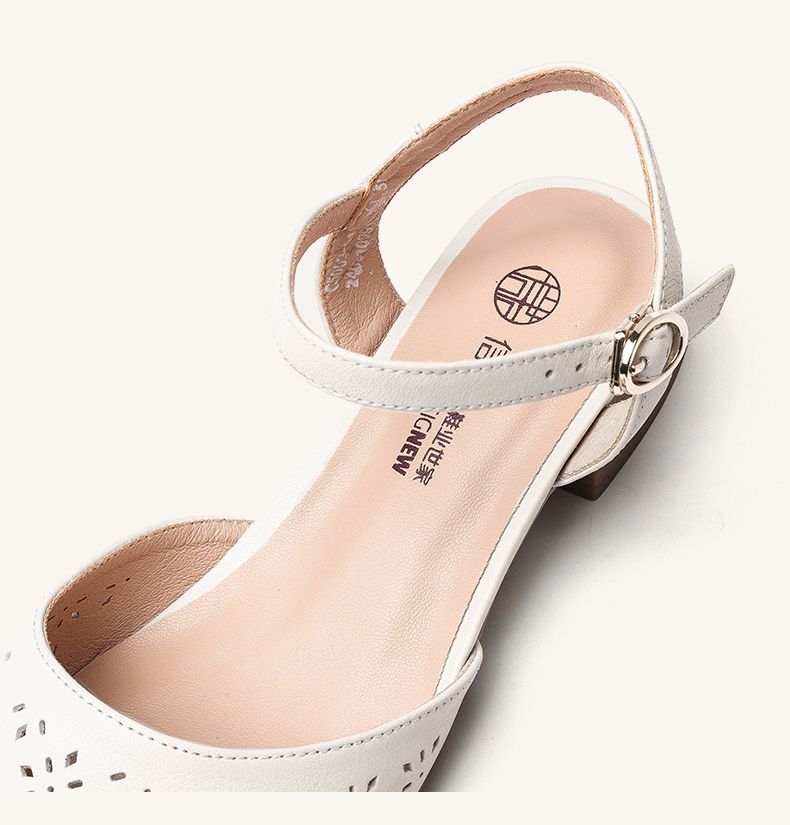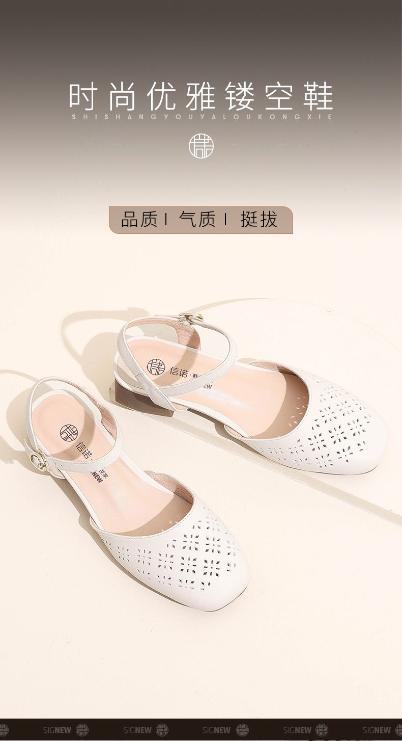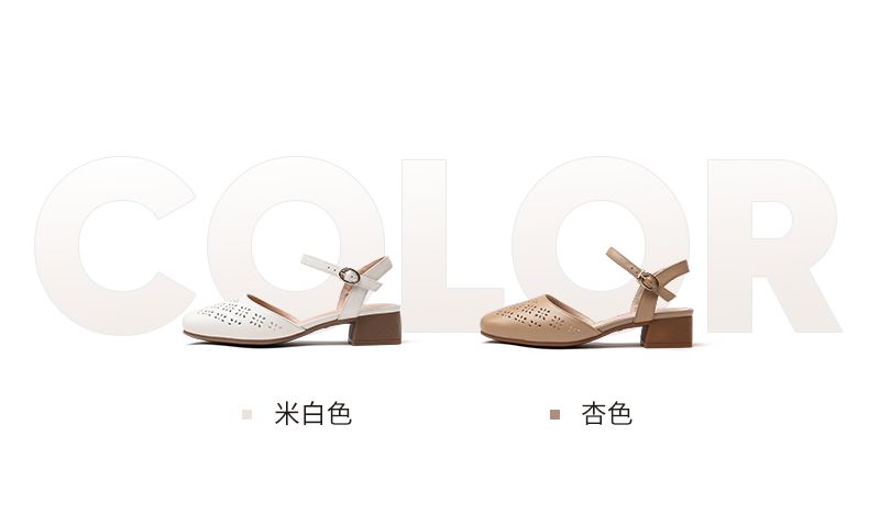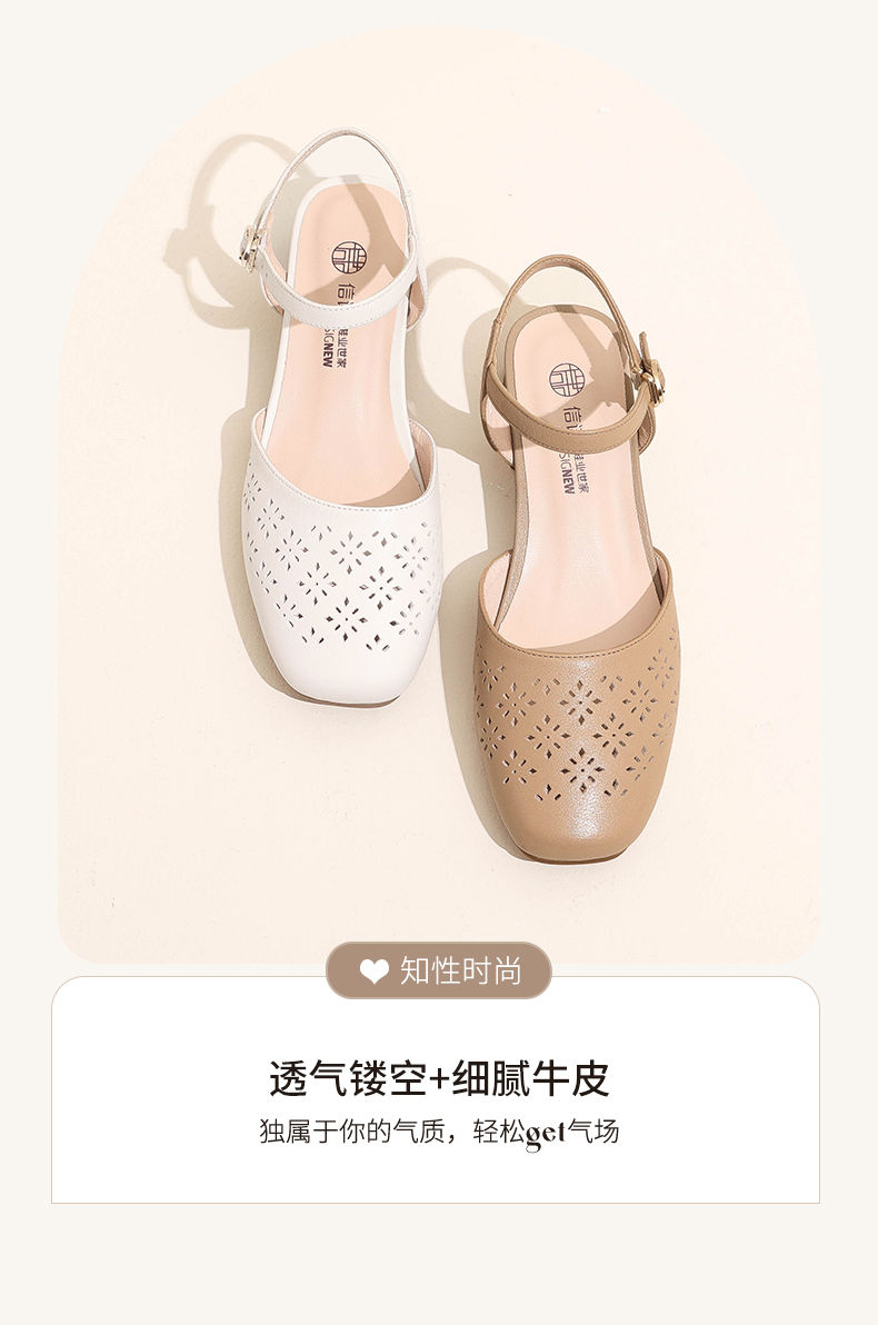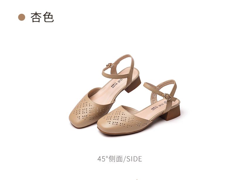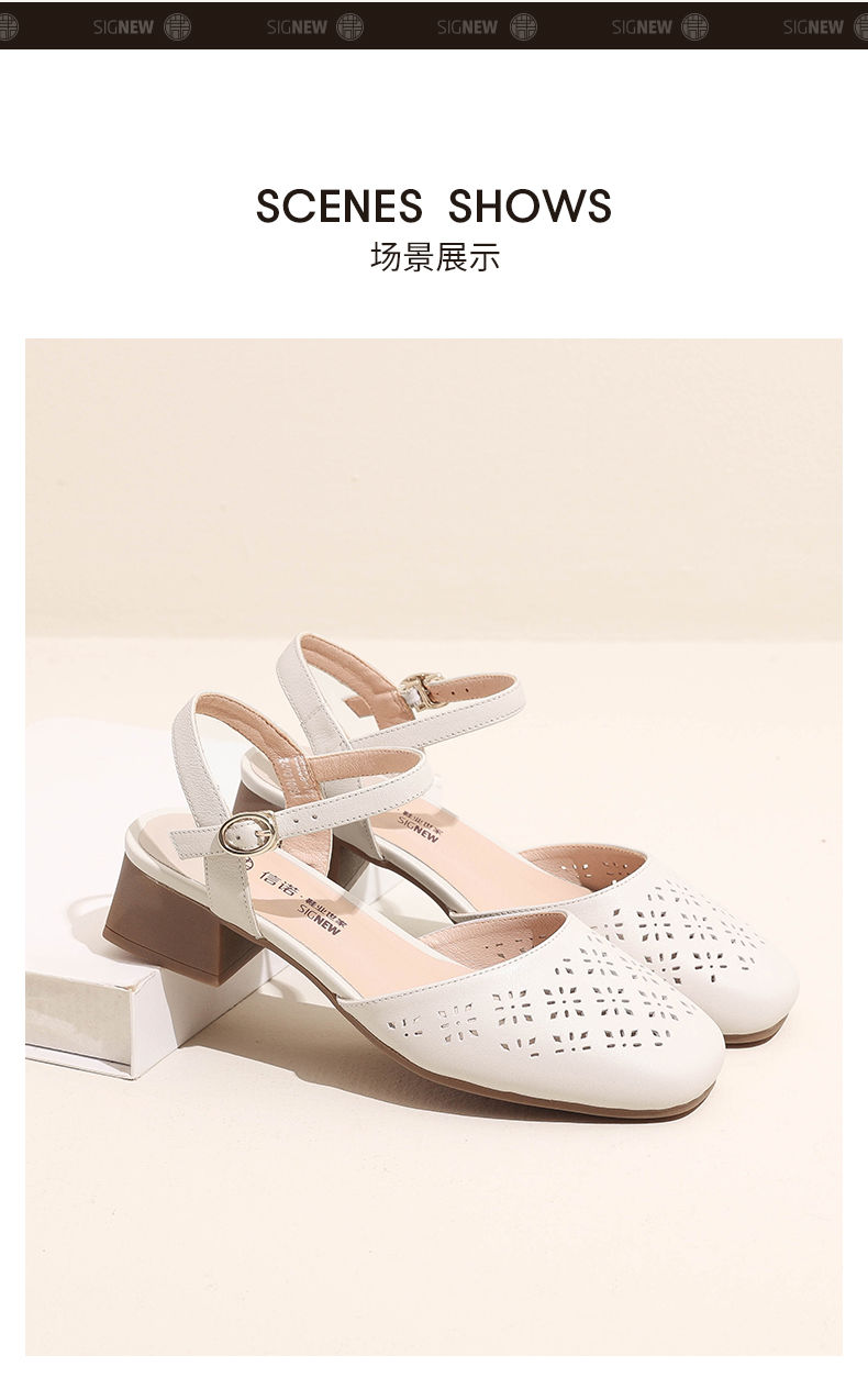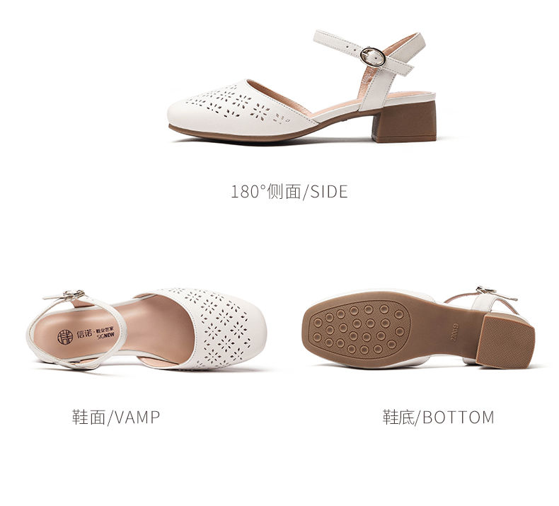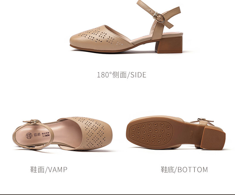 信诺 真皮包头凉鞋 2024新款夏季粗跟后空女鞋时尚镂空中跟妈妈鞋24C5009-011