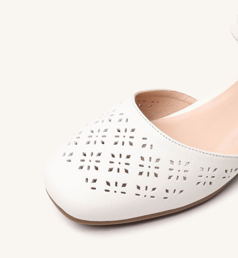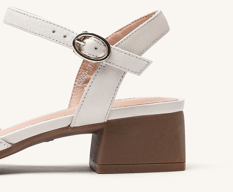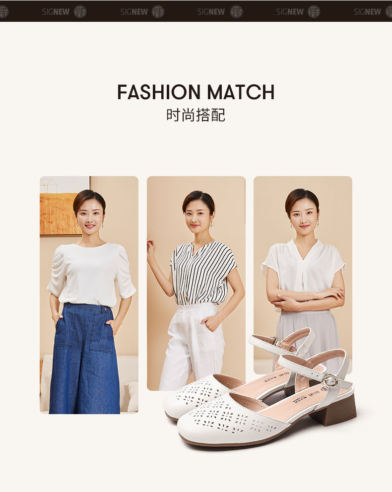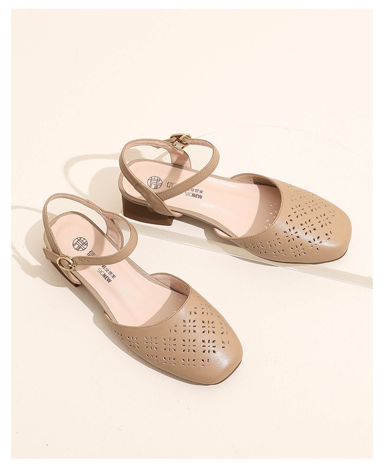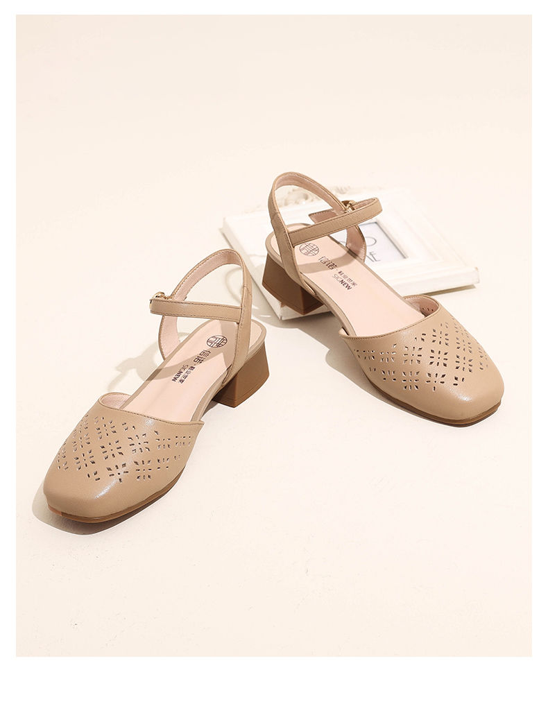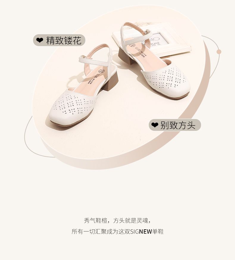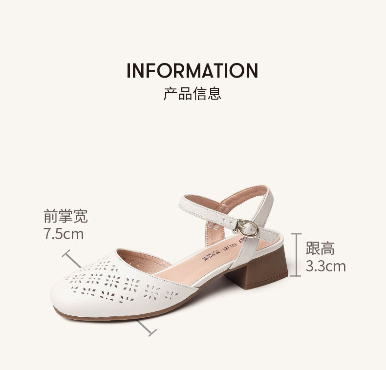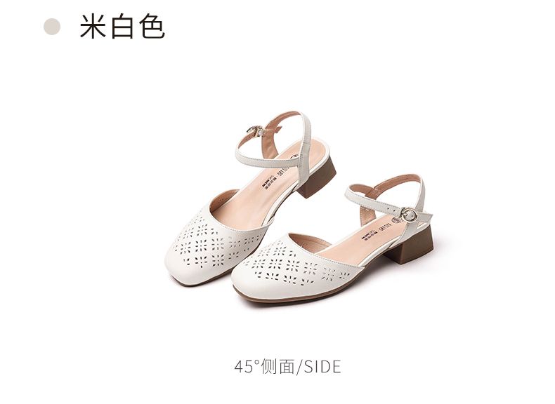 信诺 真皮包头凉鞋 2024新款夏季粗跟后空女鞋时尚镂空中跟妈妈鞋24C5009-011