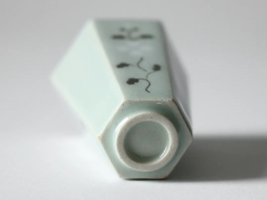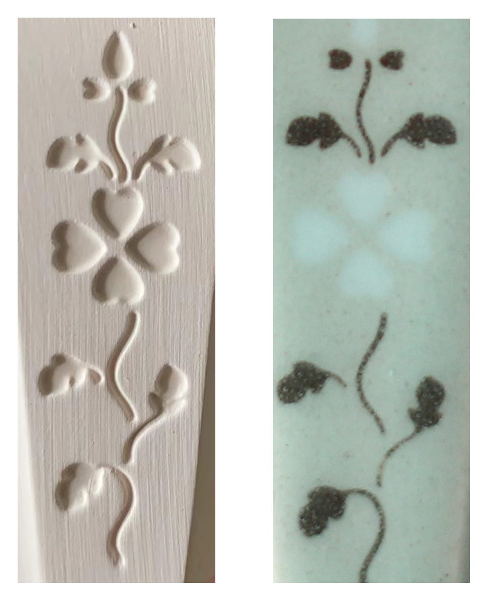 “履”即为踩的意象,对应陶瓷在“镶嵌”之前图形下凹的状态;“霜”既对应折枝花卉纹样里的那一朵小小的白花,好似霜雪般纯净柔和,又不禁让人想起古人对霜的描述,宋人曾巩说“皎如秋日浮青霜”,正好对应履霜的青釉之美。
