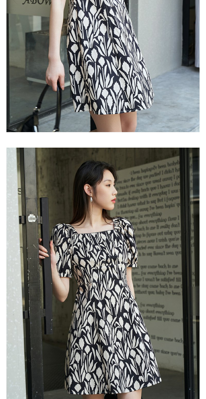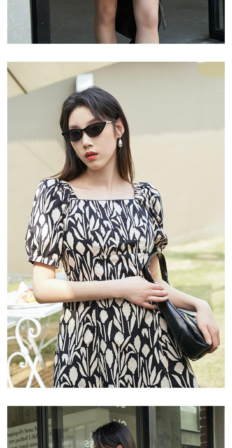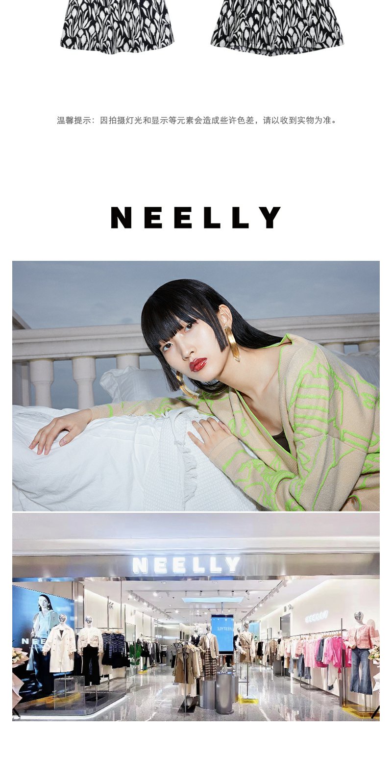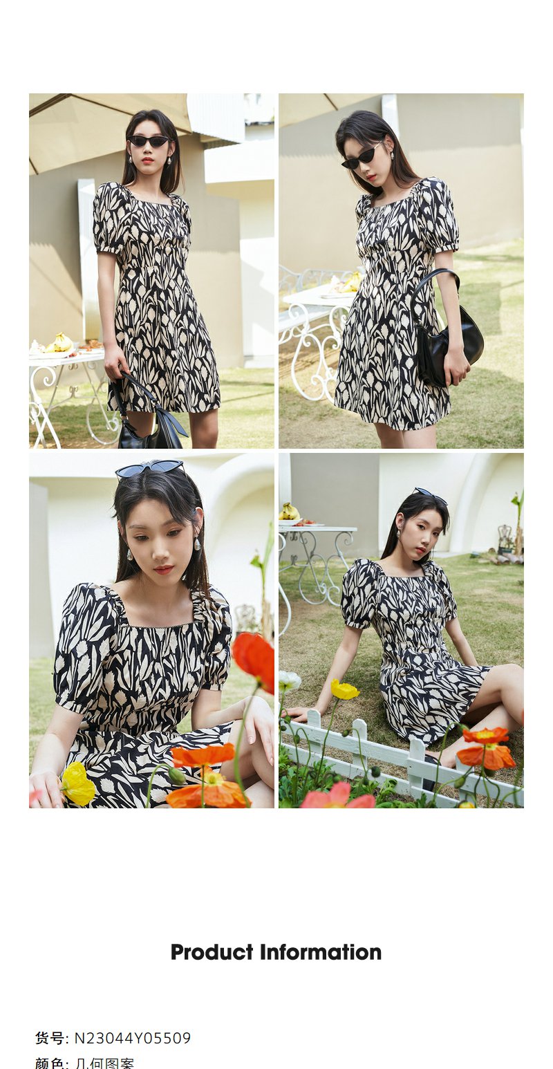NEELLY纳俪气质方领印花连衣裙女中长款显瘦收腰A字裙夏季新款潮N23044Y05509