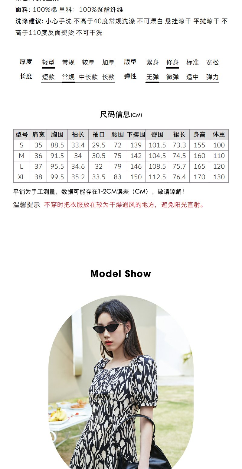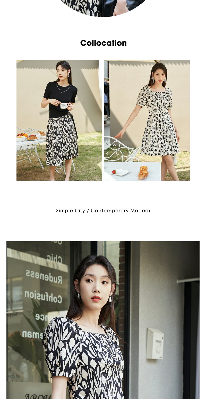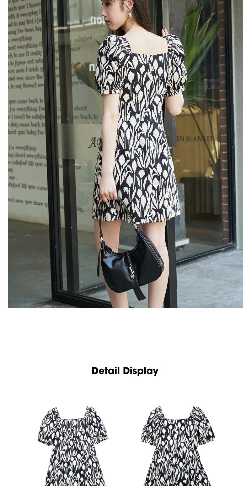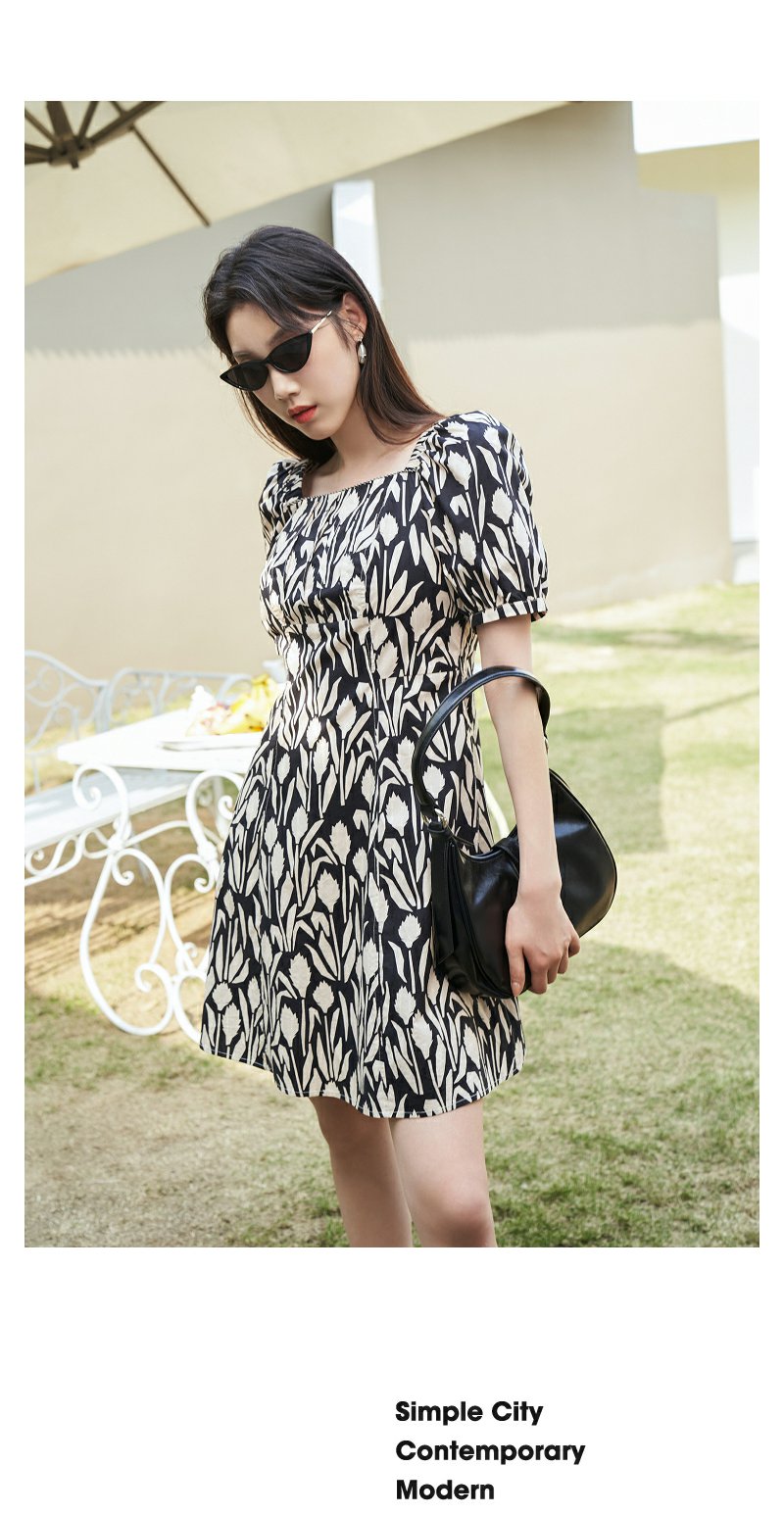 NEELLY纳俪气质方领印花连衣裙女中长款显瘦收腰A字裙夏季新款潮N23044Y05509