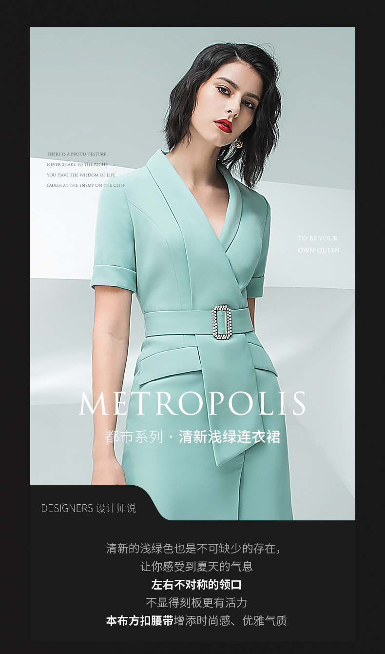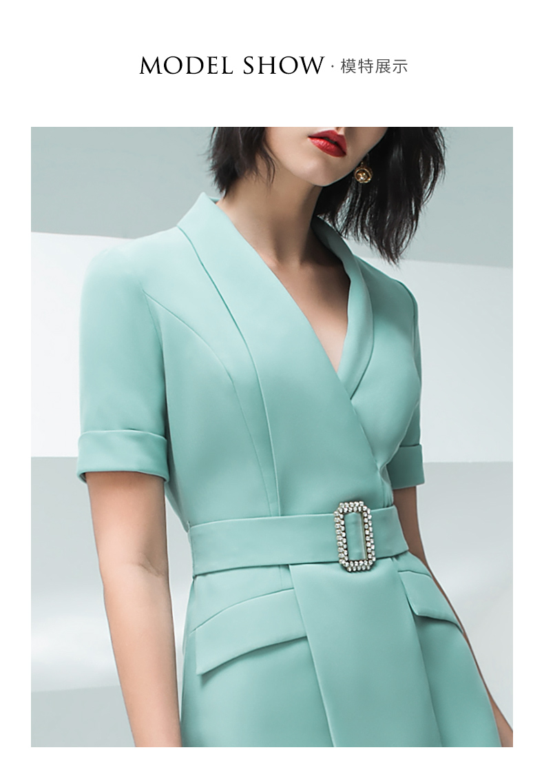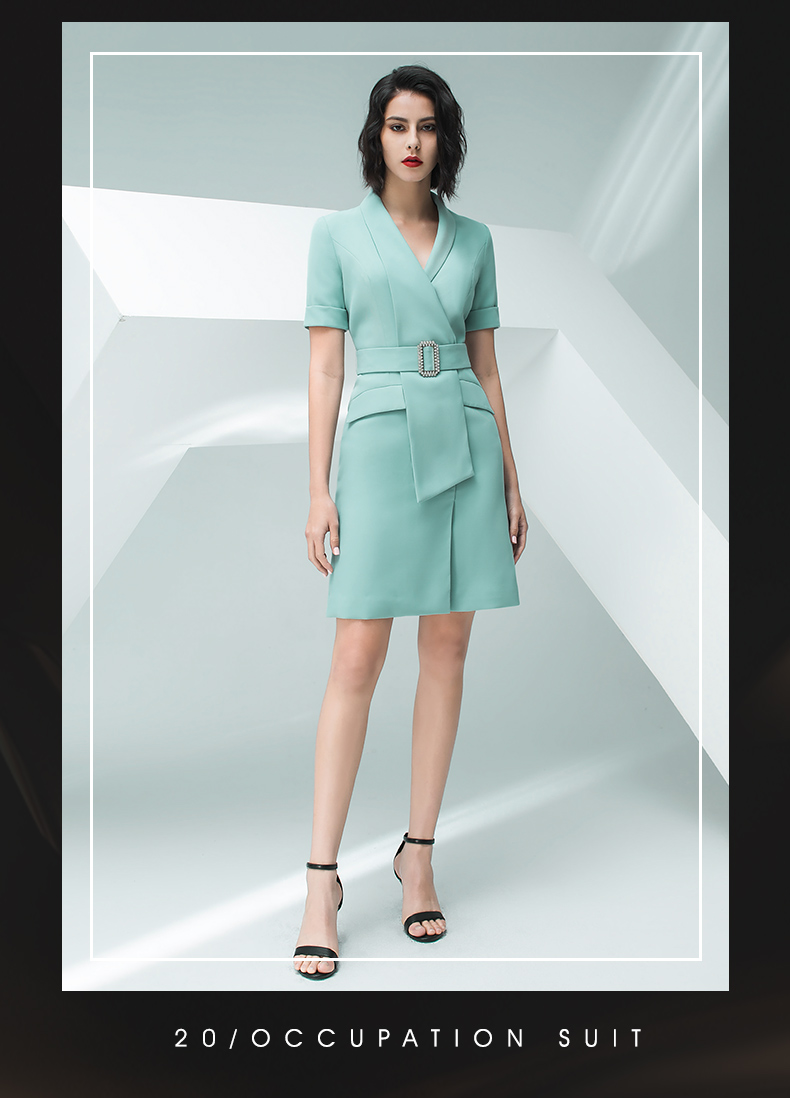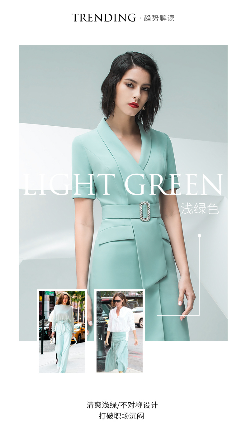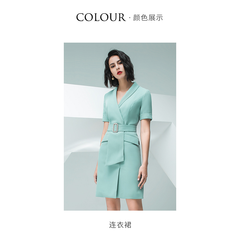 IWY/气质浅绿色短袖连衣裙女时尚职业装修身显瘦绑带连衣裙202013Q1