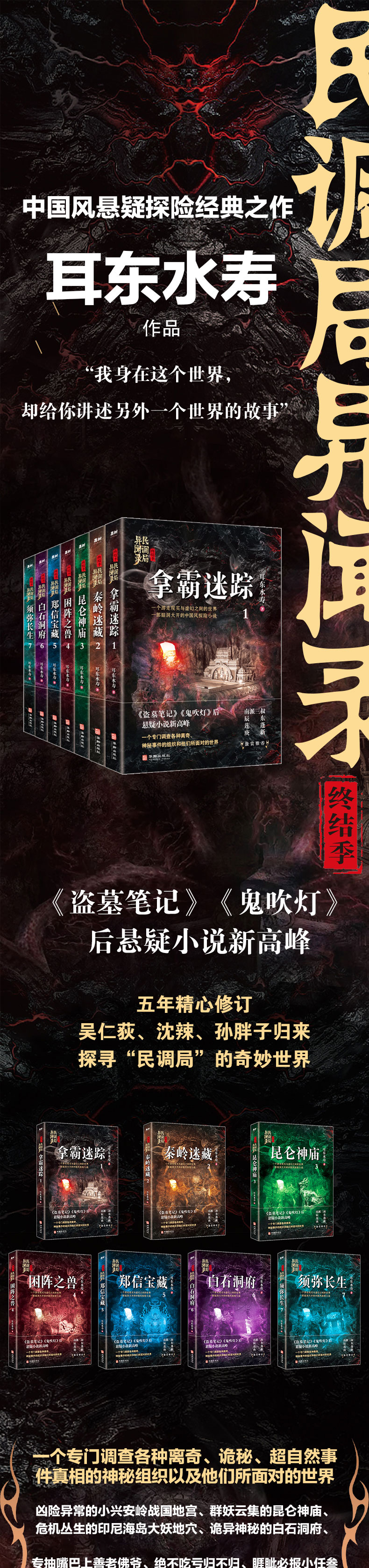 《民调局异闻录》系列塑造了一个全新的悬疑小说世界:一个专门调查各种离奇、诡异、超自然事件真相的神秘组织和他们所面对的世界。