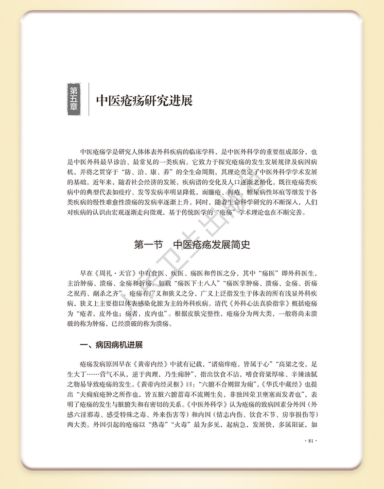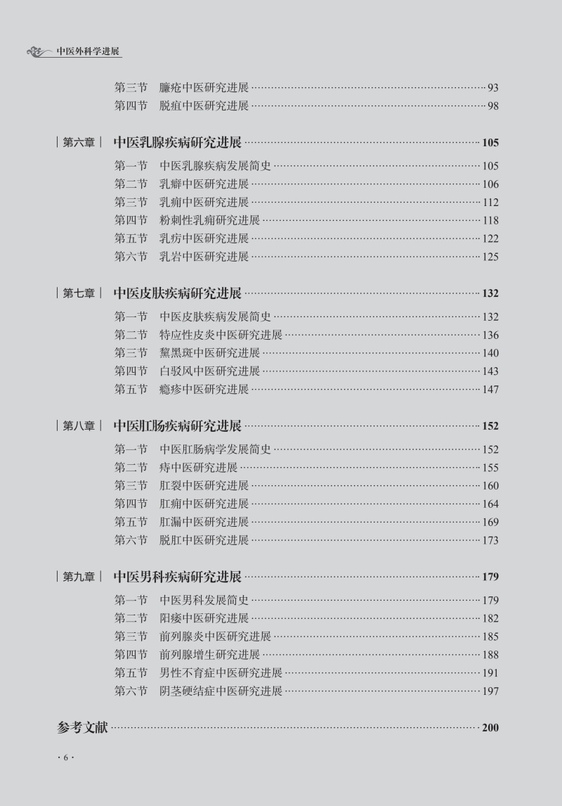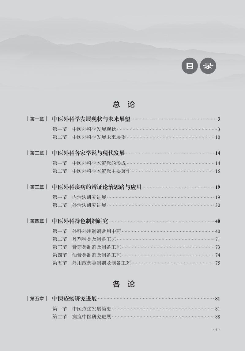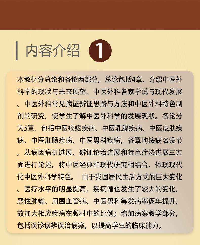 本教材分总论和各论两部分,总论包括4章,介绍中医外科学的现状与未来展望、中医外科各家学说与现代发展、中医外科常见病证辨证思路与方法和中医外科特色制剂的研究,使学生了解中医外科学的发展现状。各论分为5章,包括中医疮疡疾病、中医乳腺疾病、中医皮肤疾病、中医肛肠疾病、中医男科疾病,各章均按病名设节,从病因病机进展、辨证论治进展和特色疗法进展三方面进行论述,将中医经典和现代研究相结合,体现现代化中医外科学特色。 由于我国居民生活方式的巨大变化、医疗水平的明显提高,疾病谱也发生了较大的变化,恶性肿瘤、周围血管病、中医男科等发病率逐年提升,故加大相应疾病在教材中的比例;增加病案教学部分,包括误诊误辨误治病案,以提高学生的临床能力。