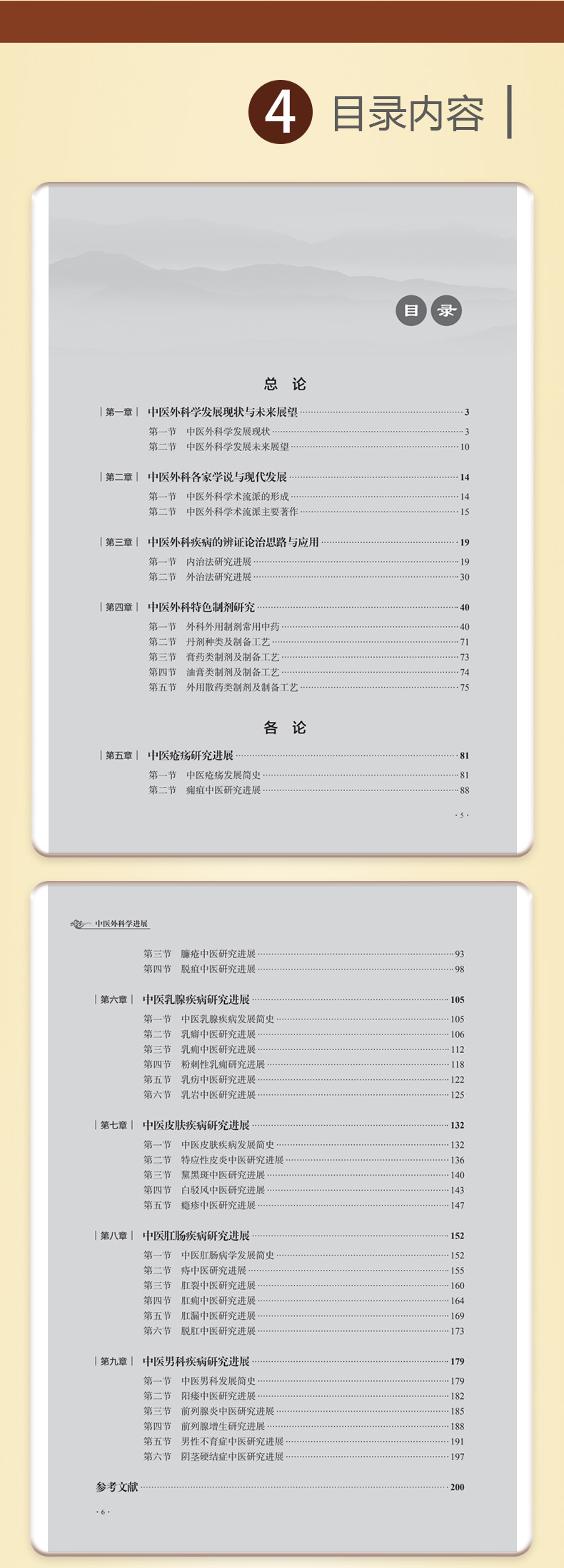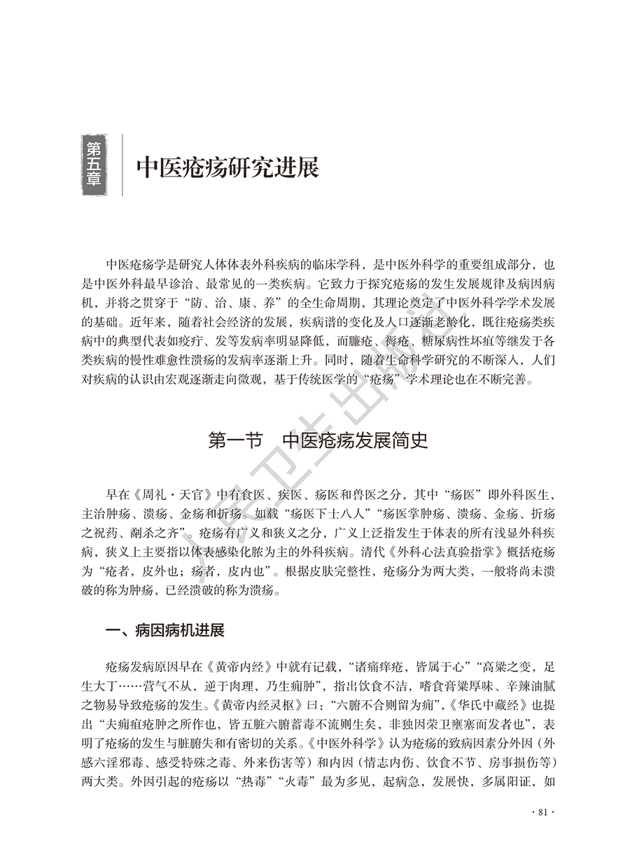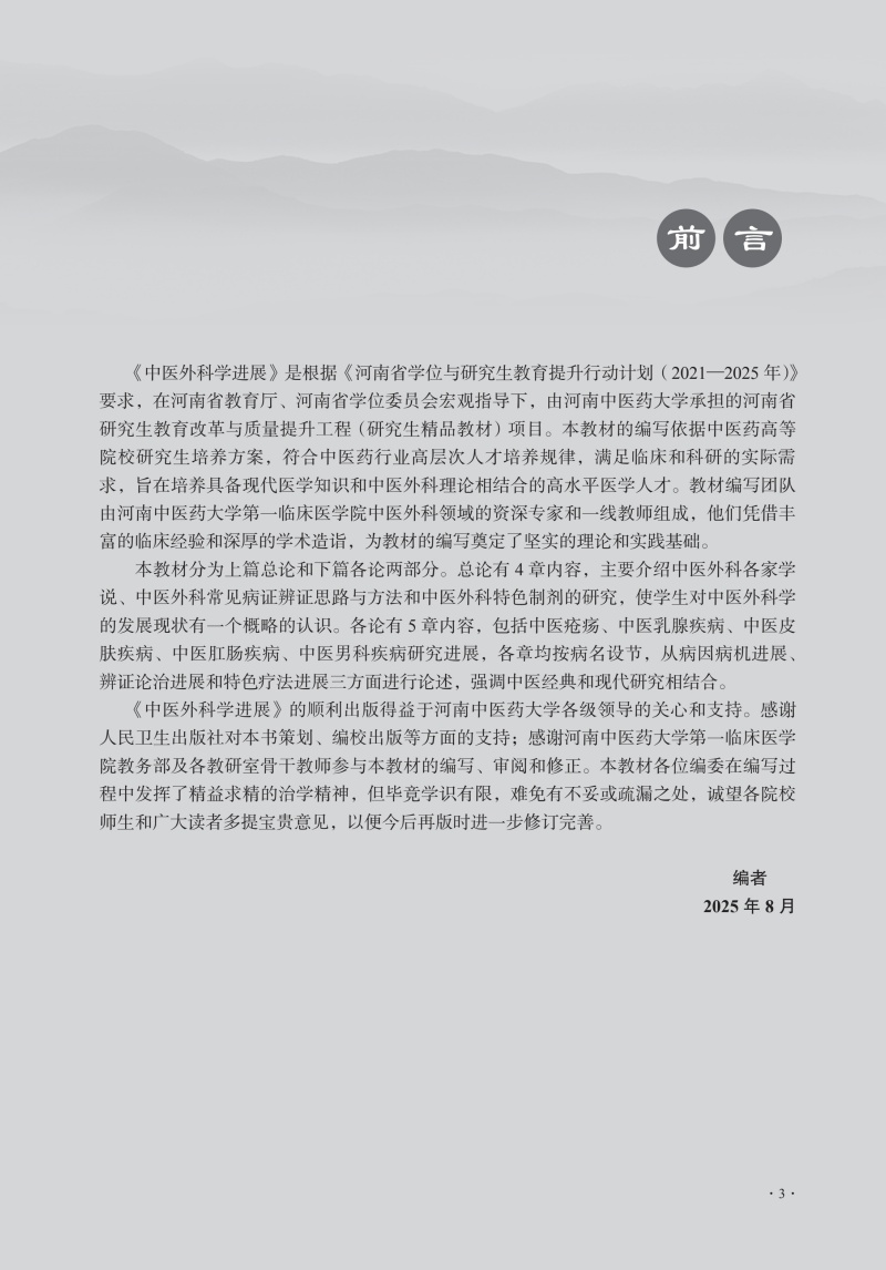 本教材分总论和各论两部分,总论包括4章,介绍中医外科学的现状与未来展望、中医外科各家学说与现代发展、中医外科常见病证辨证思路与方法和中医外科特色制剂的研究,使学生了解中医外科学的发展现状。各论分为5章,包括中医疮疡疾病、中医乳腺疾病、中医皮肤疾病、中医肛肠疾病、中医男科疾病,各章均按病名设节,从病因病机进展、辨证论治进展和特色疗法进展三方面进行论述,将中医经典和现代研究相结合,体现现代化中医外科学特色。 由于我国居民生活方式的巨大变化、医疗水平的明显提高,疾病谱也发生了较大的变化,恶性肿瘤、周围血管病、中医男科等发病率逐年提升,故加大相应疾病在教材中的比例;增加病案教学部分,包括误诊误辨误治病案,以提高学生的临床能力。