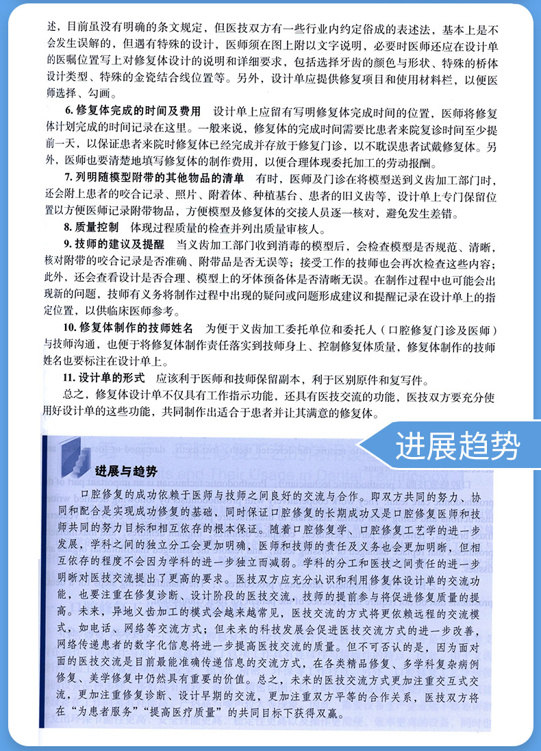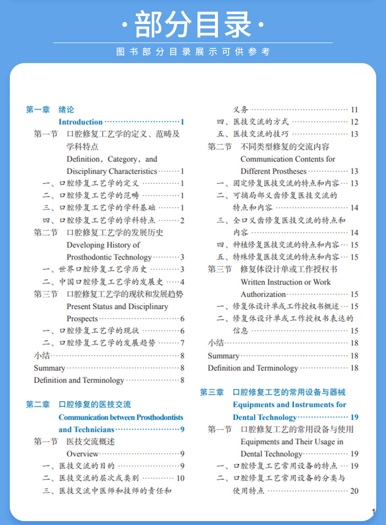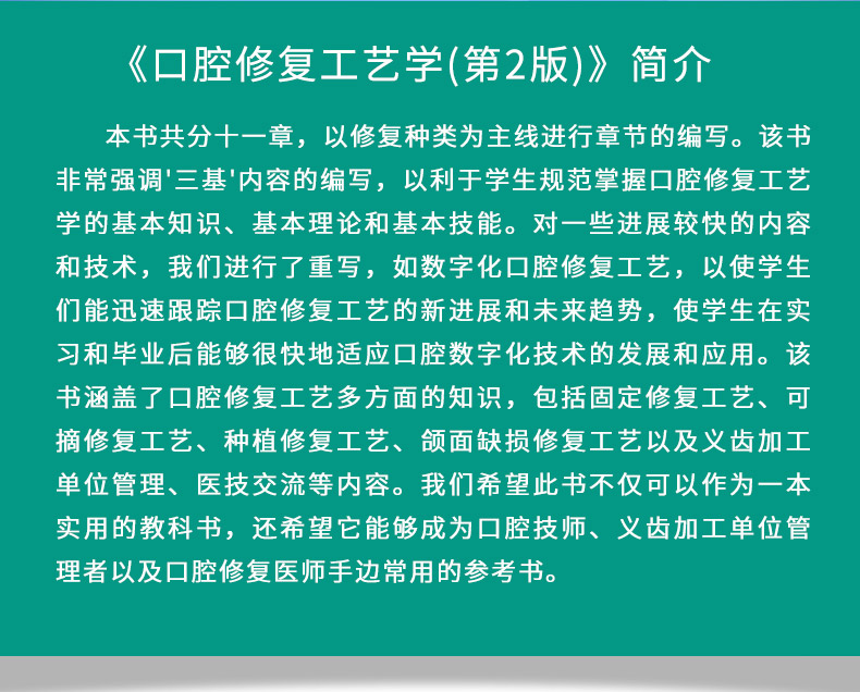 本书承袭了上版的结构和内容,共分十一章,以修复种类为主线进行章节的编写。本书非常强调“三基”内容的编写,以利于学生规范掌握口腔修复工艺学的基本知识、基本理论和基本技能。对一些进展较快的内容和技术,我们进行了重写,如数字化口腔修复工艺,以使学们能迅速跟踪口腔修复工艺的最新进展和未来趋势,使学生在实习和毕业后能够很快地适应口腔数字化技术的发展和应用。本书涵盖了口腔修复工艺多方面的知识,包括固定修复工艺、可摘修复工艺、种植修复工艺、颌面缺损修复工艺以及义齿加工单位管理、医技交流等内容。