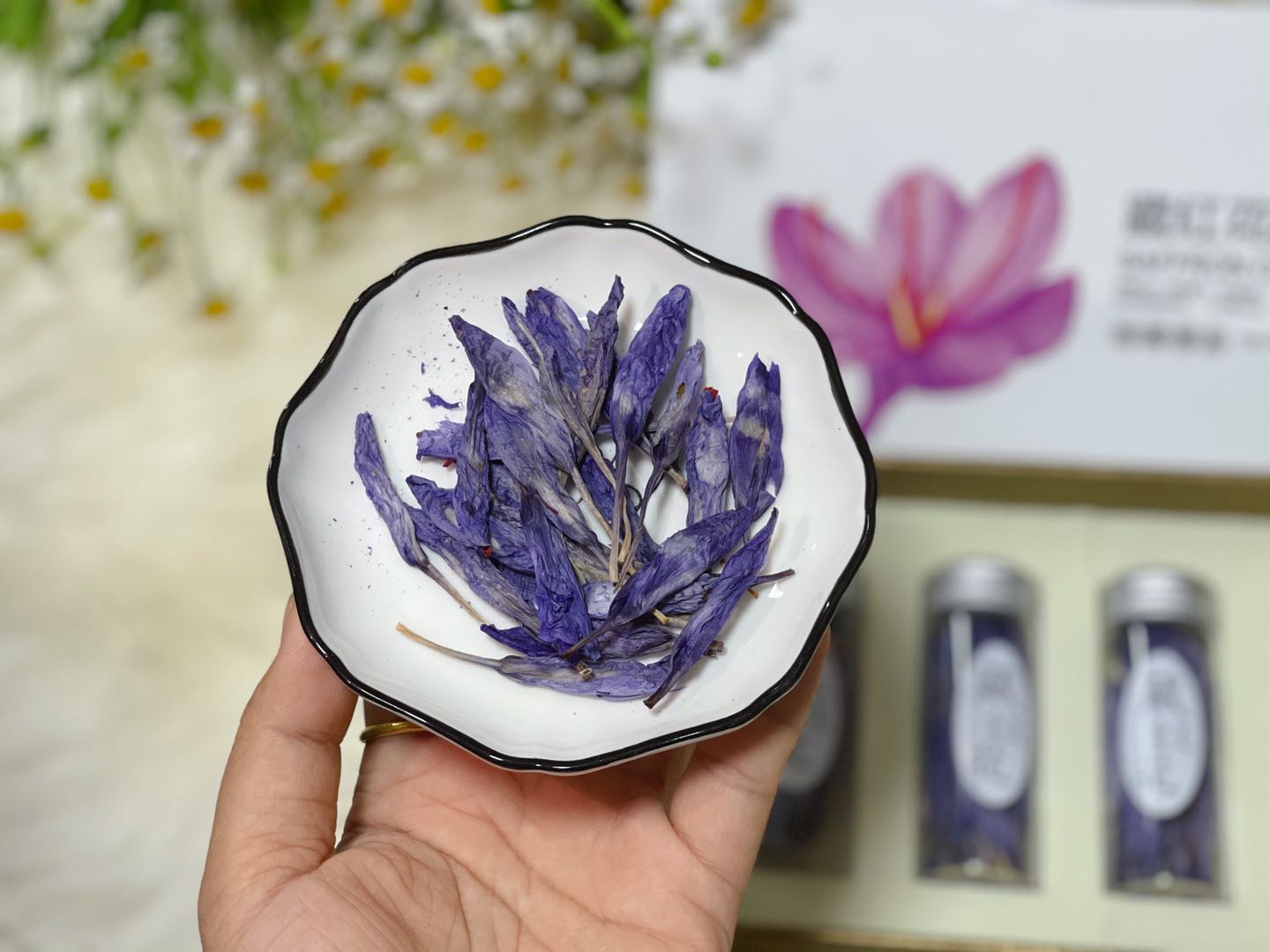 藏红花原花中含有的有效成分与藏红花花丝中含有的基本相同,紫色花瓣含有一定的花青素,能抗氧化,延缓衰老的功效~