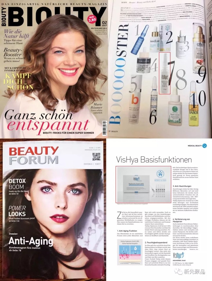 德国专业的《BIOUTY》、《BEAUTY FORUM》两大化妆品杂志推荐。被誉为“世界级的玻尿酸”和“拯救肌肤的奇迹水”等。