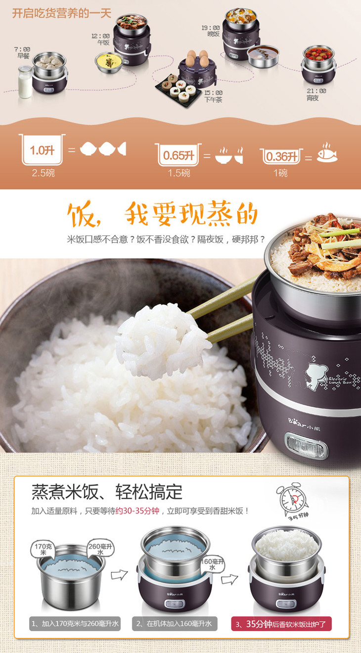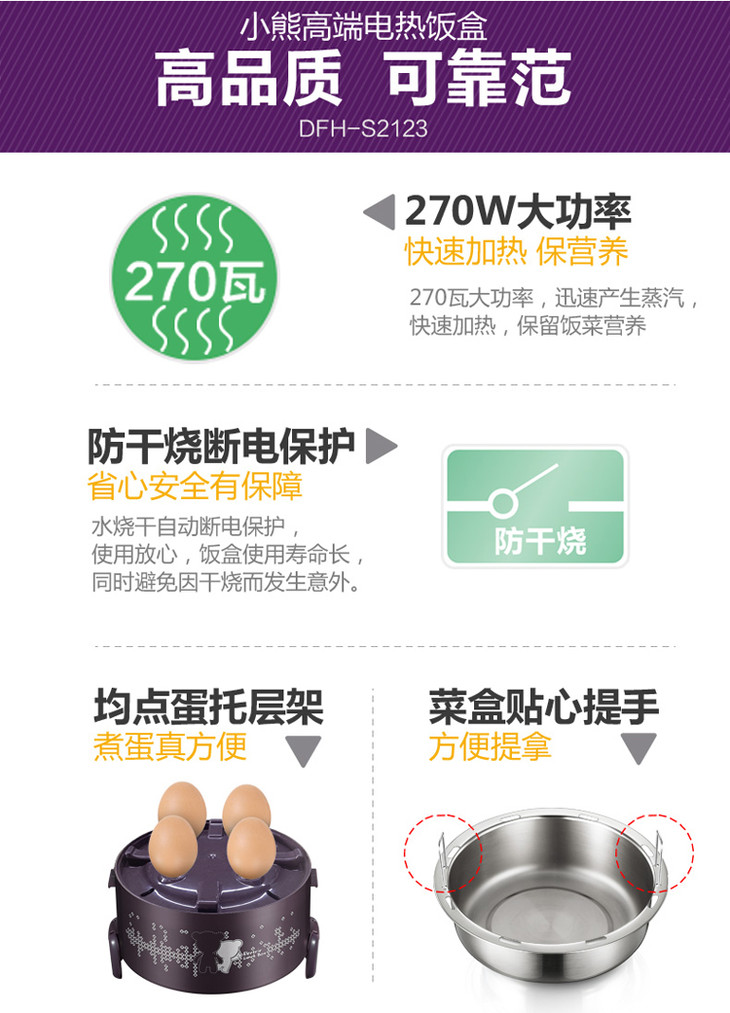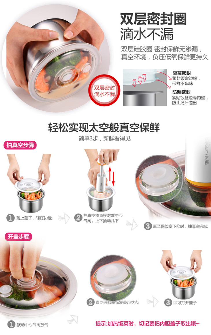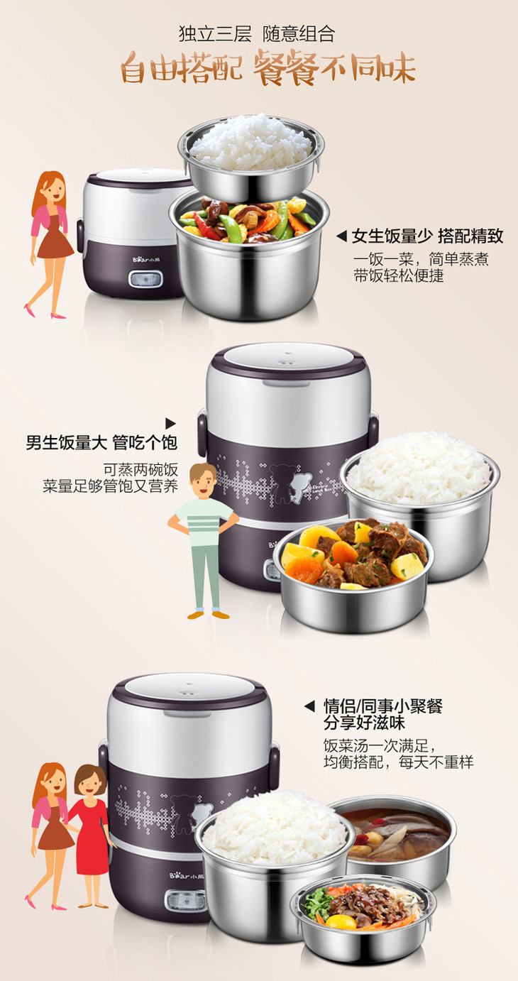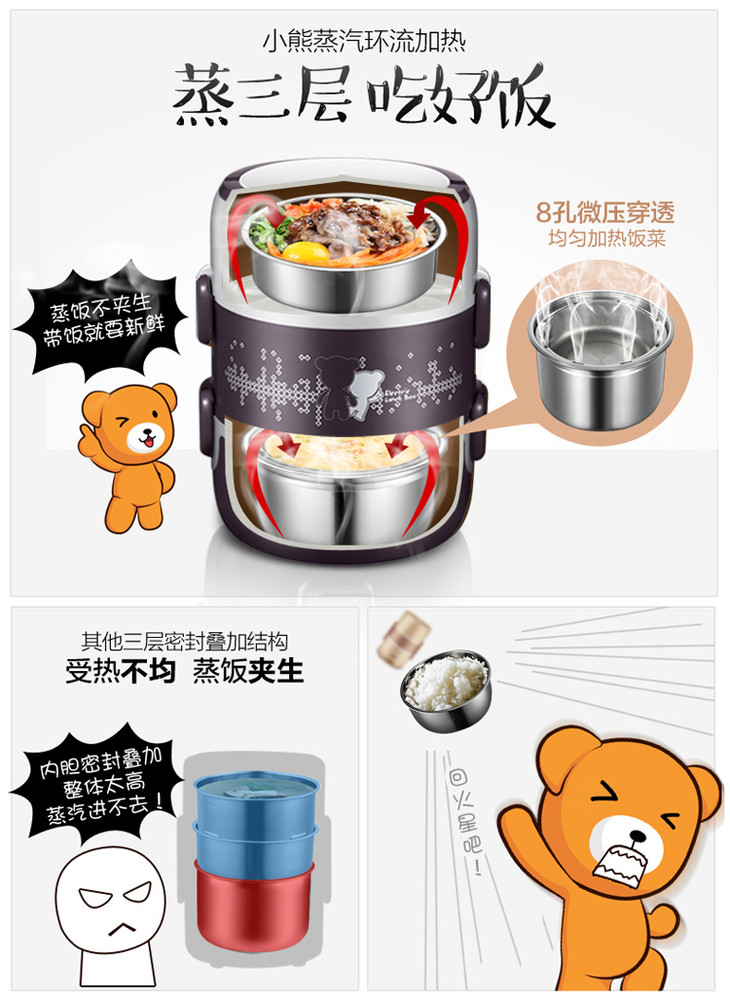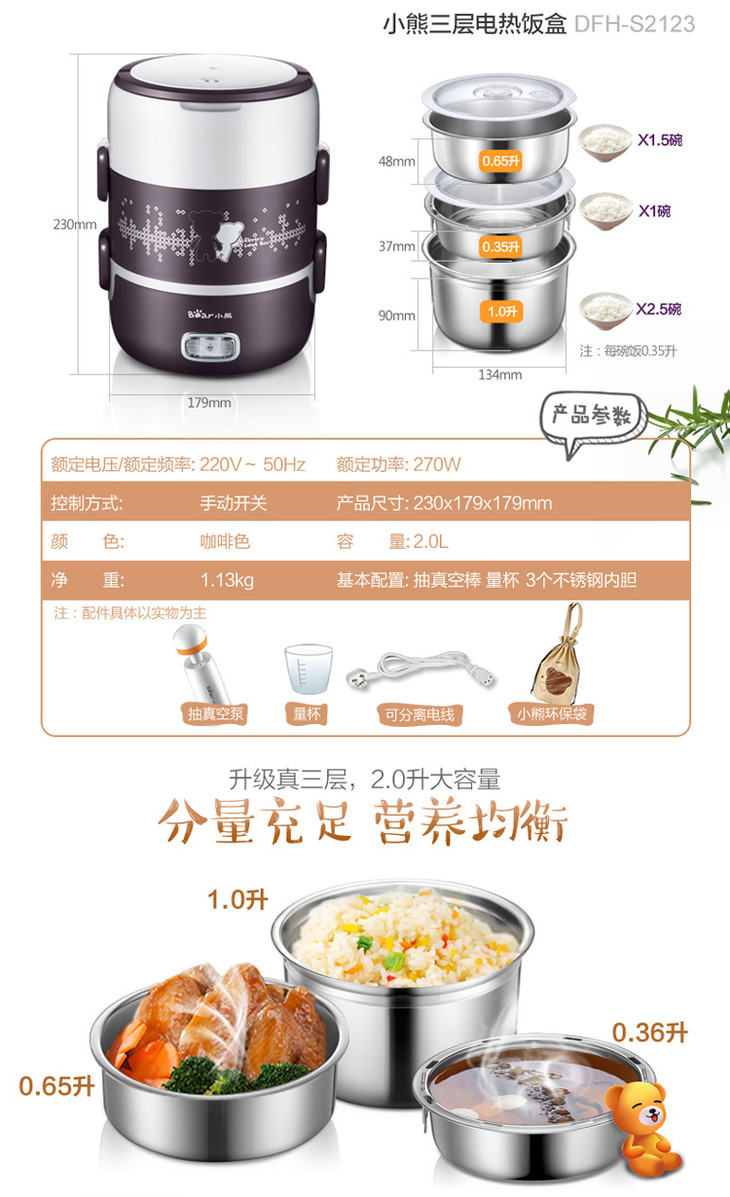 小熊(Bear)电热饭盒 2L三层加热饭盒上班族蒸热饭器可插电保温不锈钢可抽真空 DFH-S2123