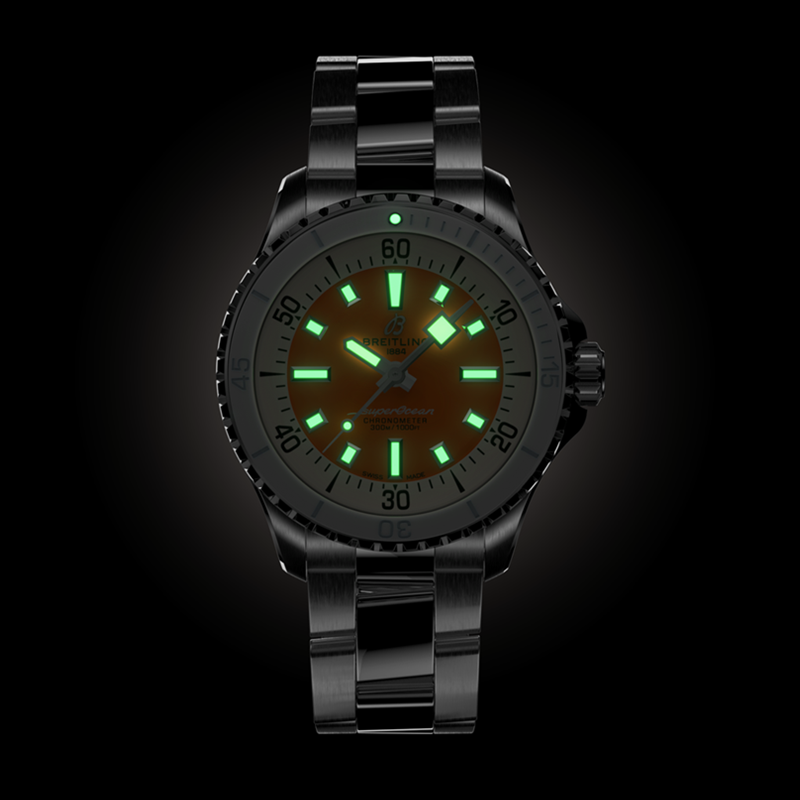 镜面 材质 | 蓝宝石水晶玻璃 | 表盘 | 精钢表壳 棘轮式单向旋转陶瓷镶嵌表圈 橙色表盘,Super-LumiNova®夜光数字、时针和分针 旋入式表冠,双密封垫 密底 |
