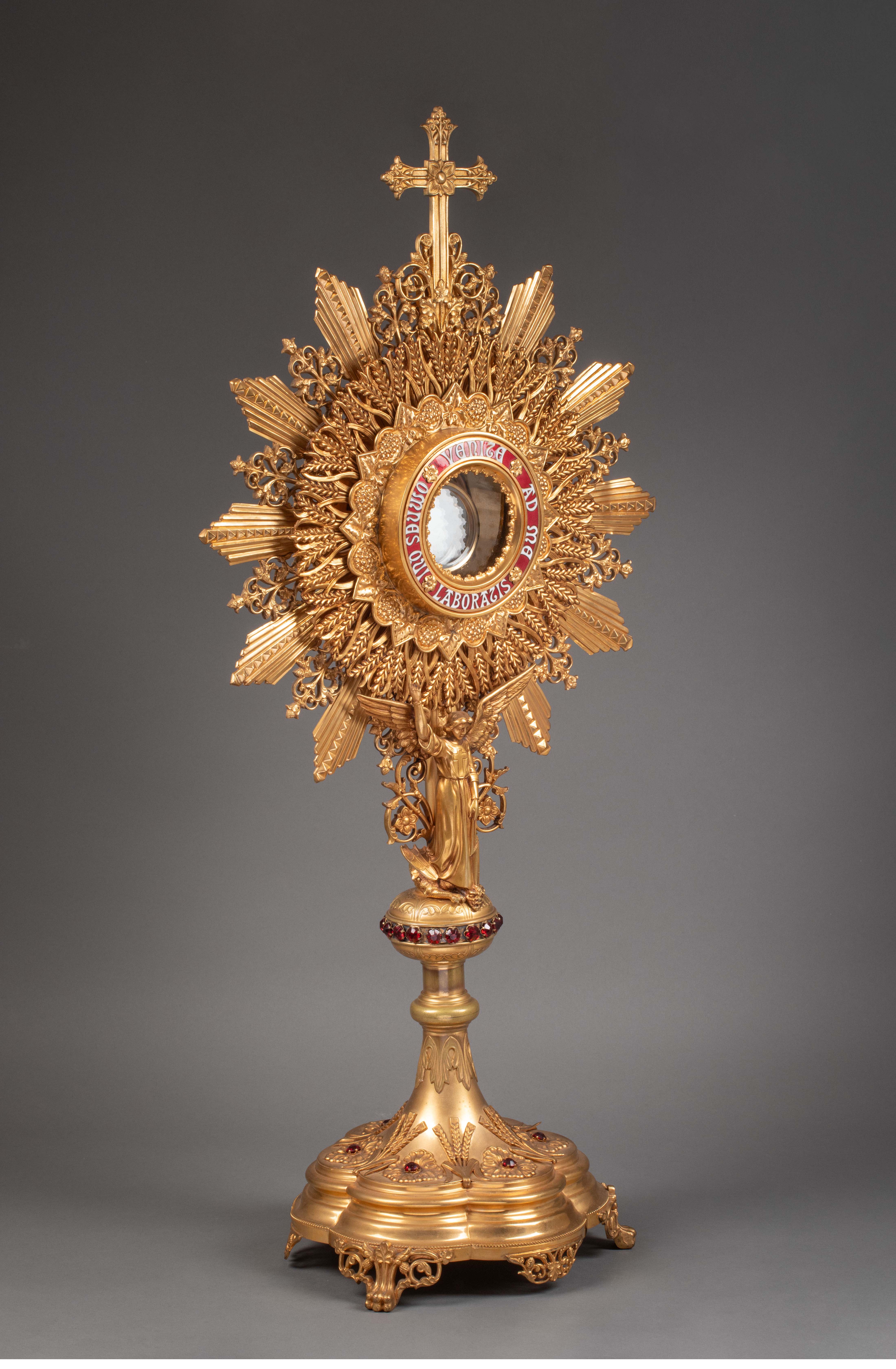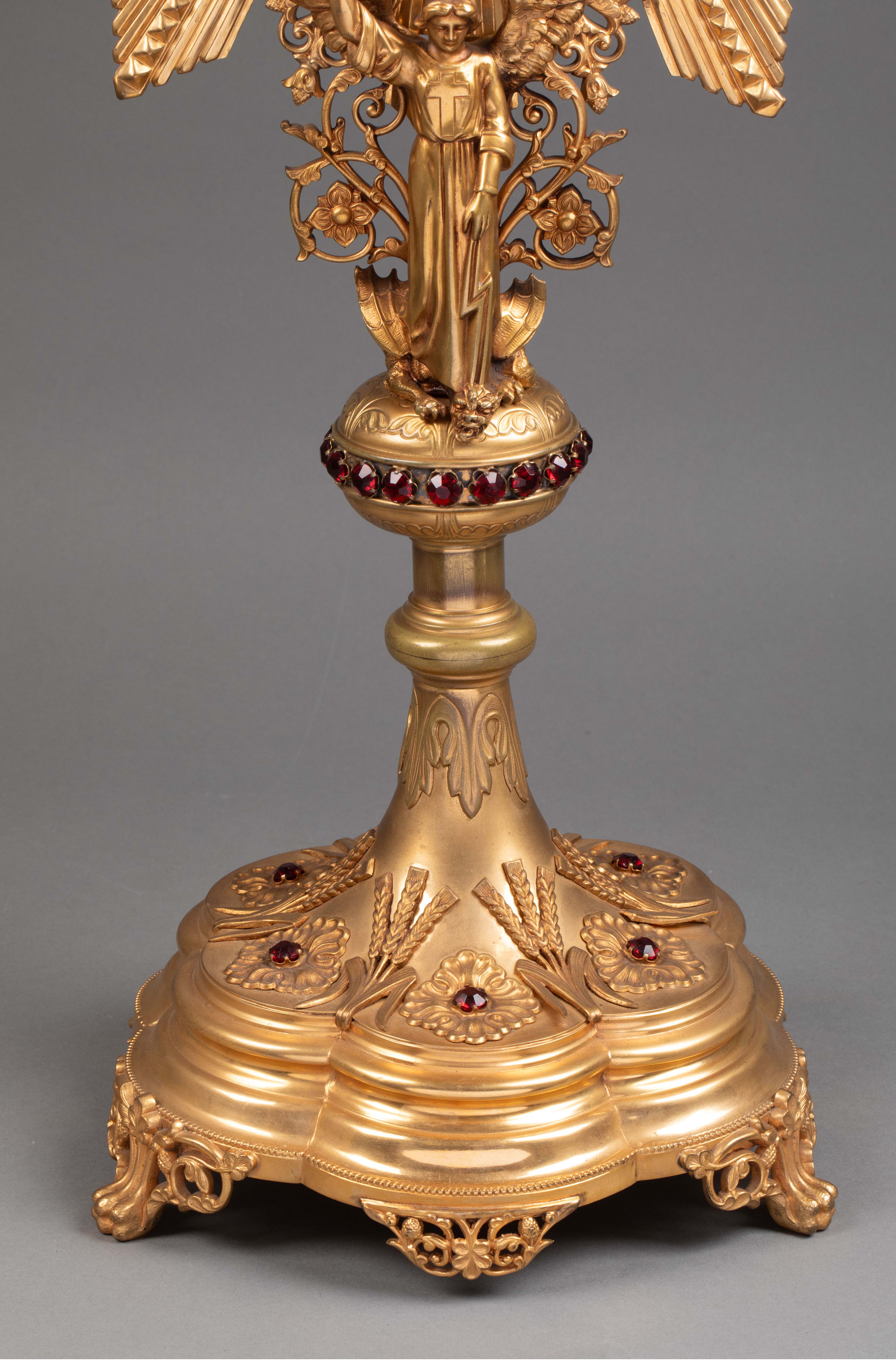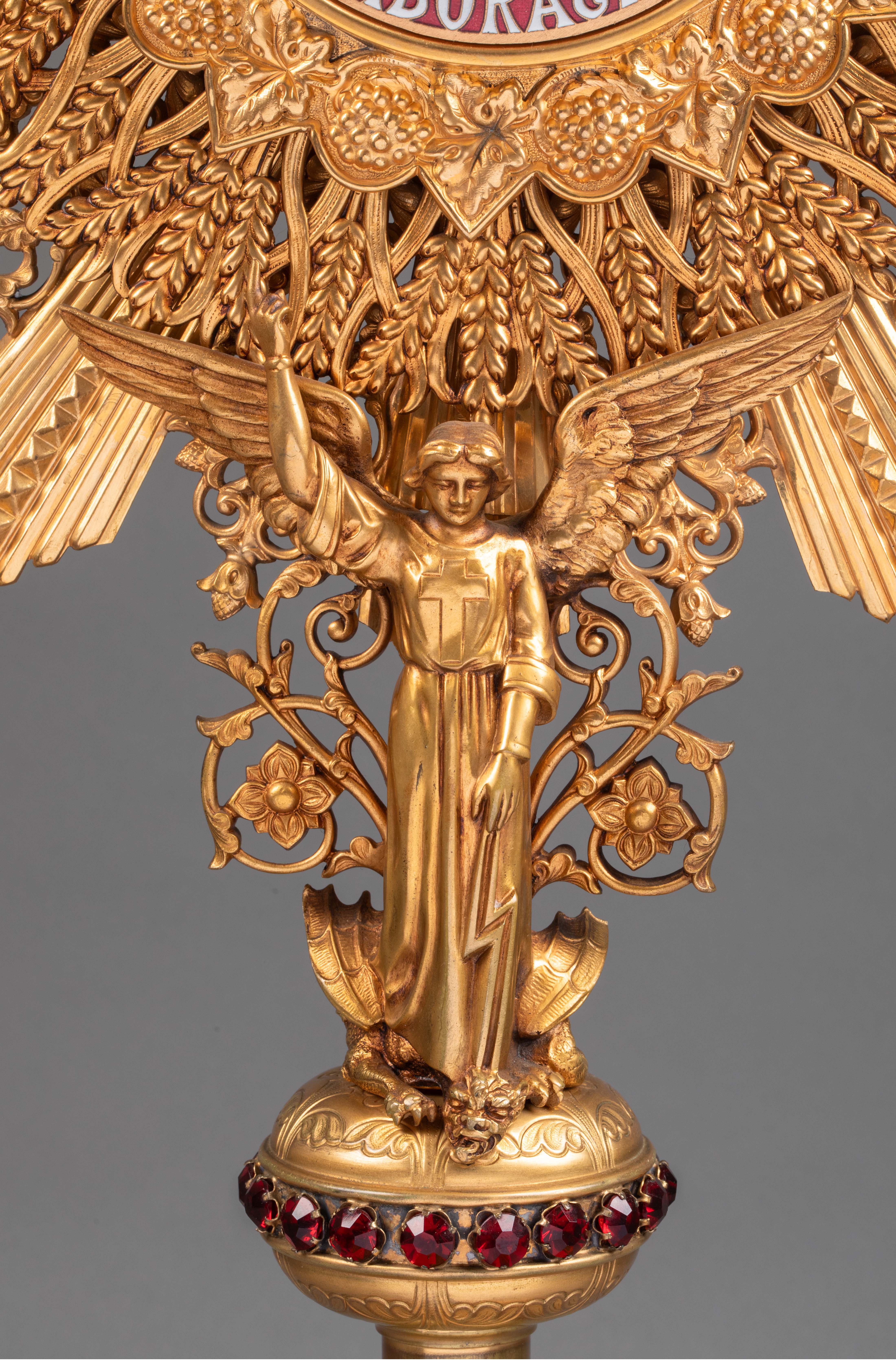 19世纪法国出品新哥特风格圣米迦勒屠龙主题铜鎏金精雕镶嵌红宝石珐琅彩绘圣体光座