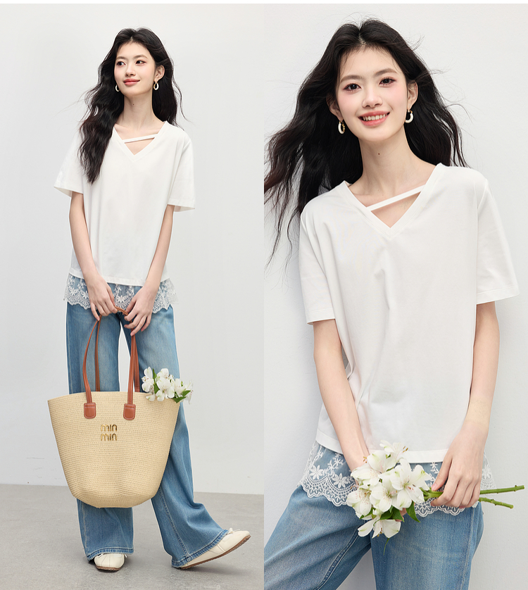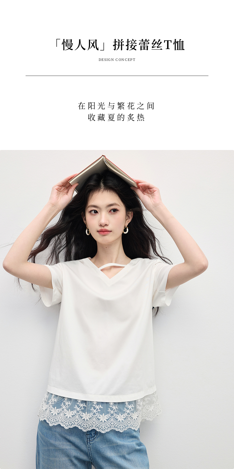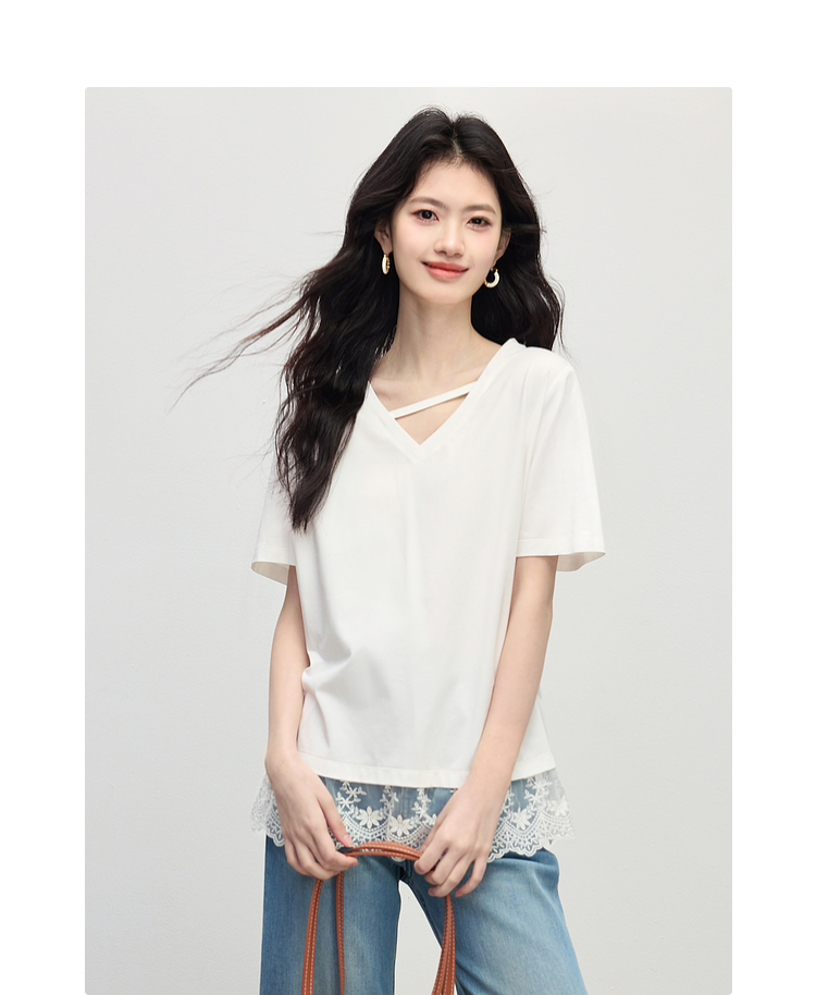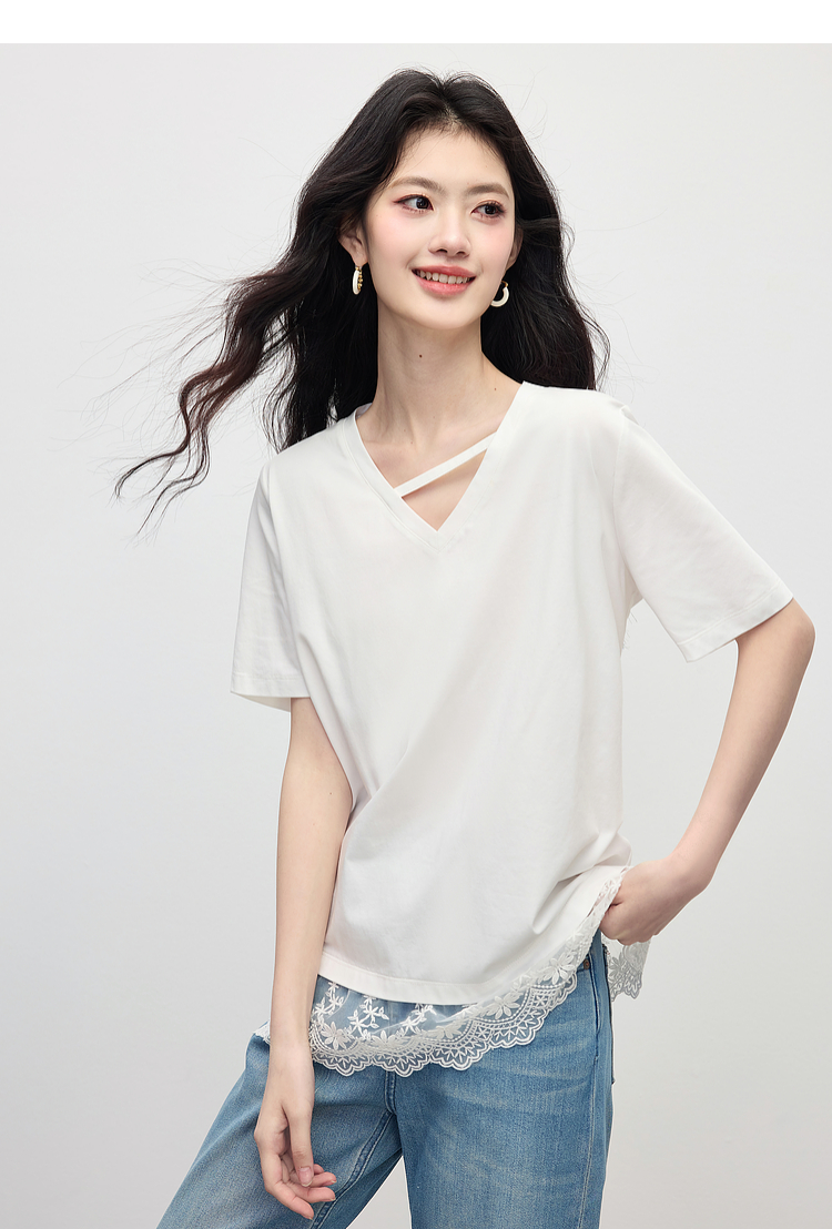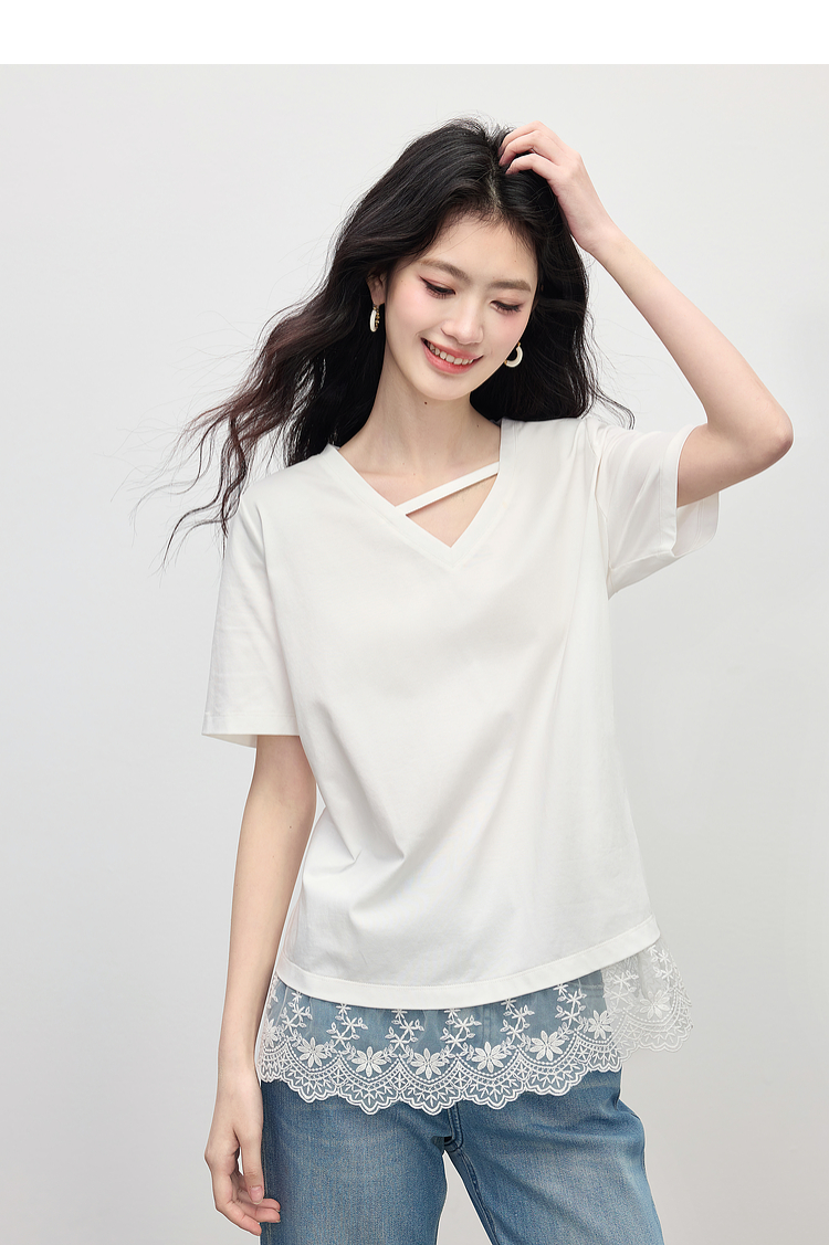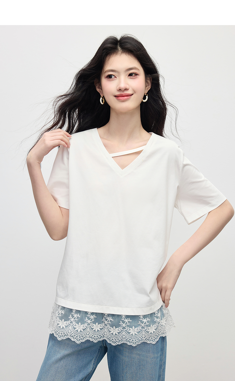 【专属特价】熙世界白色蕾丝拼接短袖T恤女2025年夏季新款宽松休闲独特V领上衣