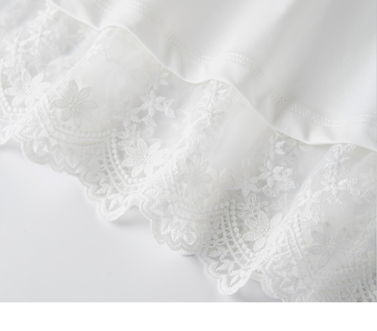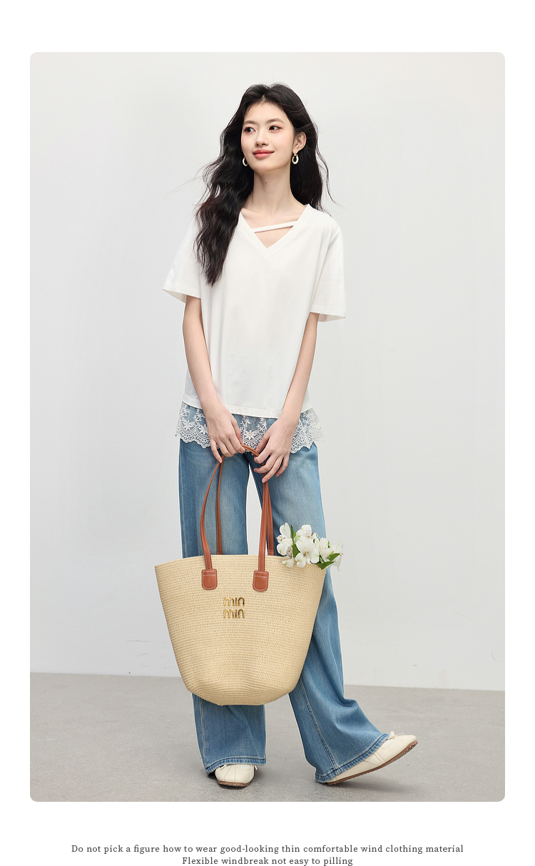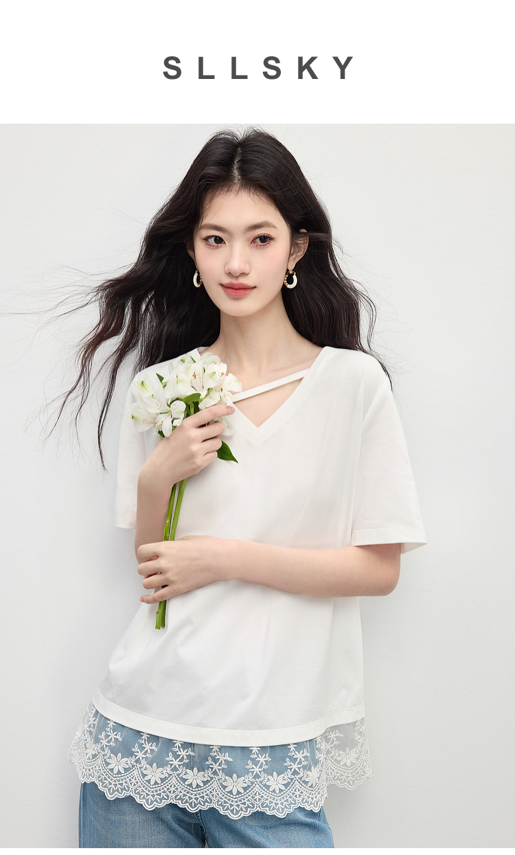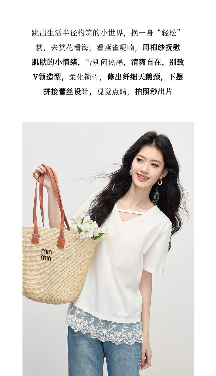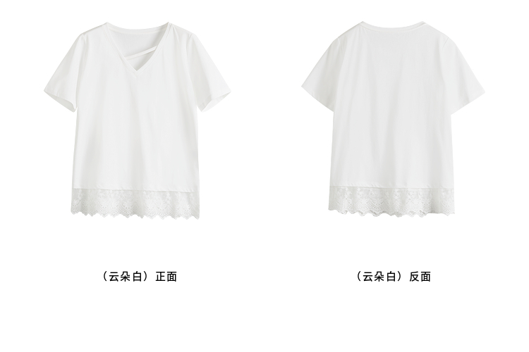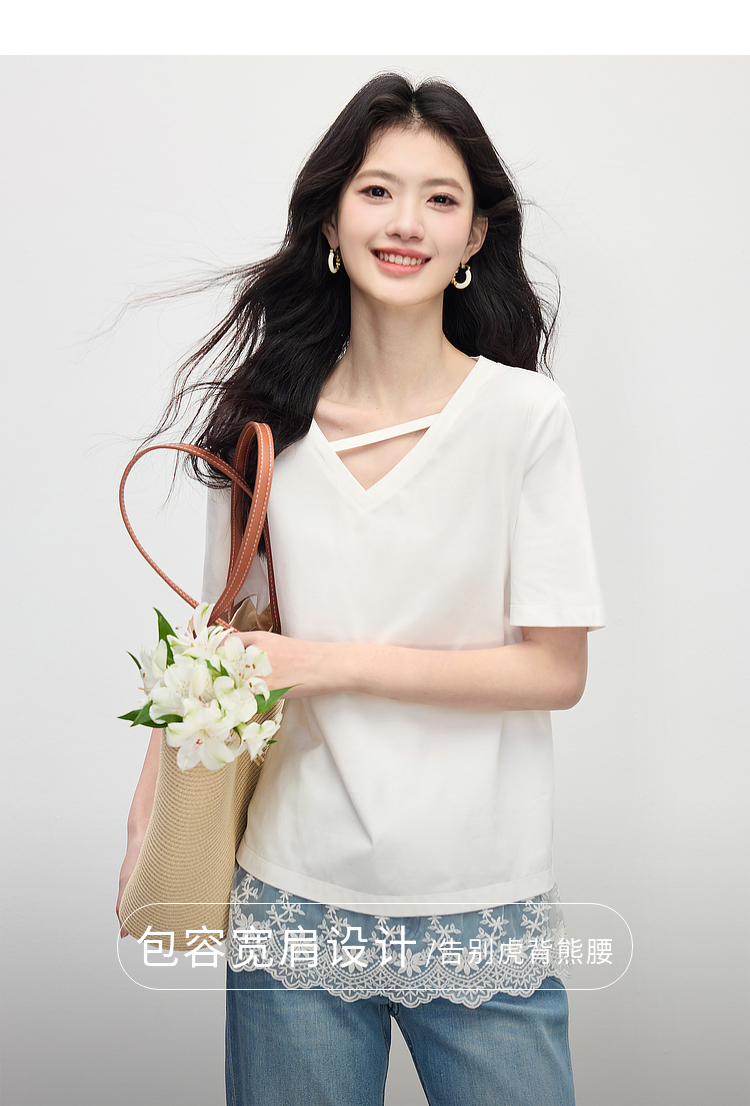 【专属特价】熙世界白色蕾丝拼接短袖T恤女2025年夏季新款宽松休闲独特V领上衣