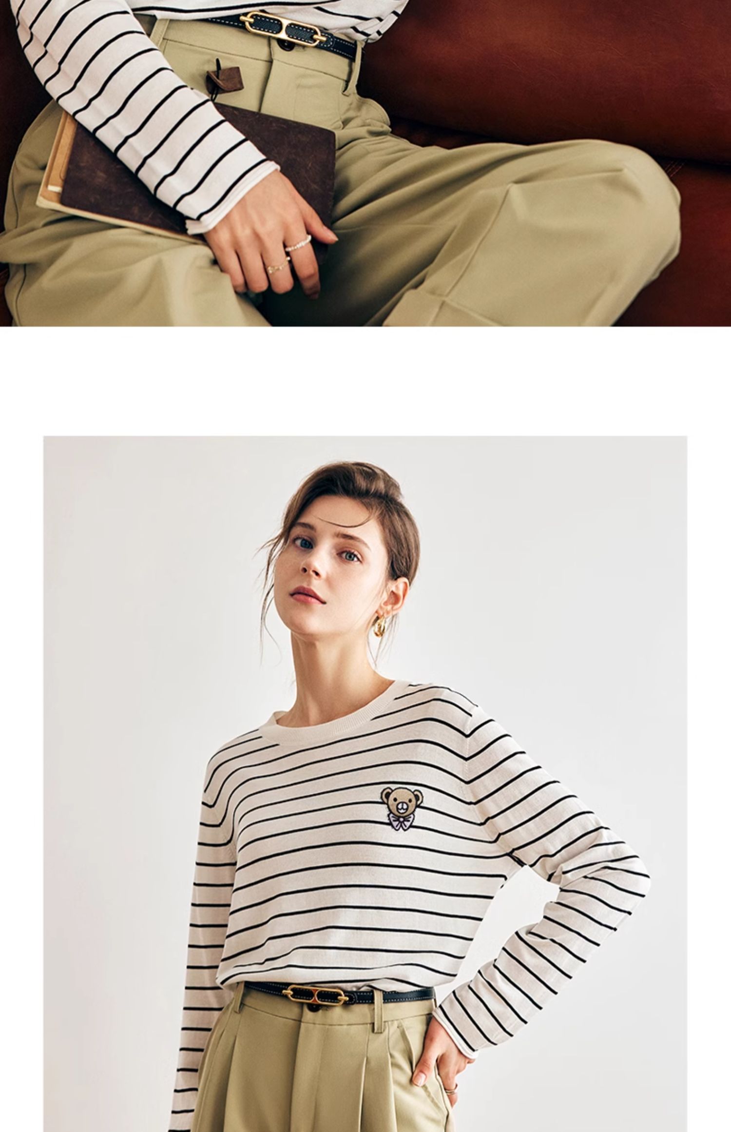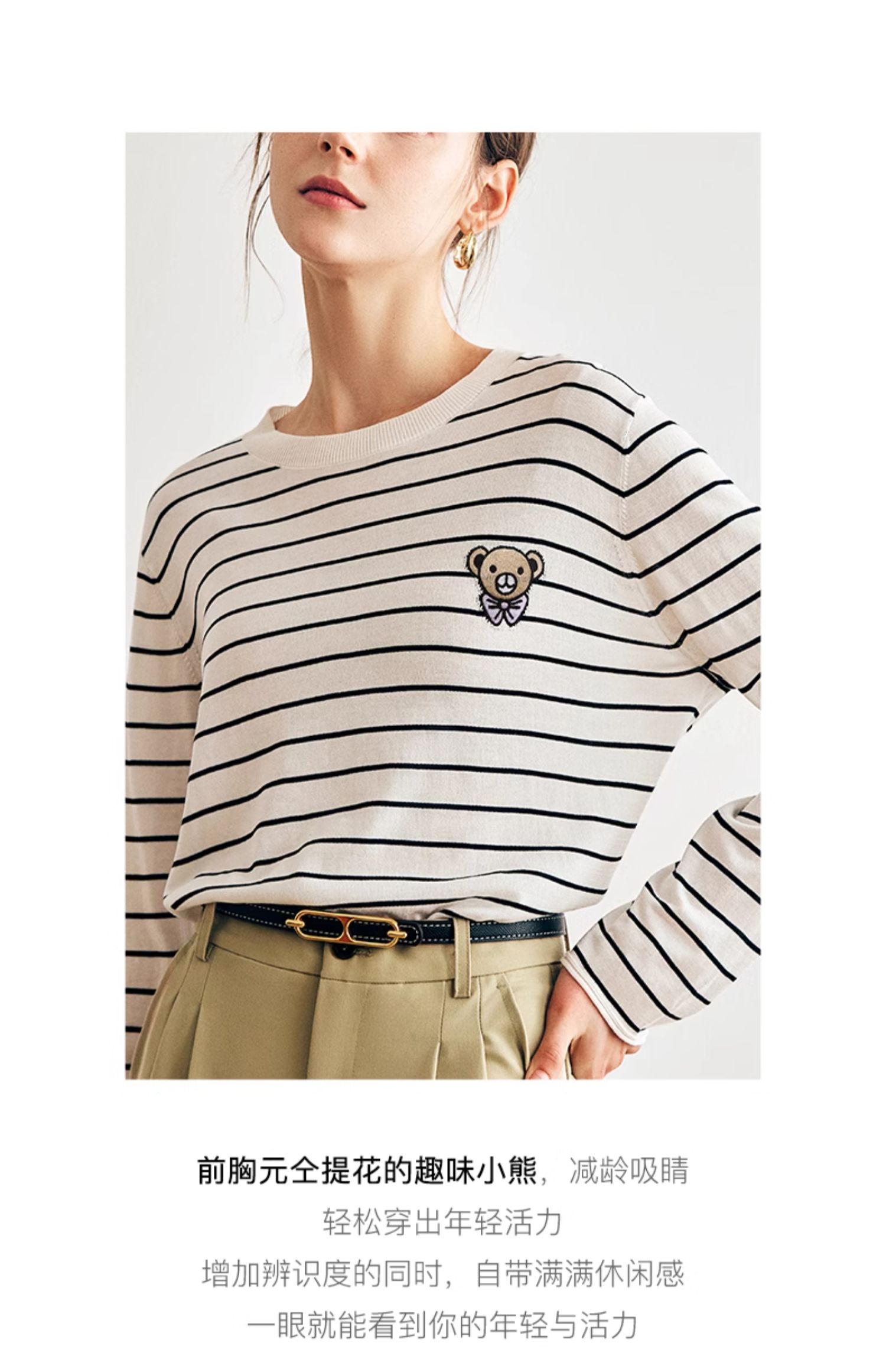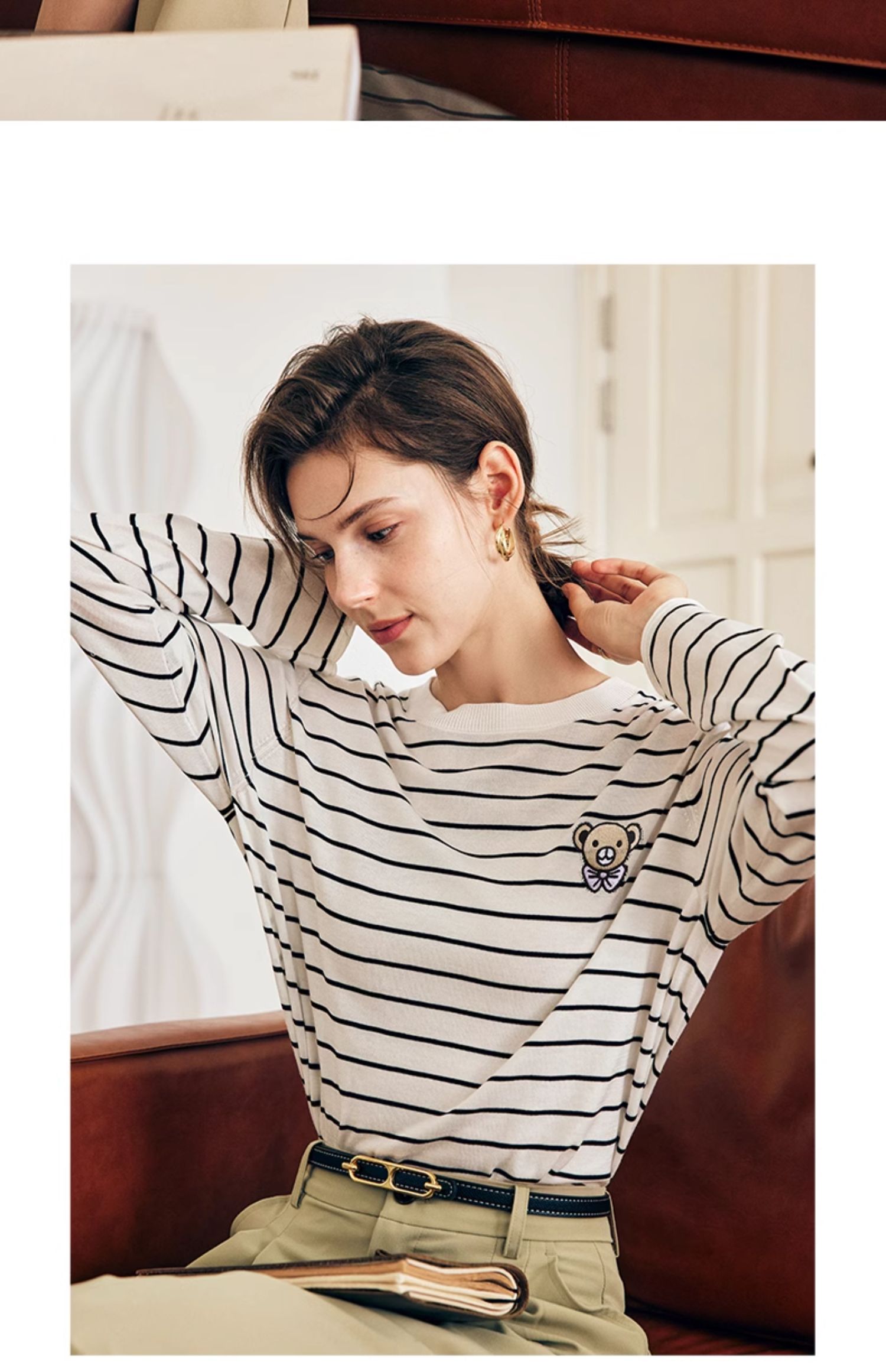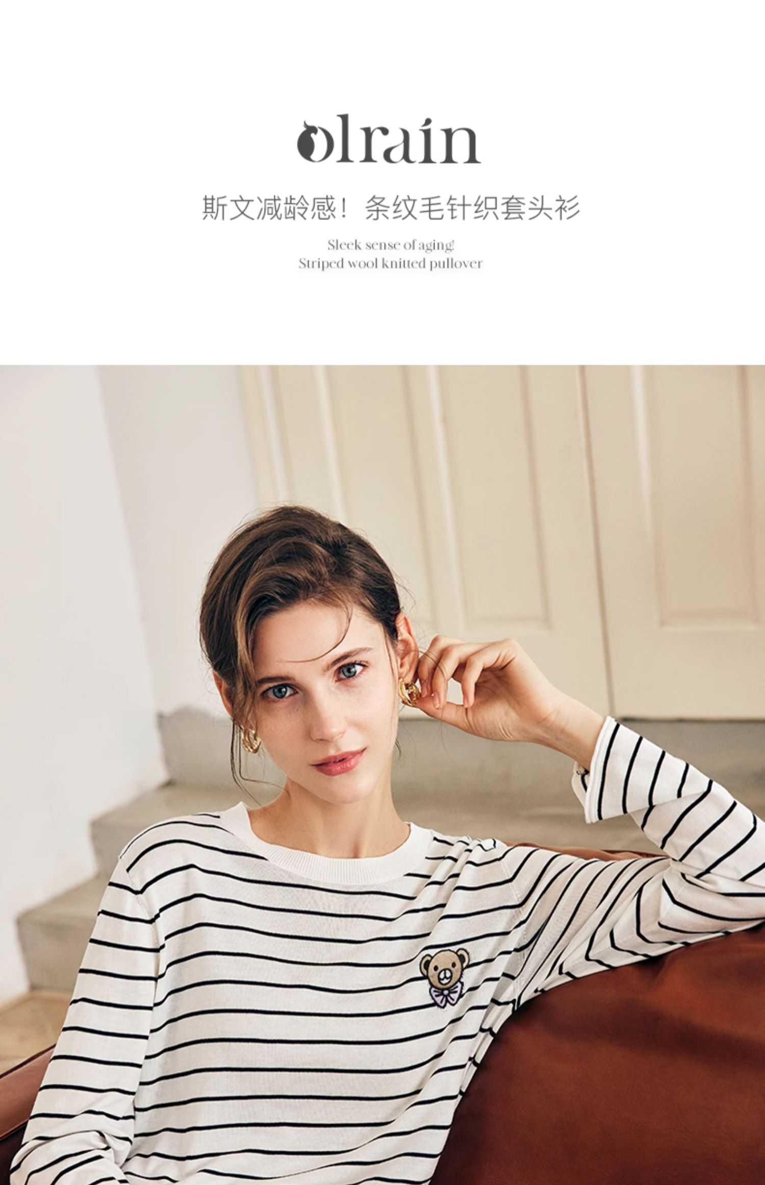 OLrain欧芮儿法式条纹针织衫女秋季2024年新款宽松丝光棉打底上衣