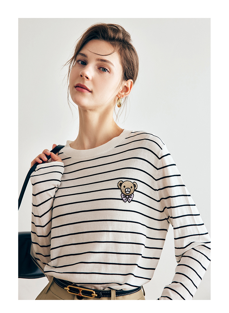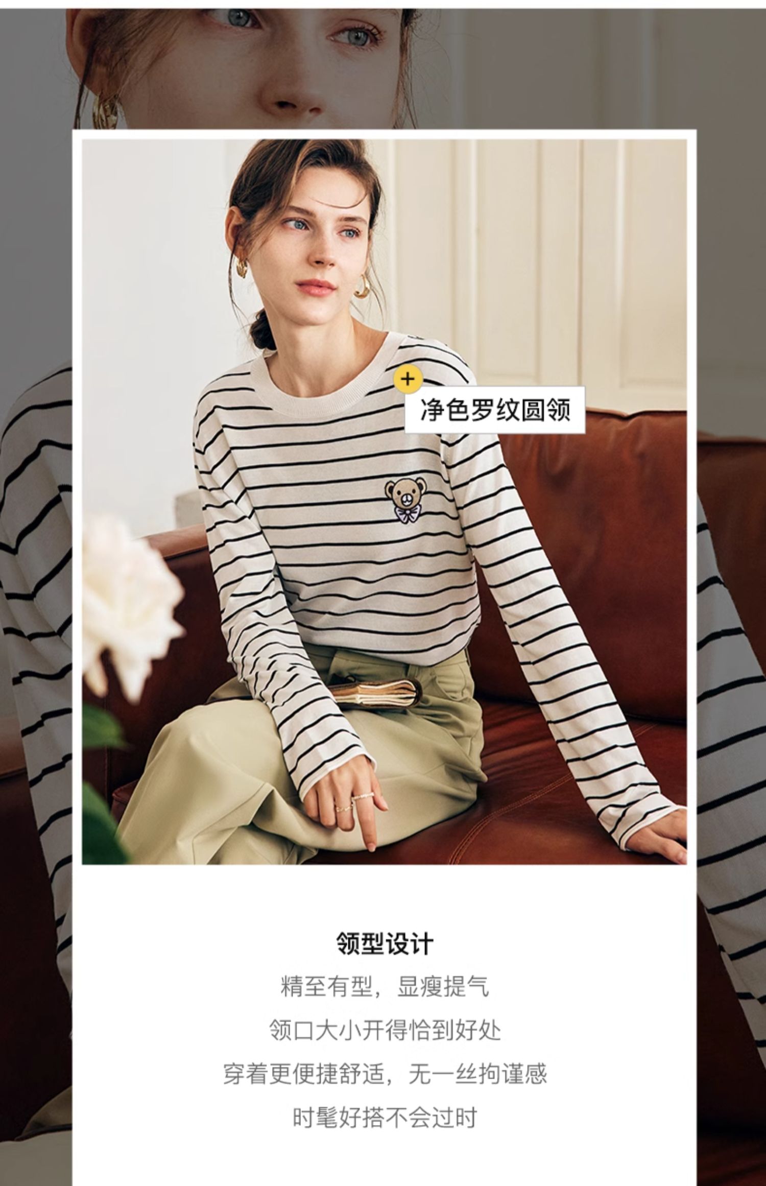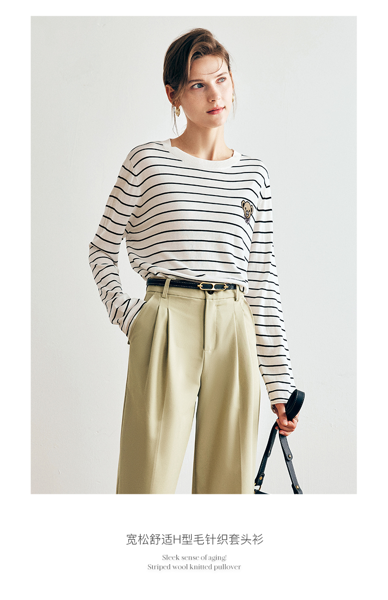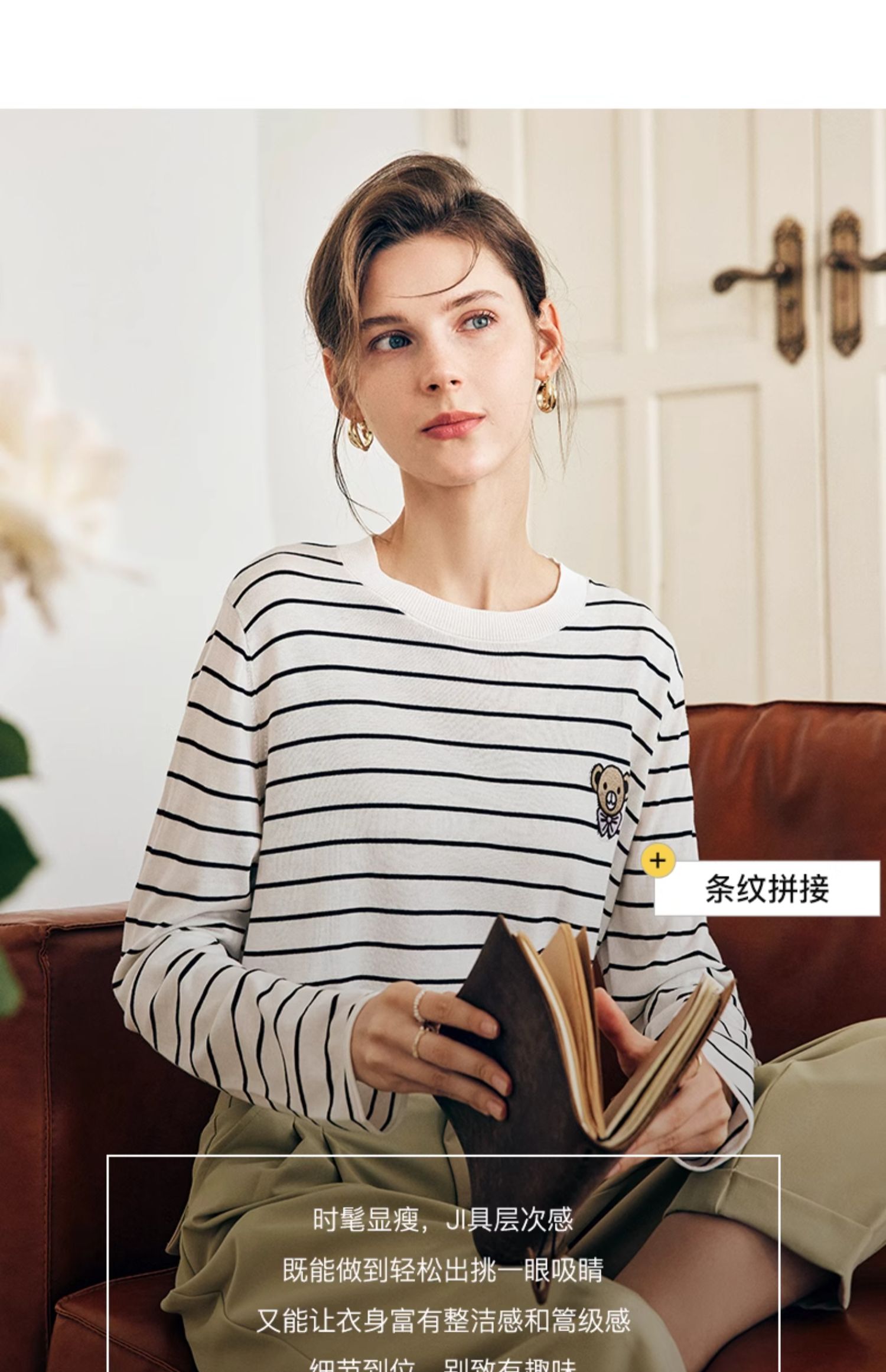 OLrain欧芮儿法式条纹针织衫女秋季2024年新款宽松丝光棉打底上衣