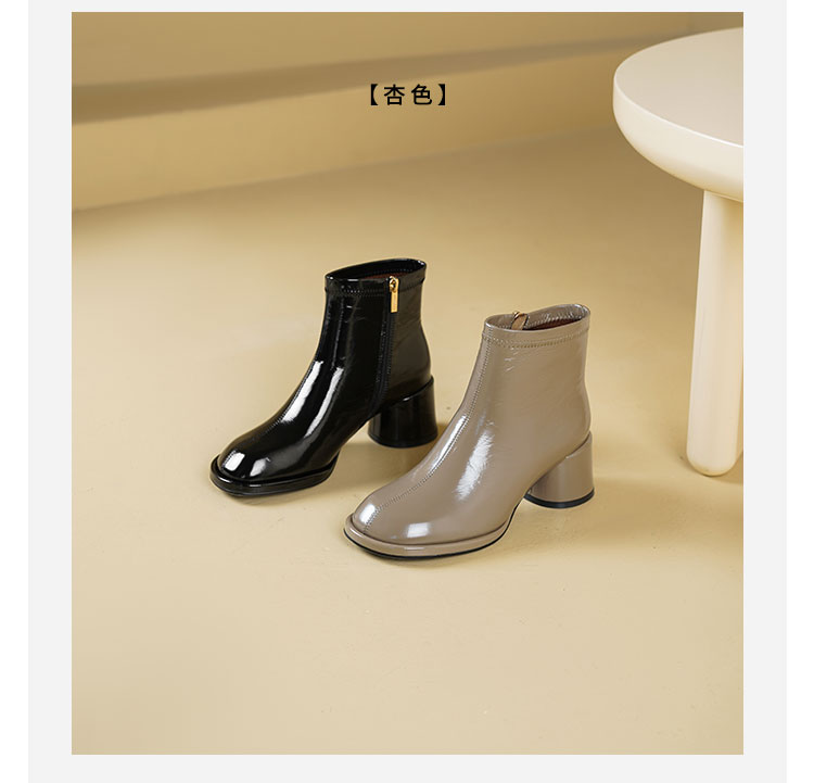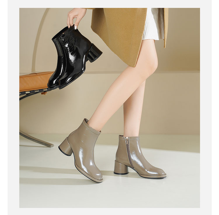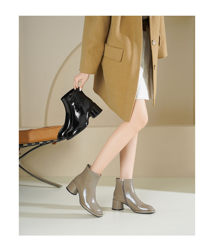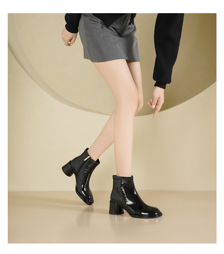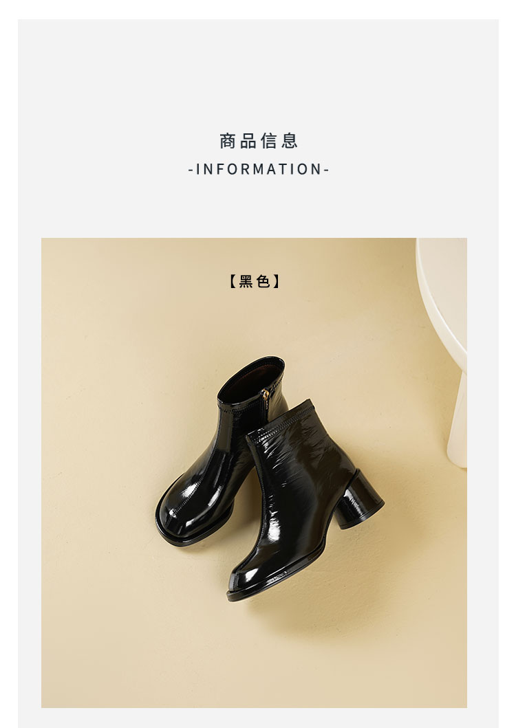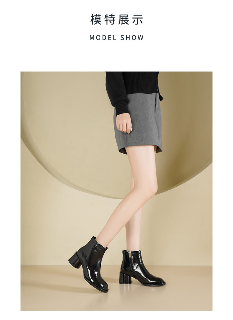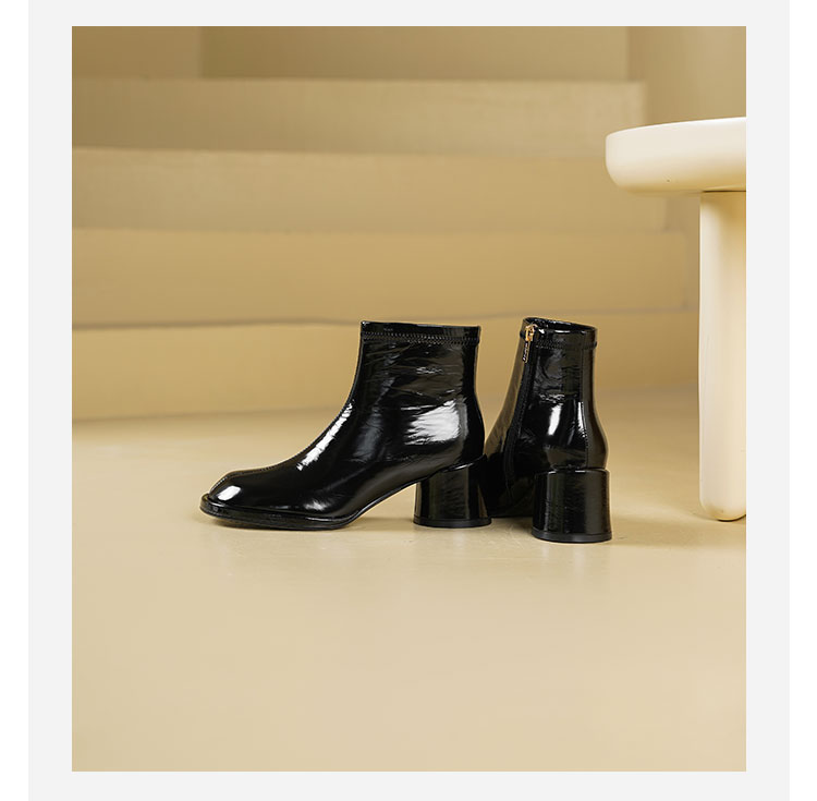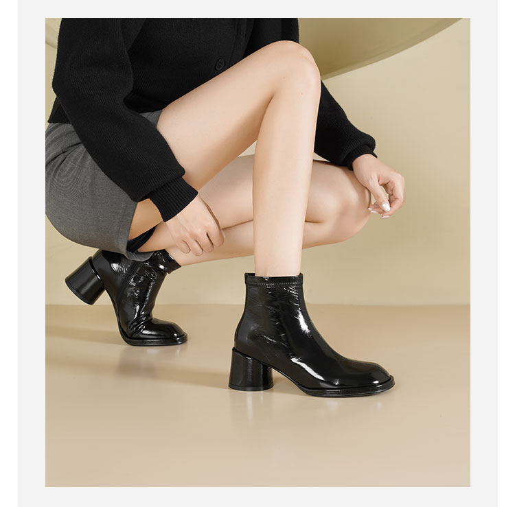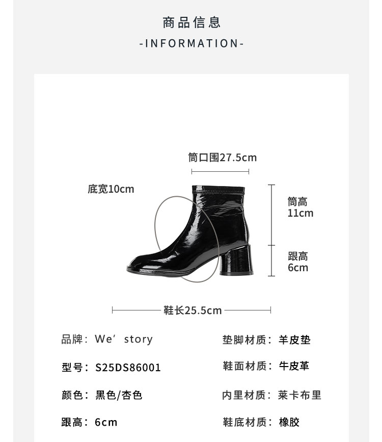 Westory2025年冬季方头中粗跟胎牛漆皮舒适百搭短靴S25DS86001
