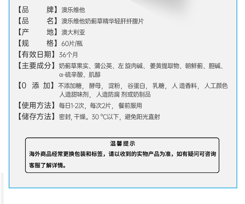 澳洲浓缩奶蓟草精华纤肝片新版60粒/瓶 A-4765 (效期27-1)