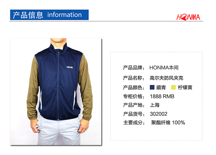 HONMA 高尔夫服装 男士防风夹克 轻薄皮肤外套 HMBC302002