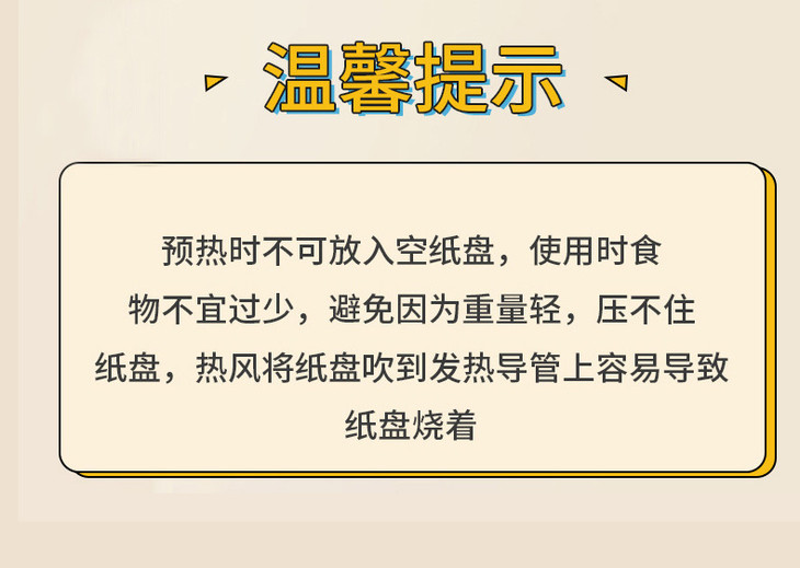 【温馨提示】预热时不可放入空纸盘,使用时食物不宜过少,避免因为重量轻,压不住纸盘,热风将纸盘吹到发热导管上容易导致纸盘烧着