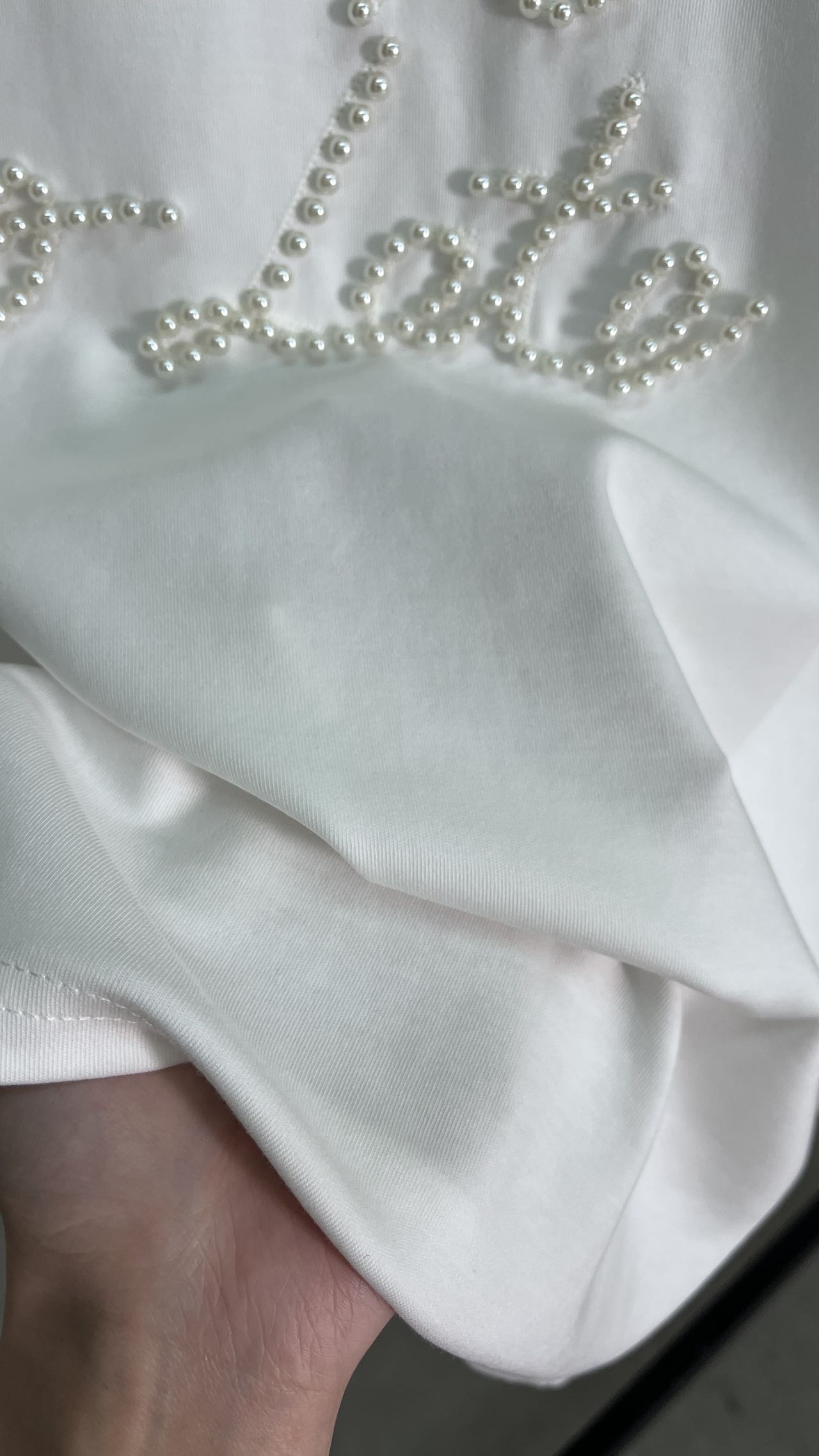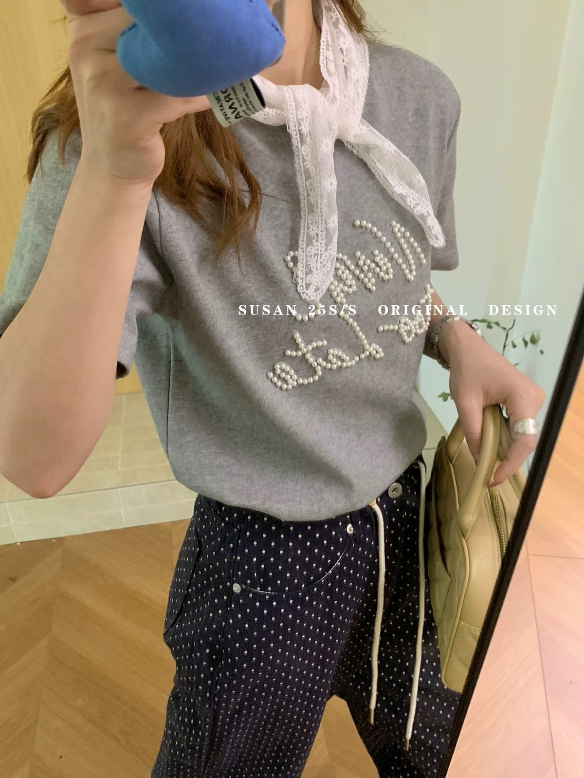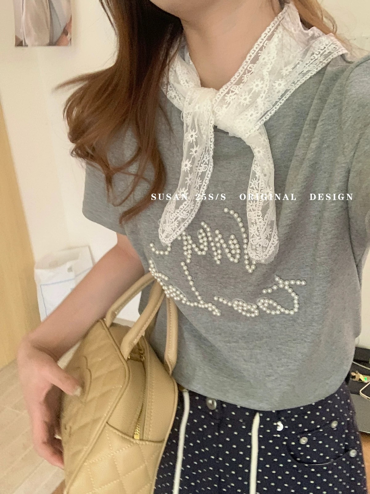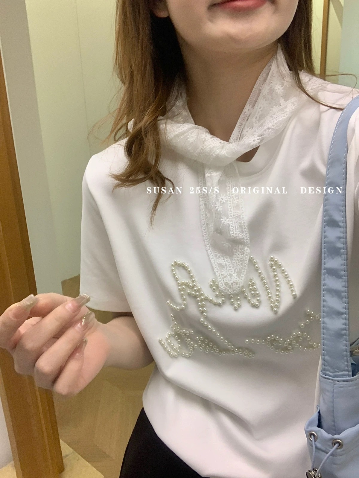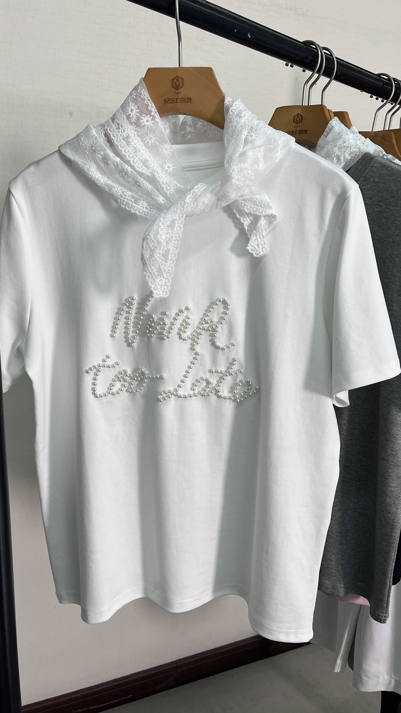 【YW】无忧购韩版ins潮时尚百搭宽松字母订珠短袖T恤配丝巾10013(截单后7天发货)