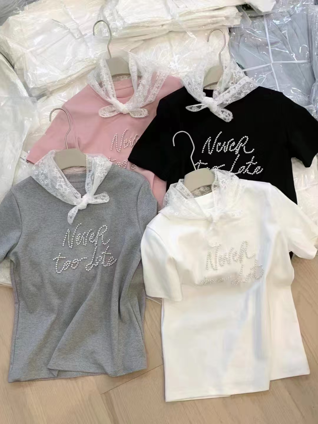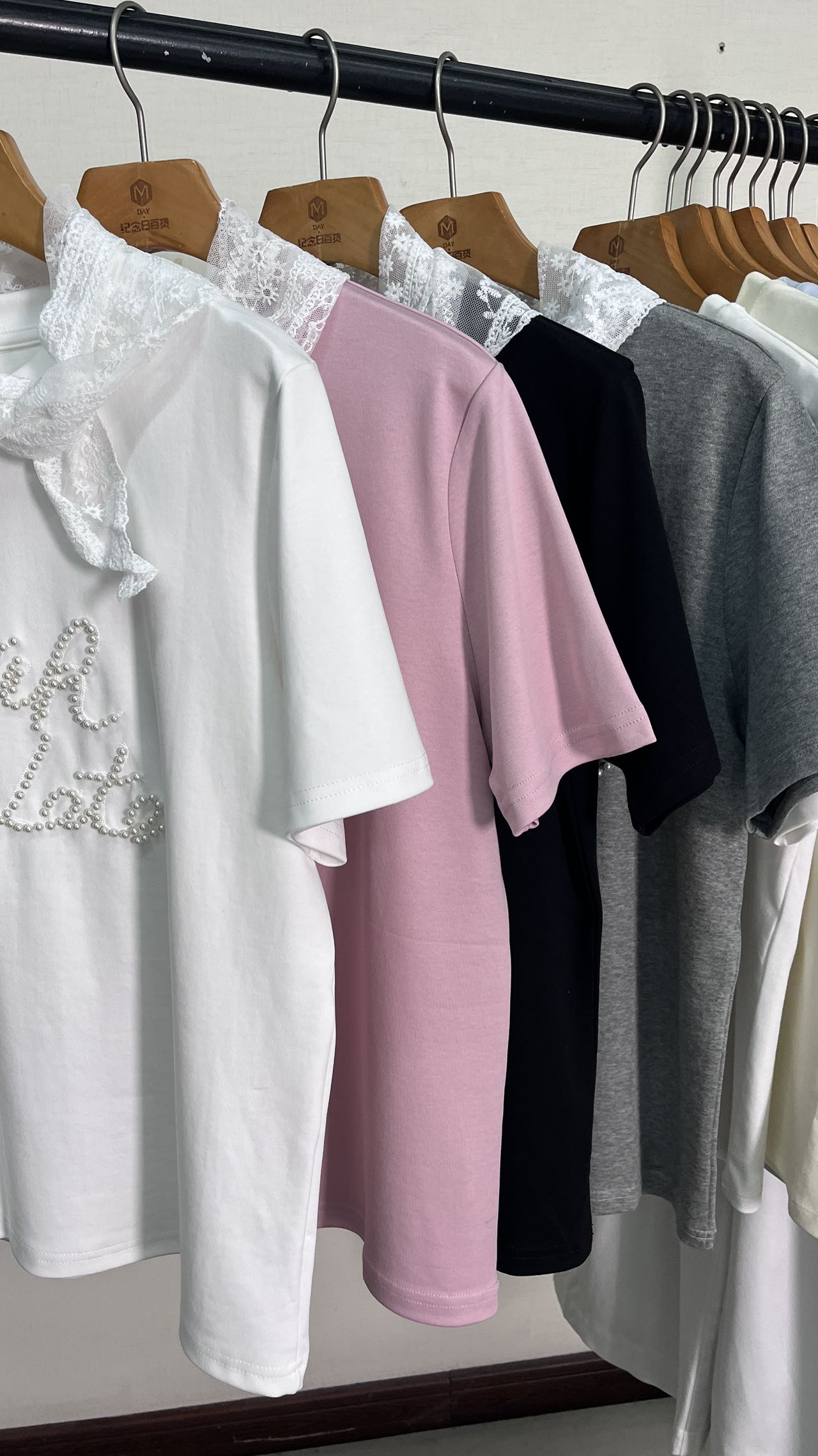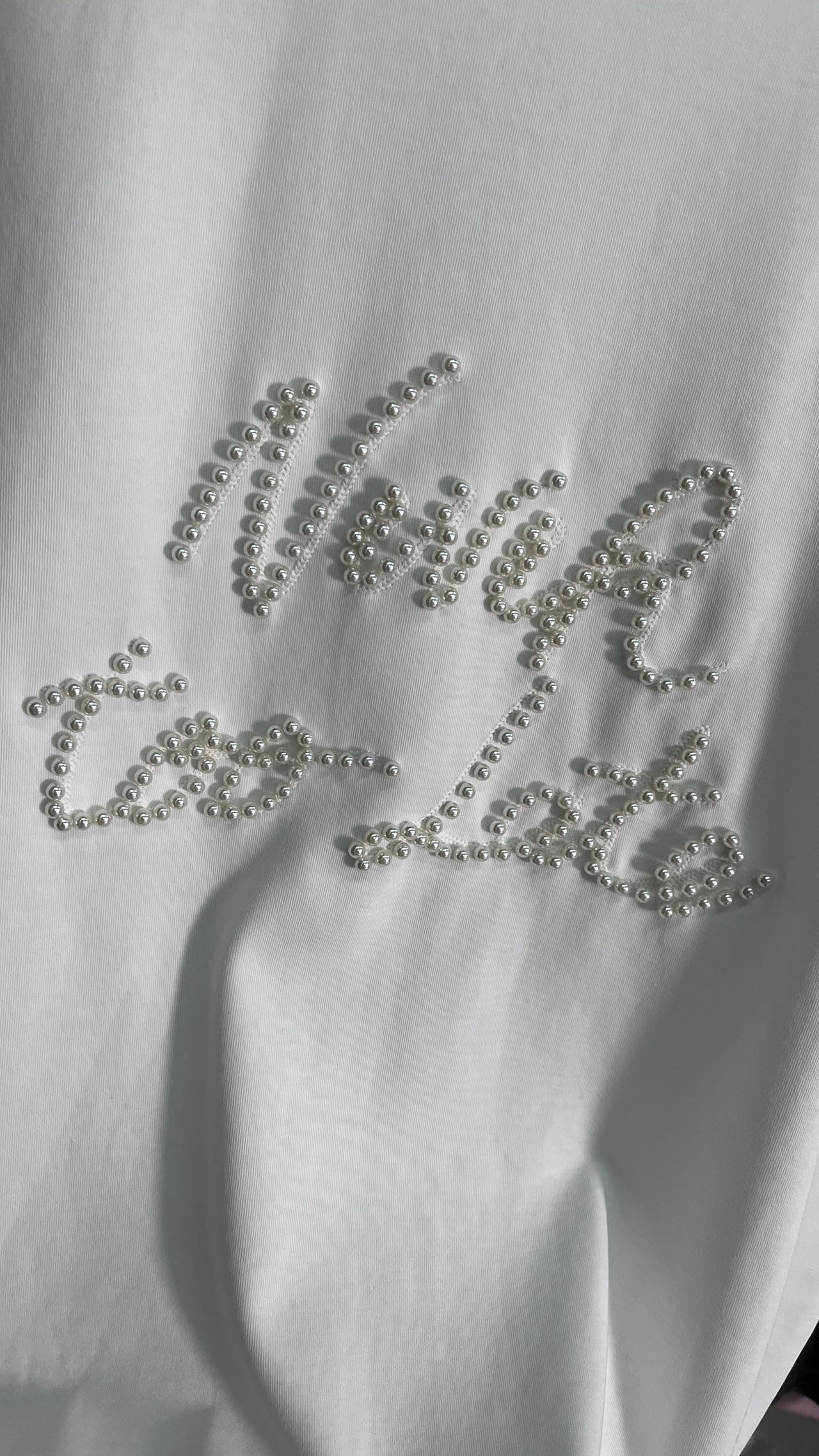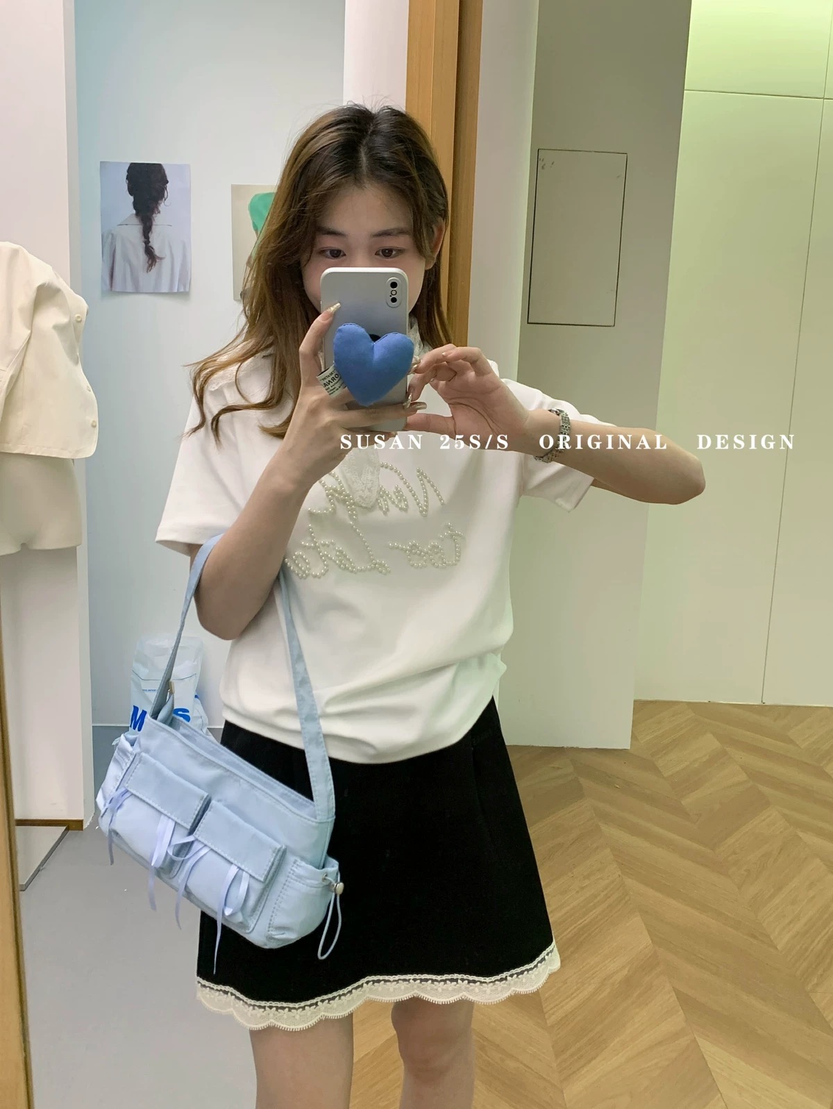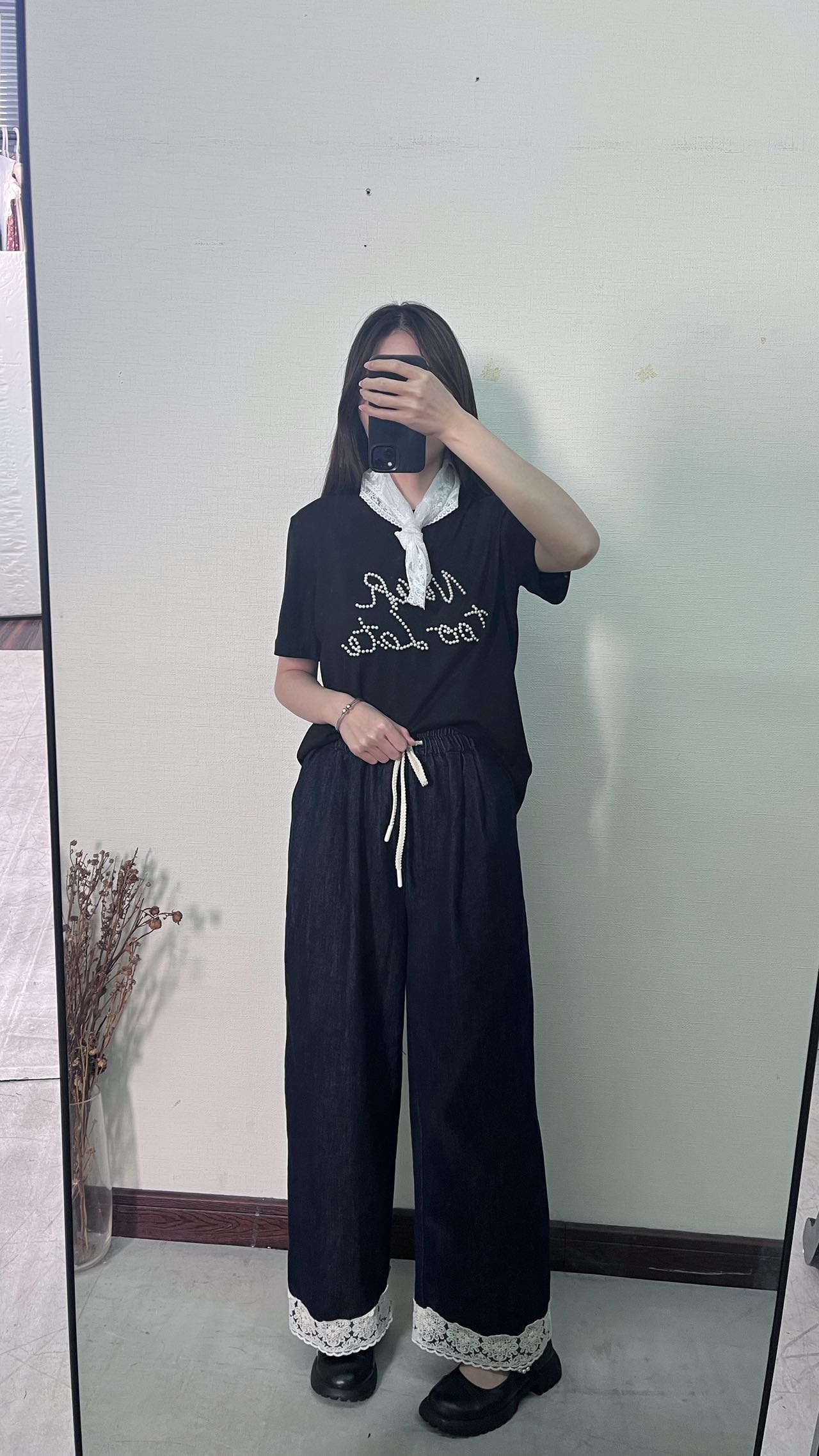 【YW】无忧购韩版ins潮时尚百搭宽松字母订珠短袖T恤配丝巾10013(截单后7天发货)