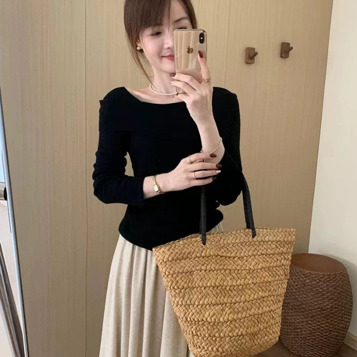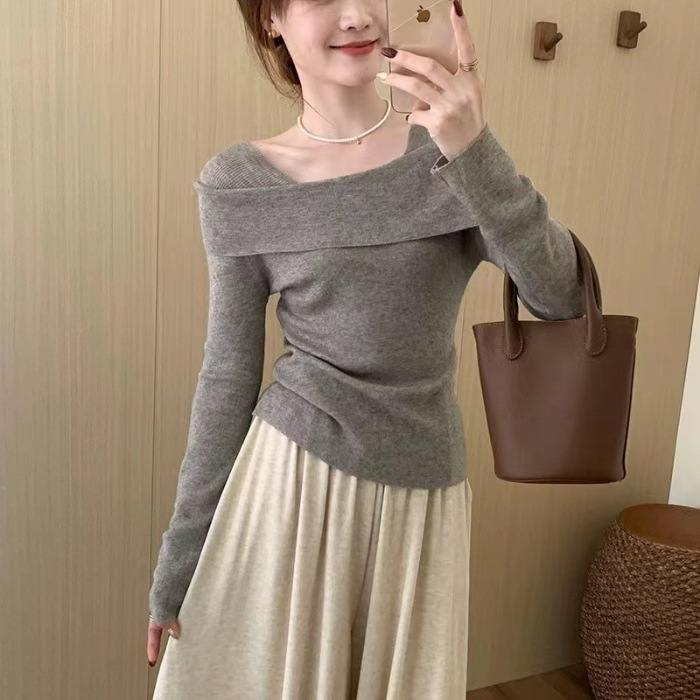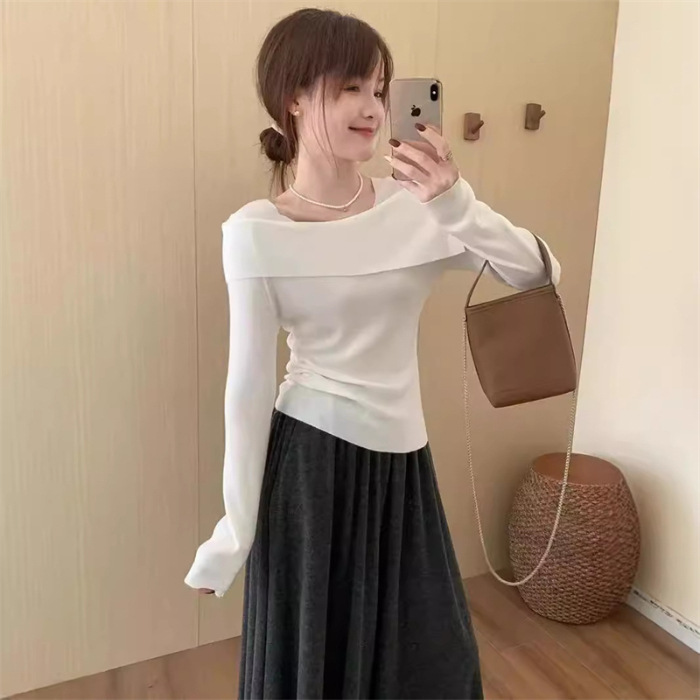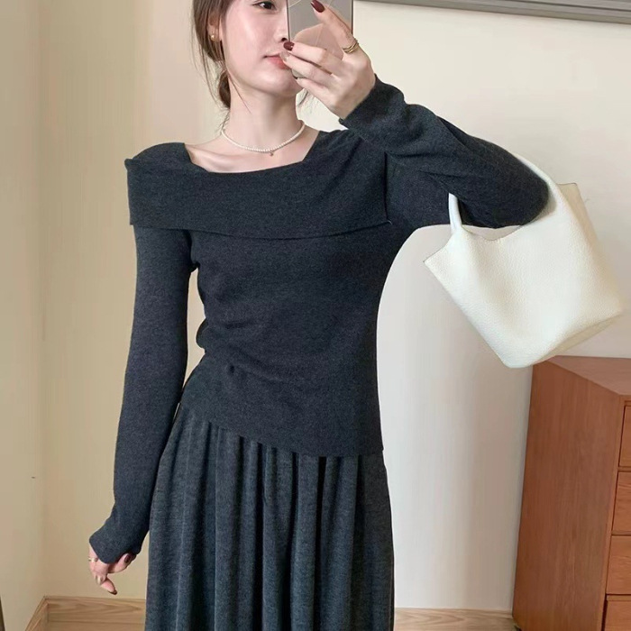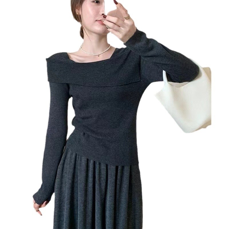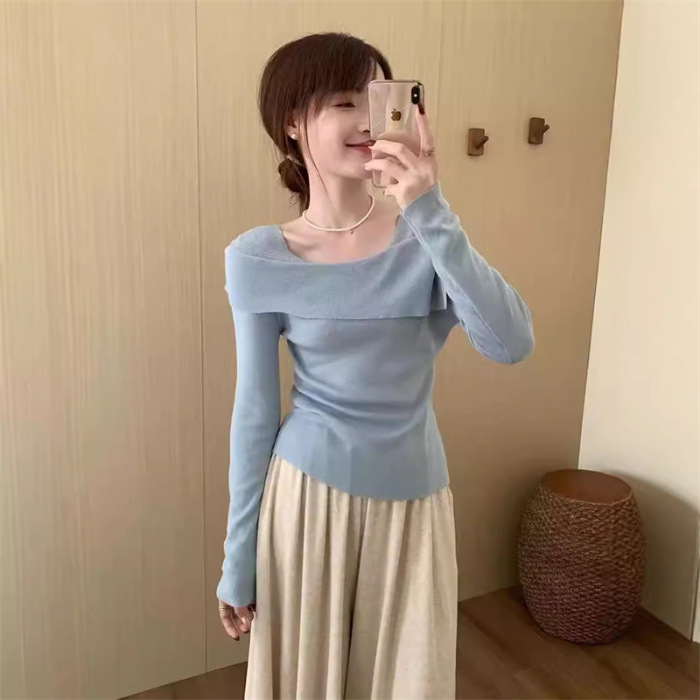 【一字肩假两件淑女上衣】秋冬新款 甜美气质韩版百搭修身显瘦针织衫