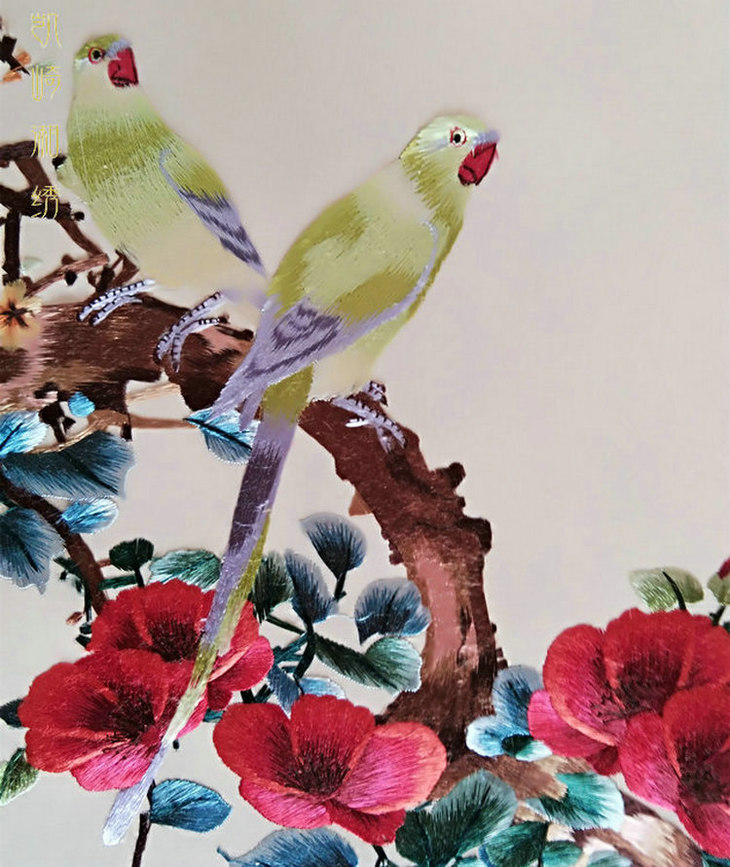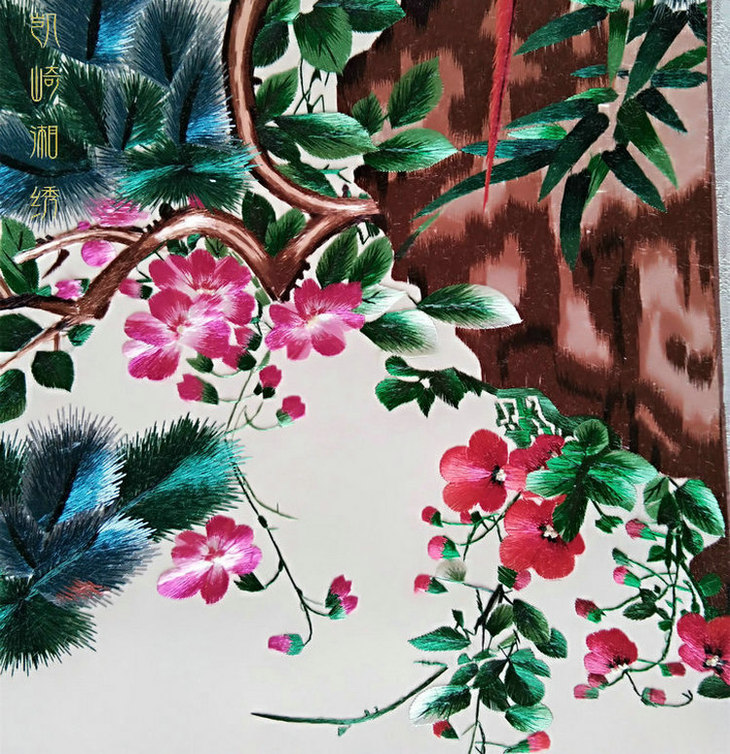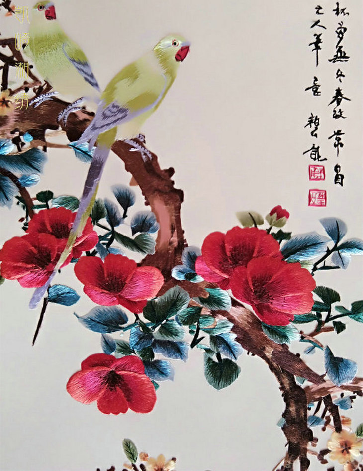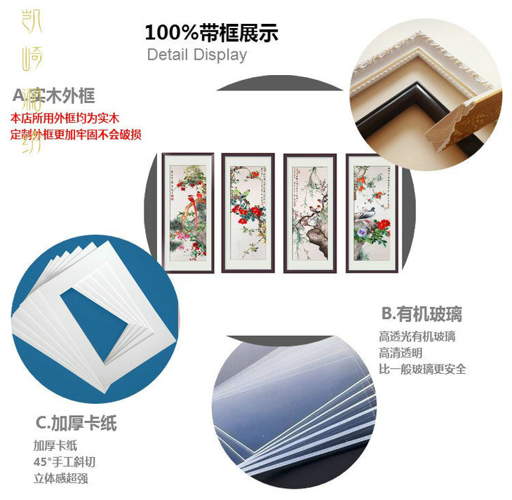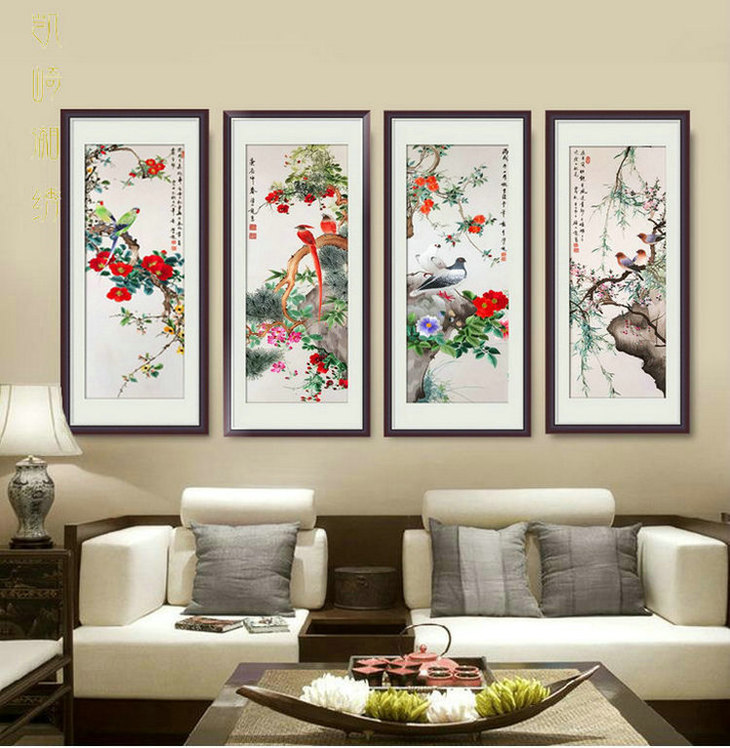 凯崎湘绣 四季花鸟四幅条屏精品刺绣 客厅挂画装饰画 颜伯龙花鸟四联白色错针绣 居家装饰书法挂画