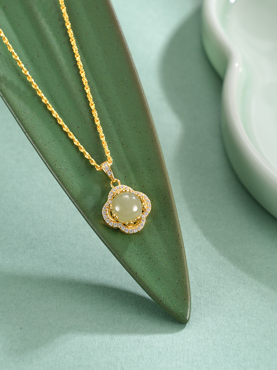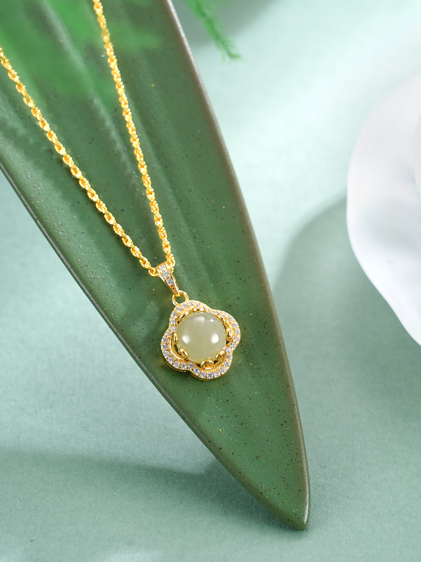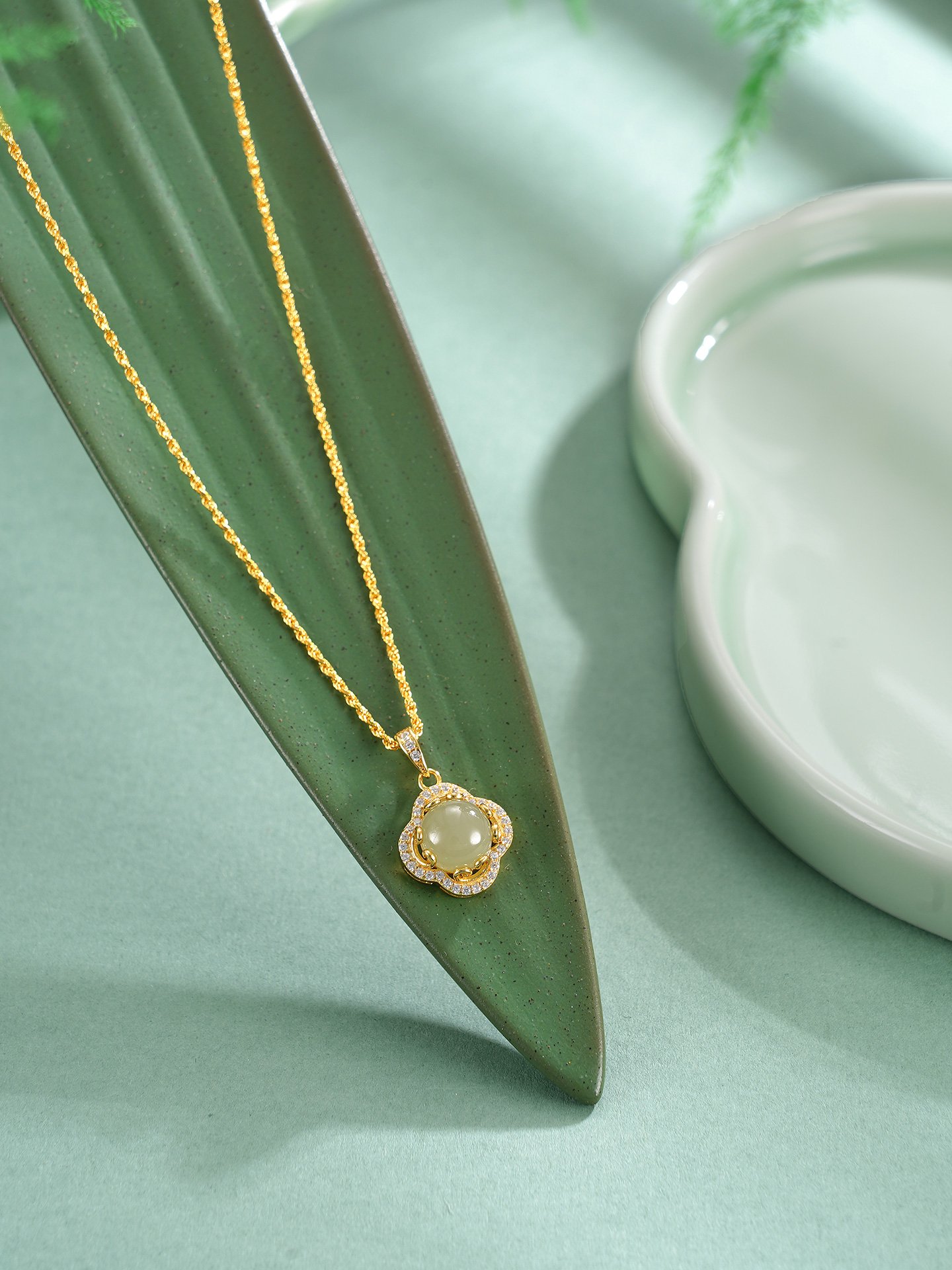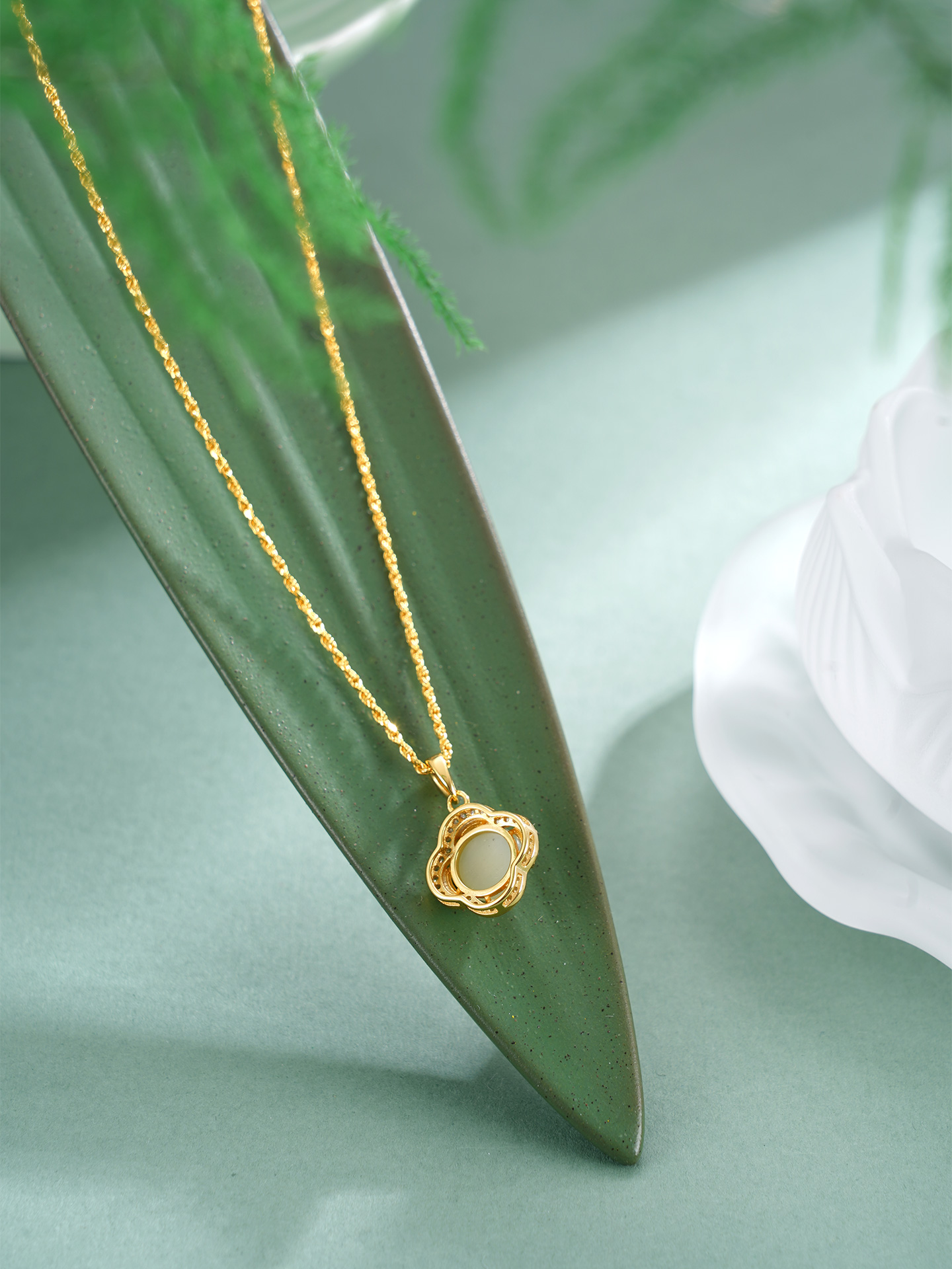 【寓意】:纯银材质勾勒四叶轮廓,和田玉细密镶嵌,其独特光泽与四叶草相称相依。如雪晶莹,如冰澄澈。寓意发光发热,幸运相依。