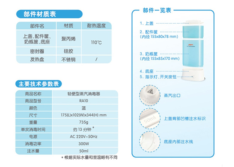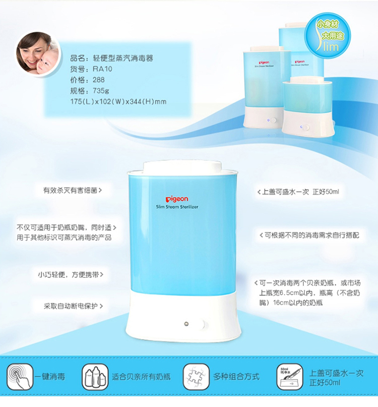 Pigeon贝亲奶瓶消毒器 婴儿消毒锅 宝宝轻便型蒸汽消毒柜 RA10
